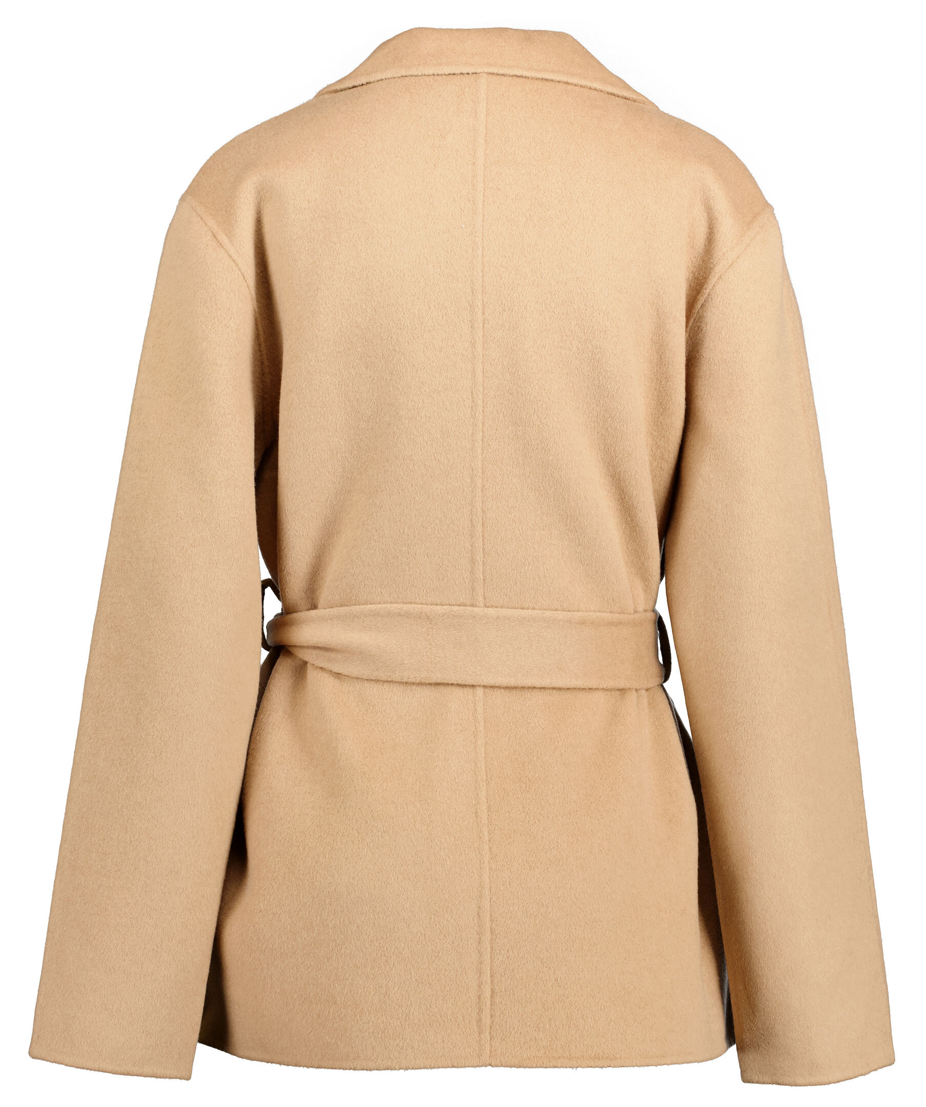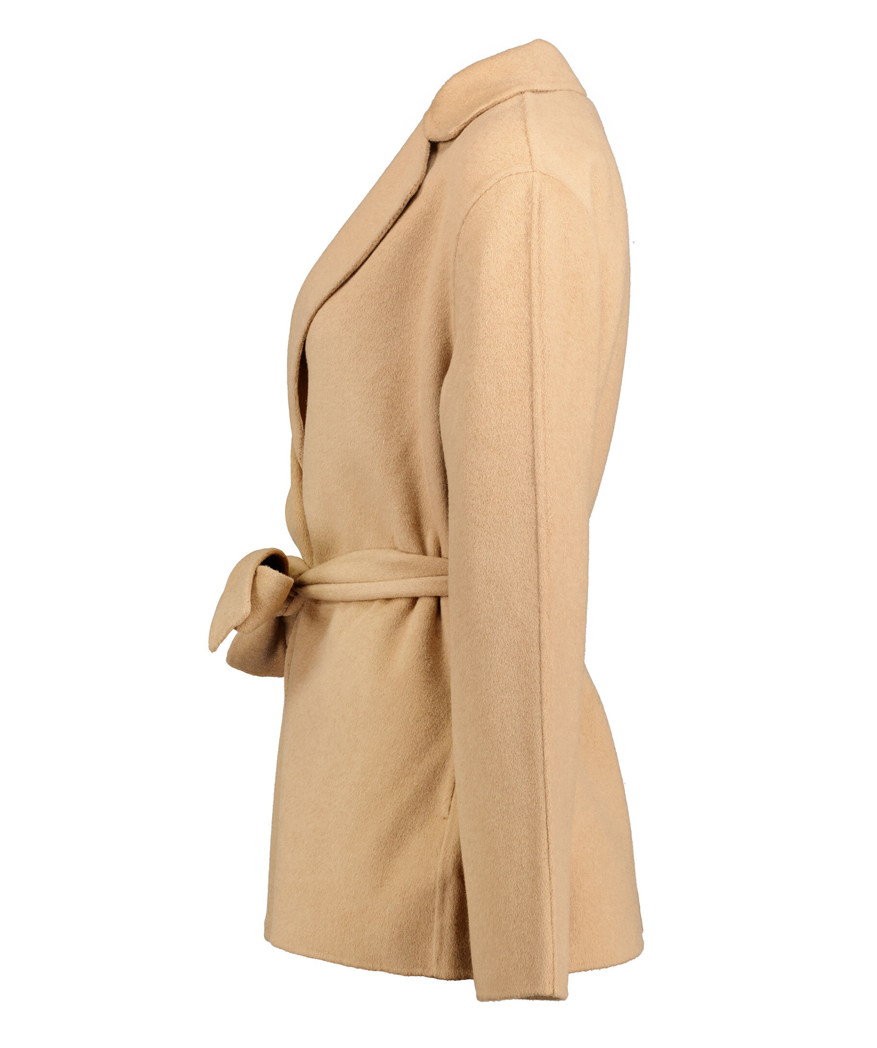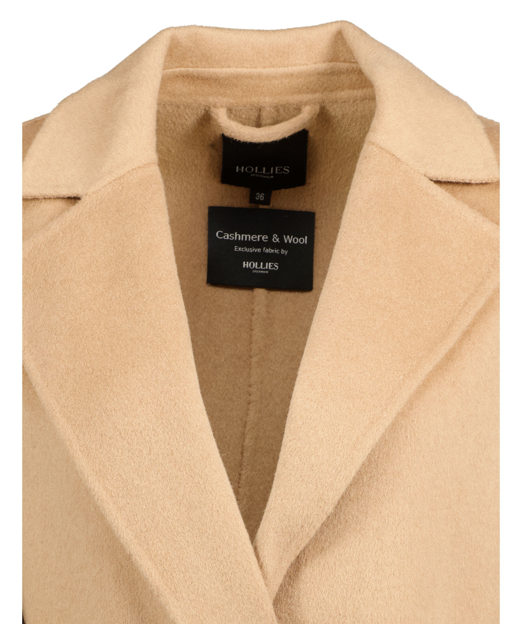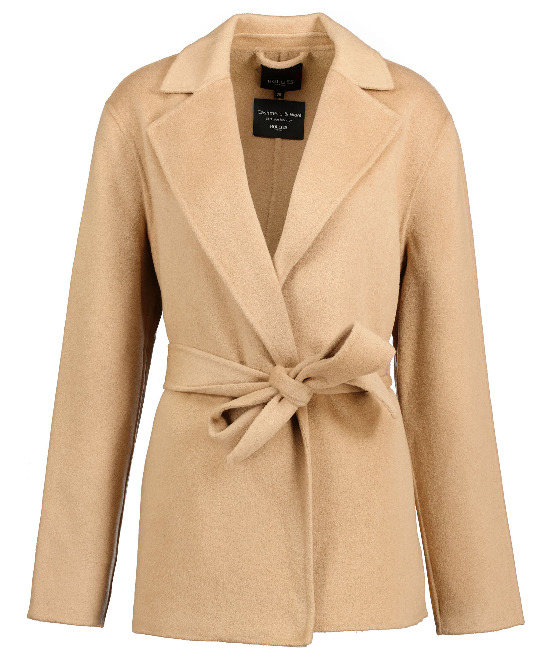 Kamelfärgad kort kappa från Hollies. Gjord i en kashmir och ullblandning. Kappan öppnas och stängs med ett avtagbart bälte i midjan och har två framfickor.