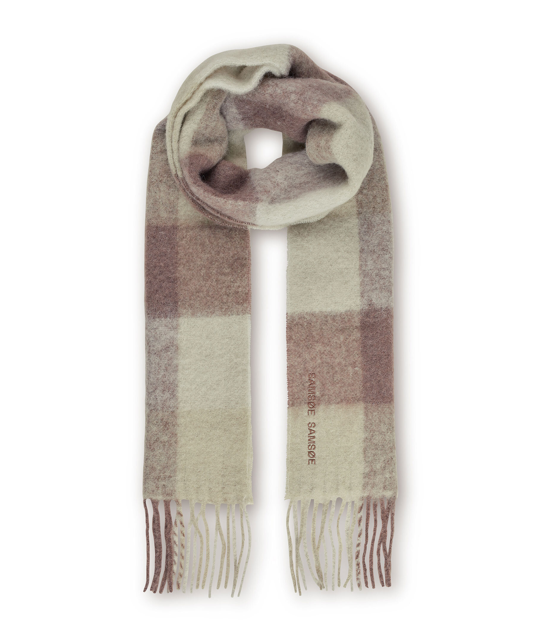 Beige och grågrön, stickad halsduk med fransar från Samsoe Samsoe. Halsduken har broderad logotyp. Tillverkad i en ullblandning.