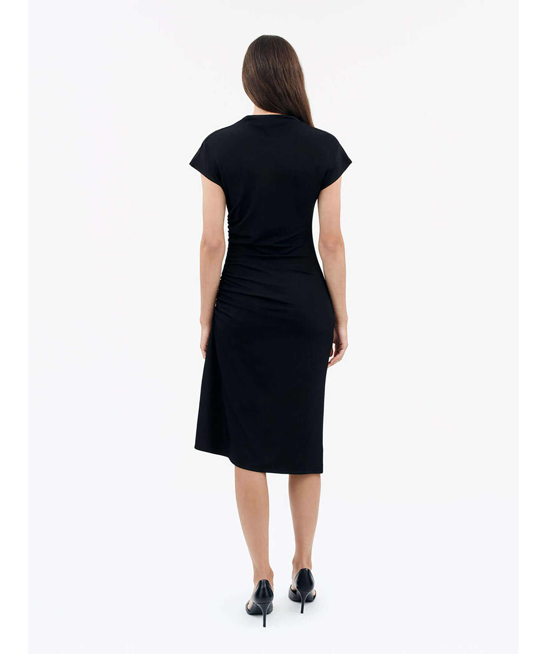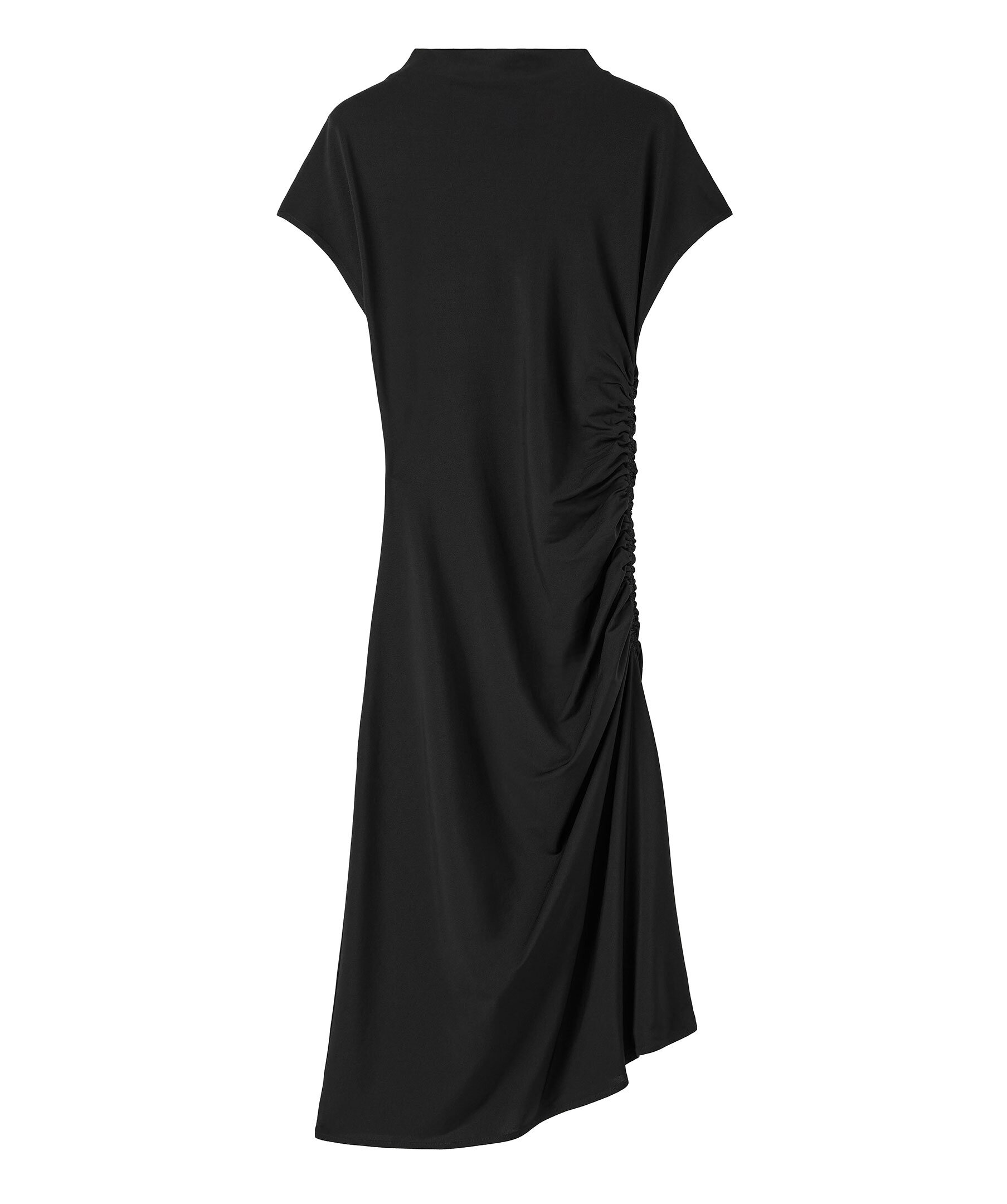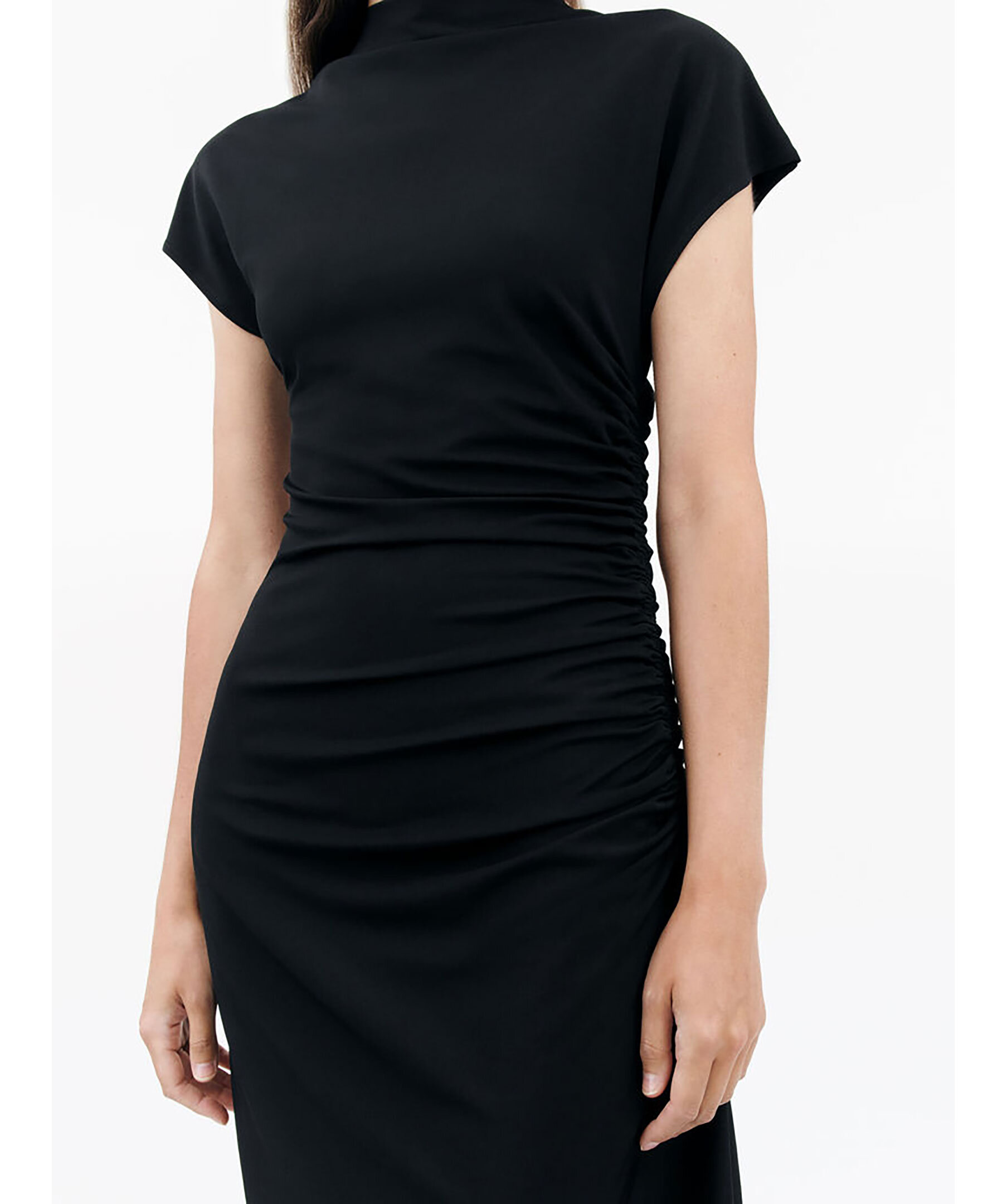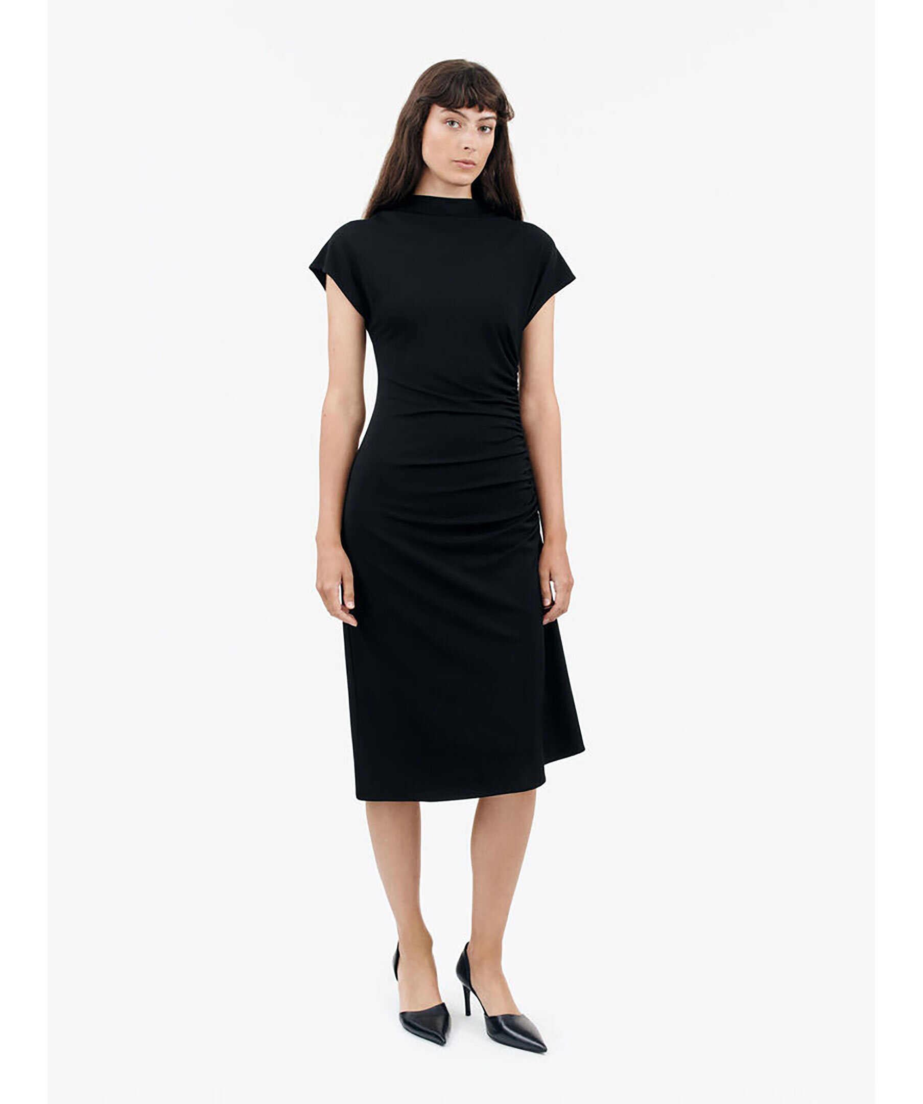 Svart ärmlös klänning från Tiger of Sweden. Klänningen har en smal passform och rynkad sidosöm. Feminin siluett, rynkad sidosöm ger ett draperat uttryck över överkroppen. Klänningen slutar nedanför knäet. Ofodrad och utan stängning, enkelt att ta på sig. Modellen är 175cm lång och har på sig strl 36.