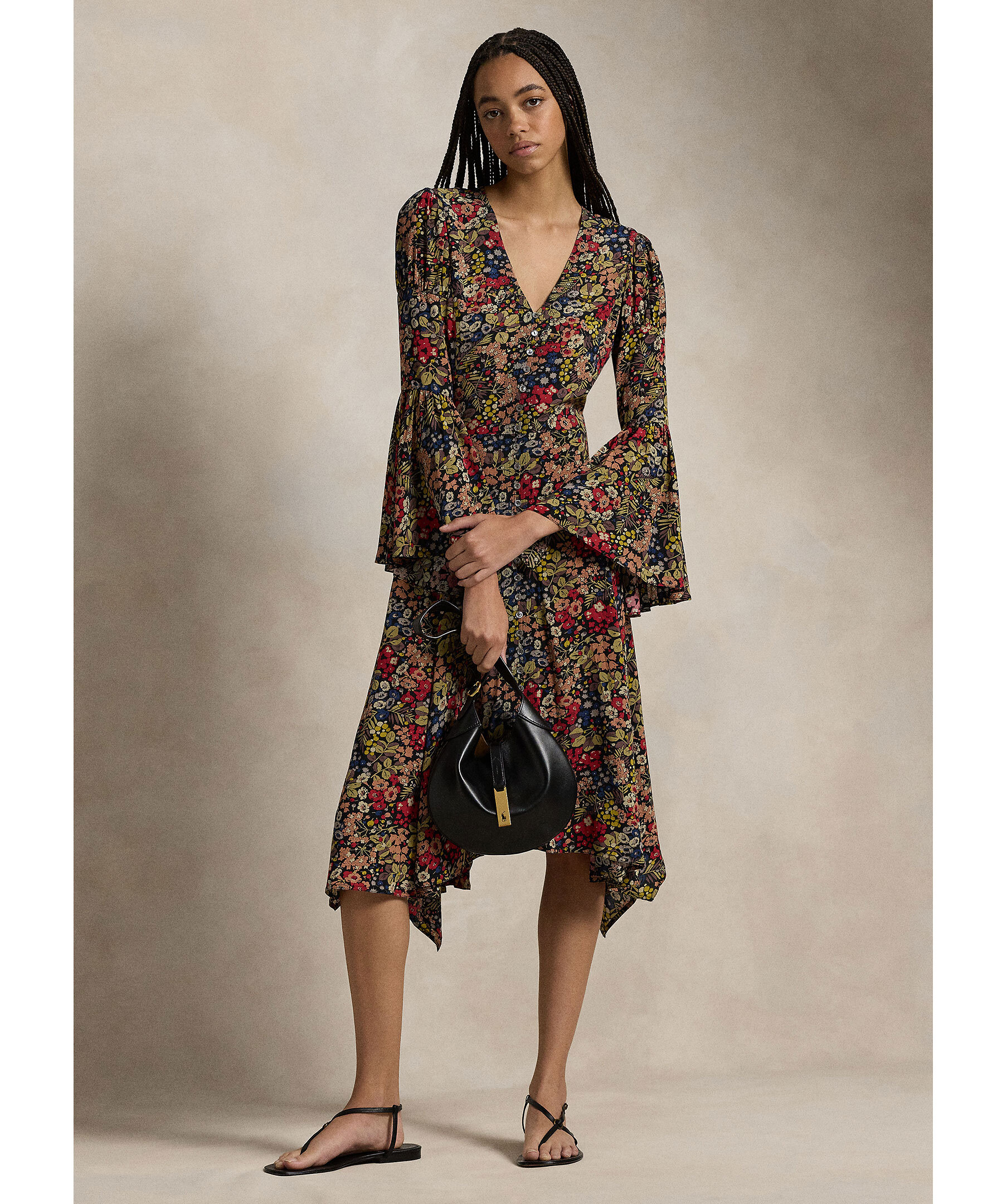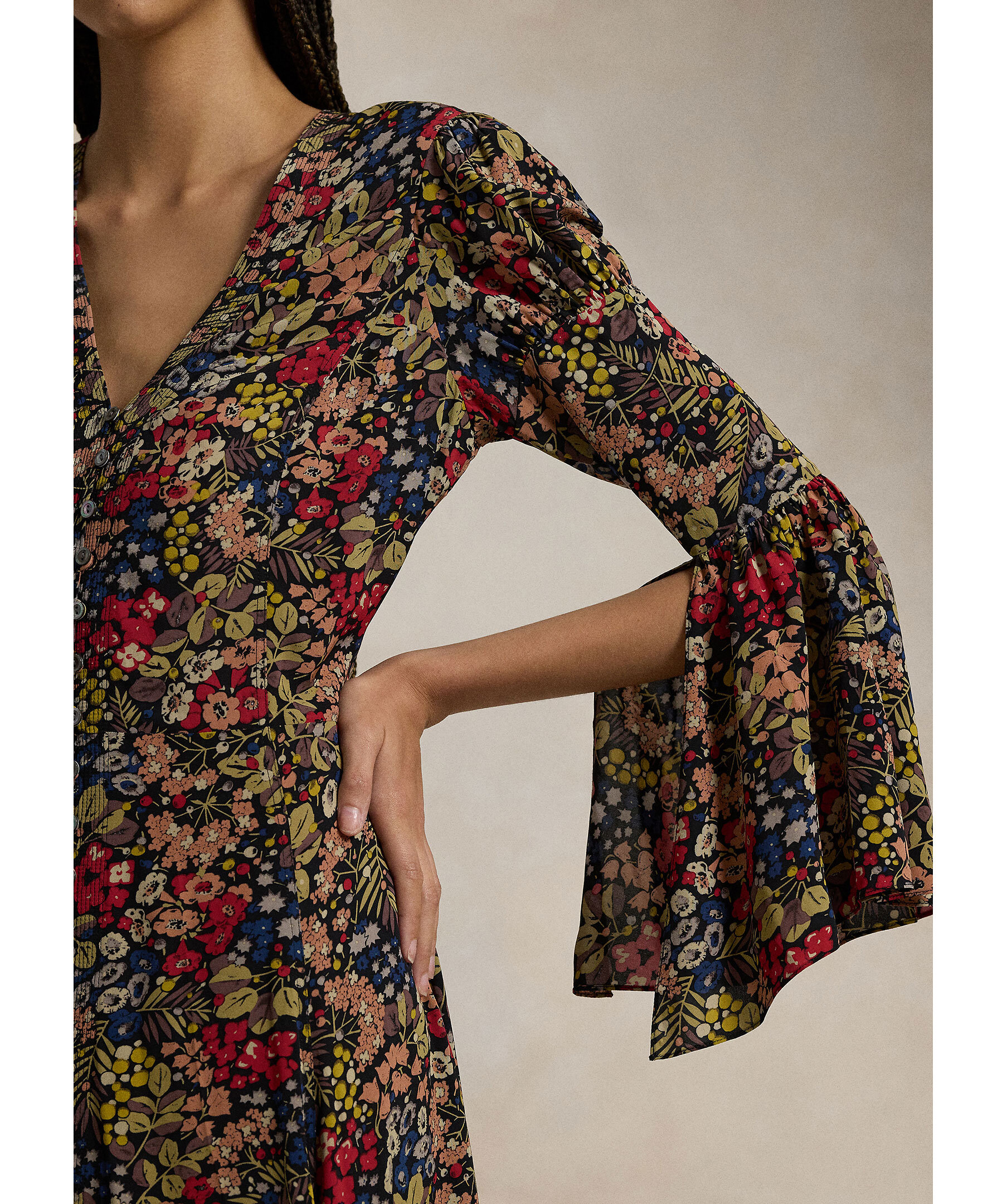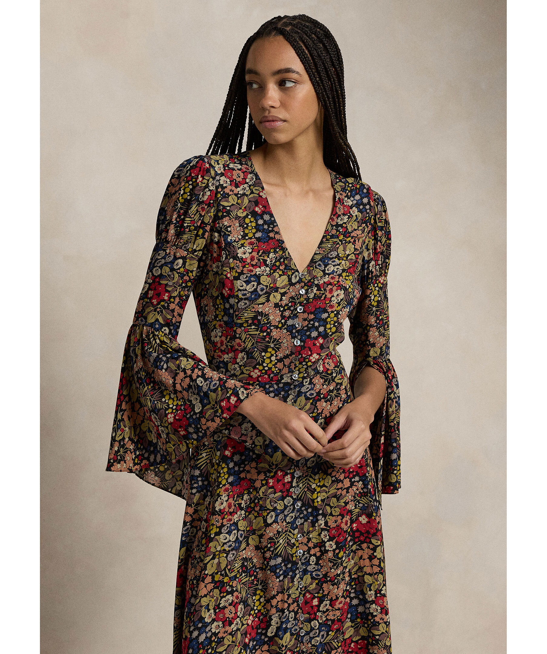 Multifärgad, blommönstrad klänning från Polo Ralph Lauren. Klänningen har v-ringad hals, knappar framtill, puffiga axlar, långa, vida ärmar med slitsar. Klänningen slutar vid knäna och har dragkedja i ena sidan. Tillverkad i viskos.