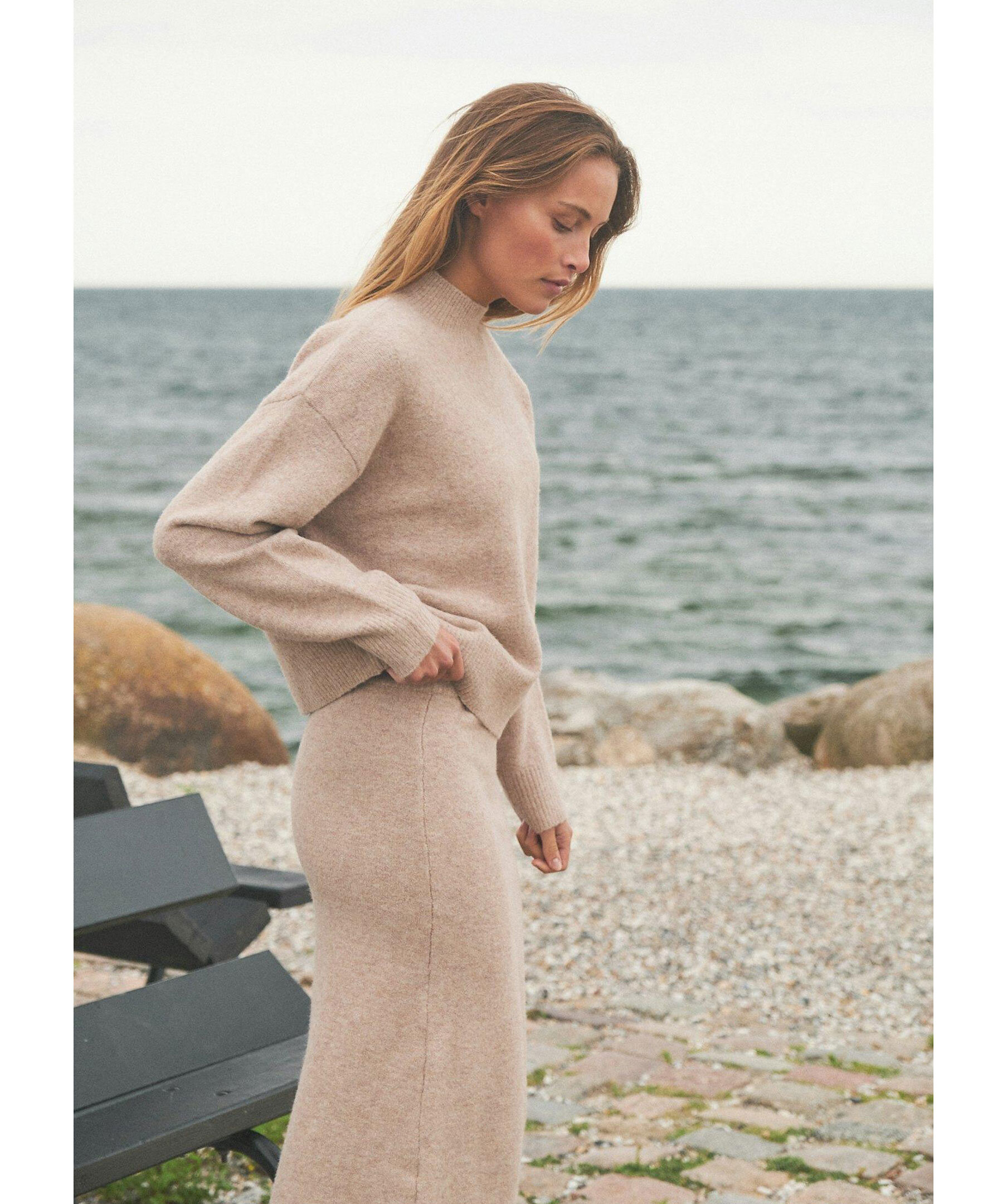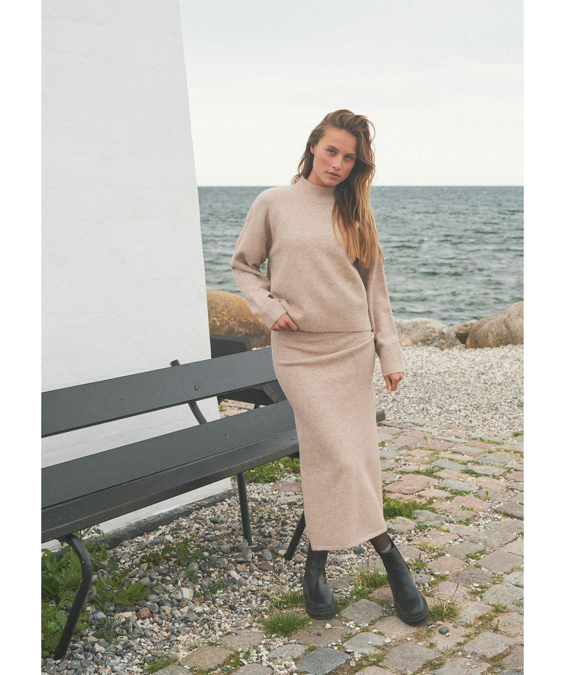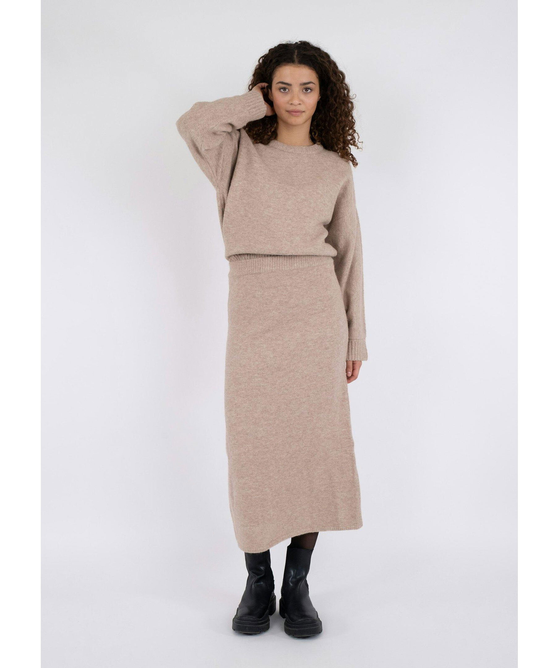 Beige, stickad lång, kjol från Neo Noir. Kjolen har en ribbstickad, elastisk midja och är tillverkad i en ull- och polyesterblandning.