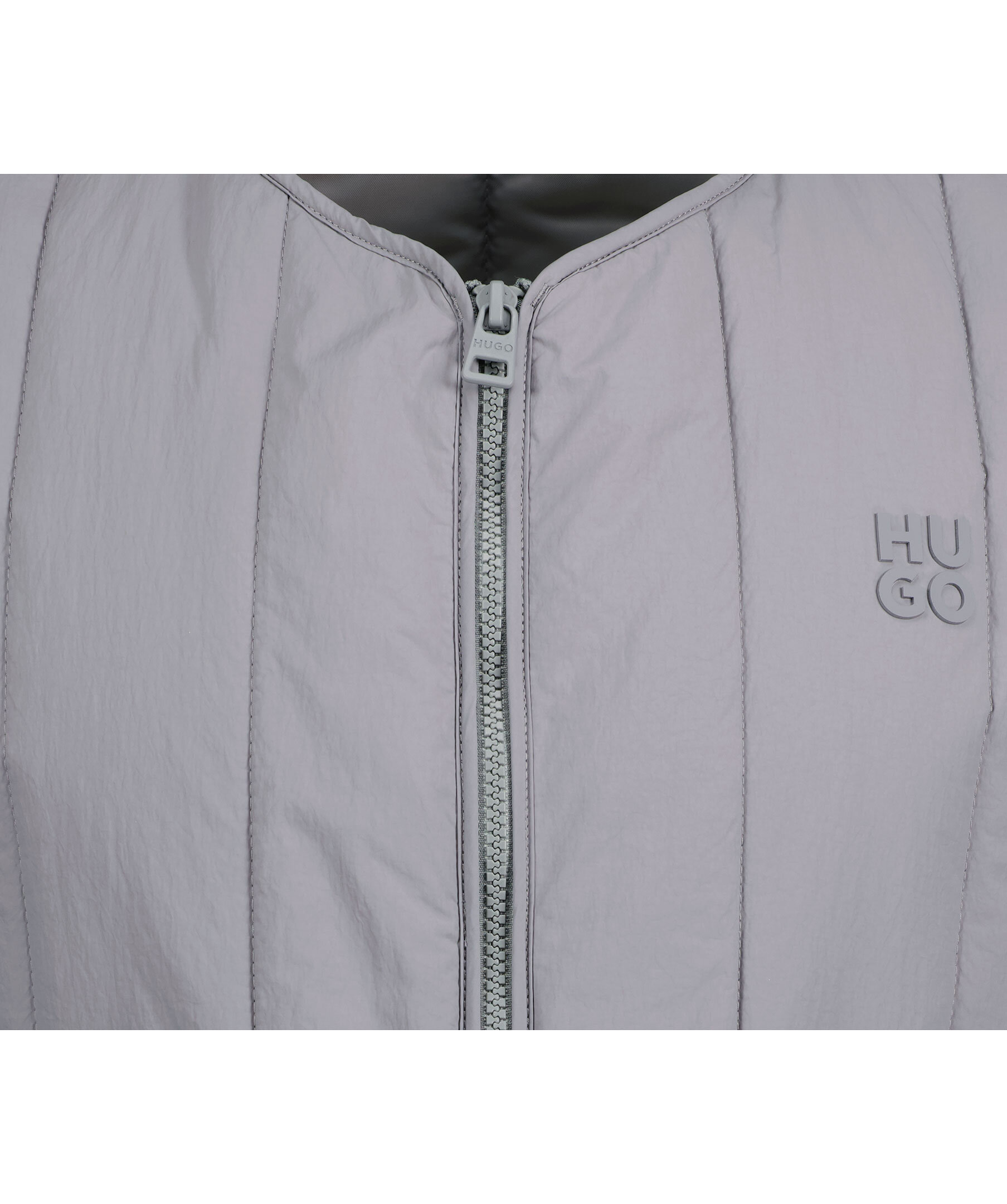 Grå väst tillverkad av 100 % återvunnen polyamid från HUGO. Quiltad struktur, rundad hals och dubbel dragkedja. Två framfickorna med dold tryckknapp samt en innerficka. Justerbart elastiskt band i midjan och gummerad logotyp på bröstet.