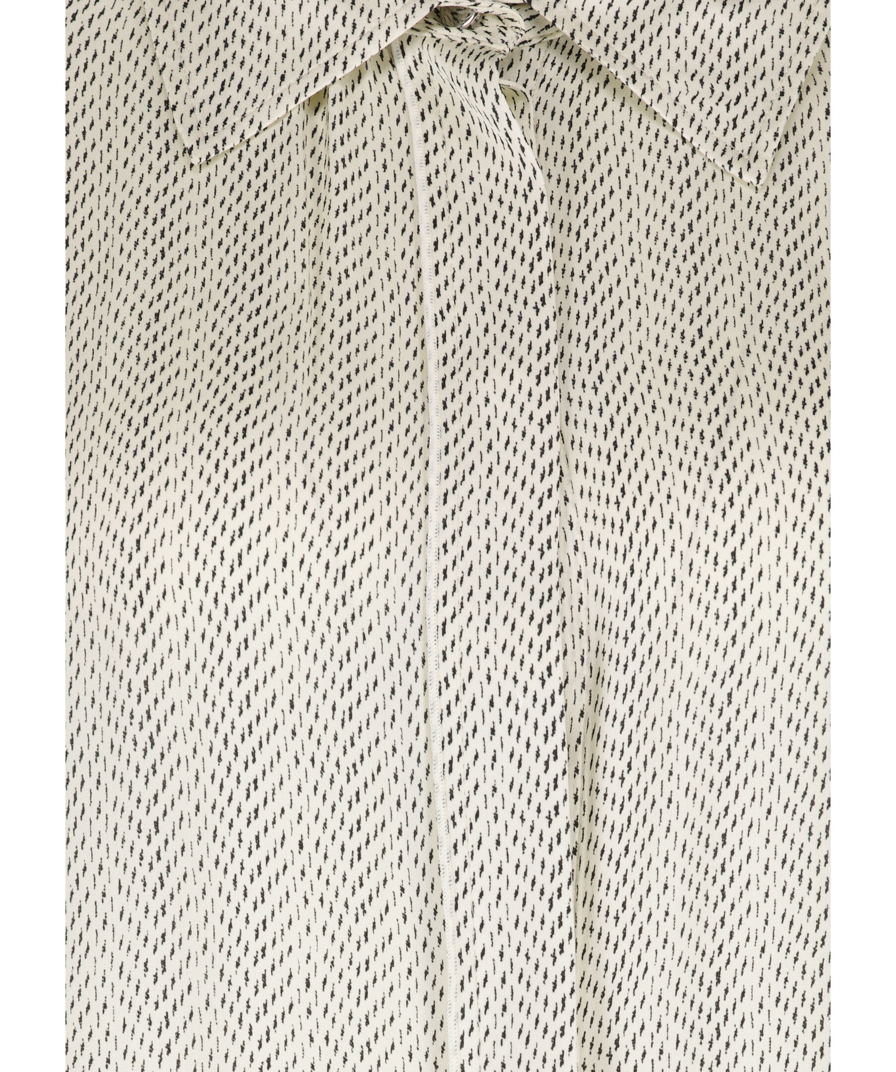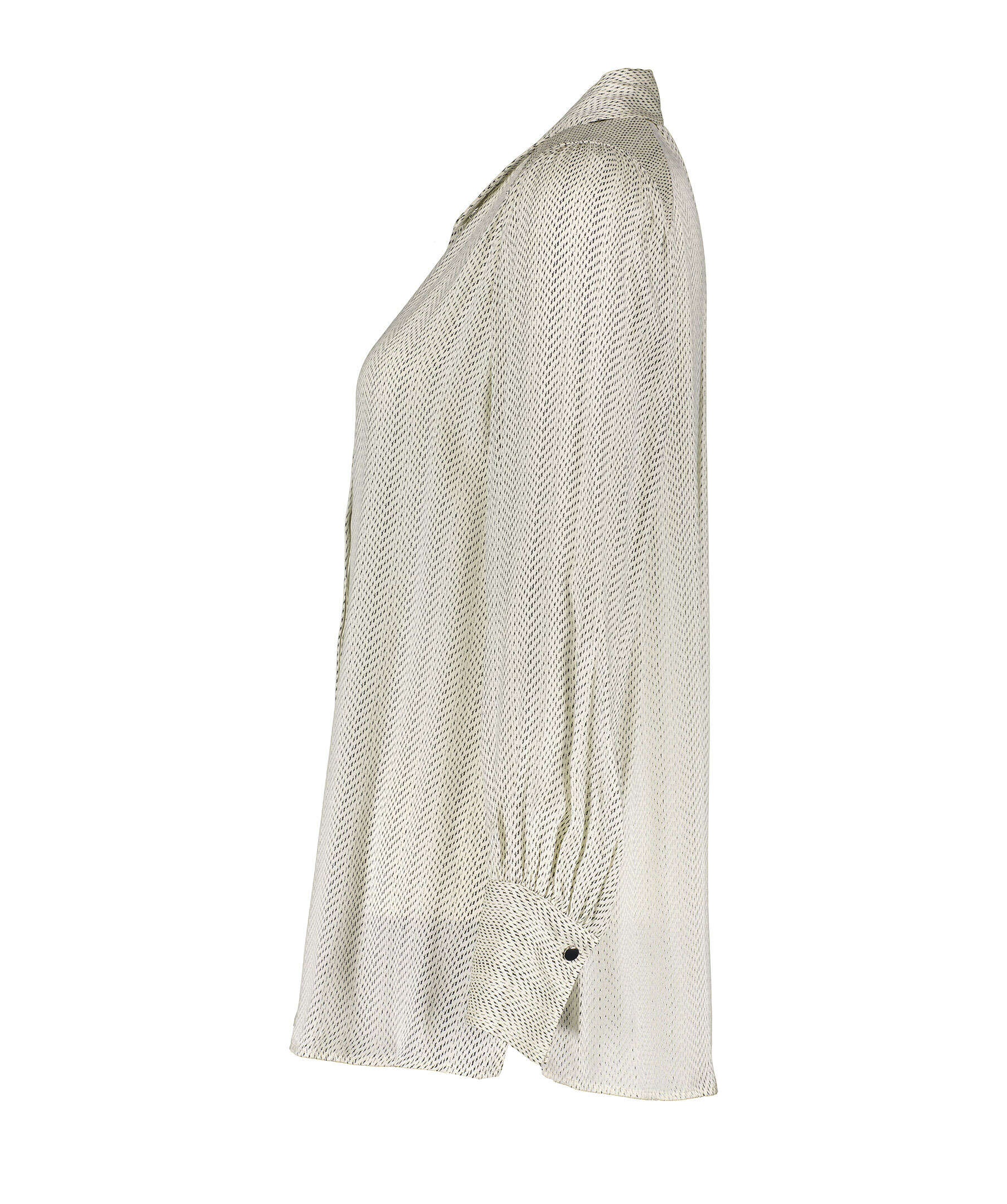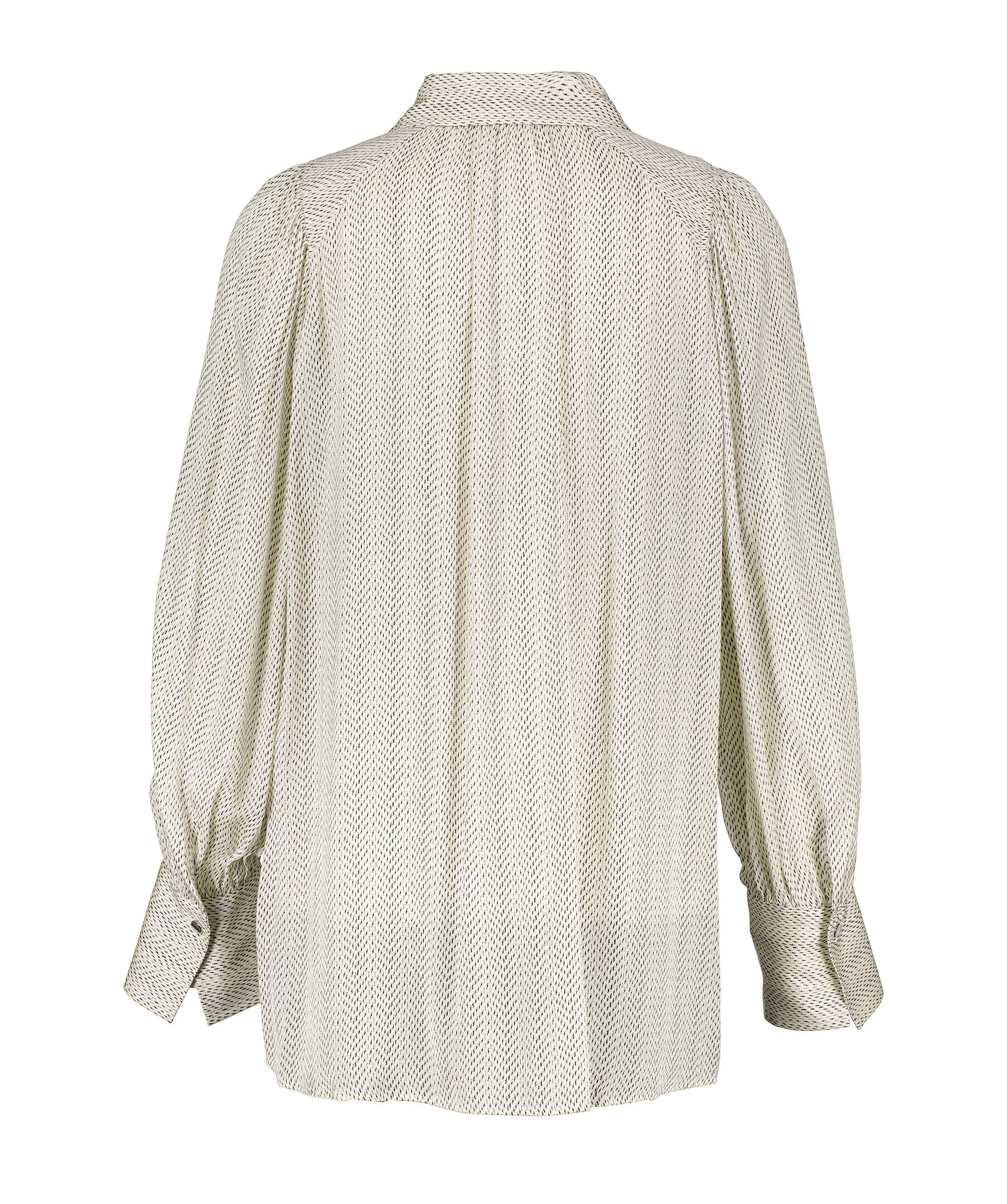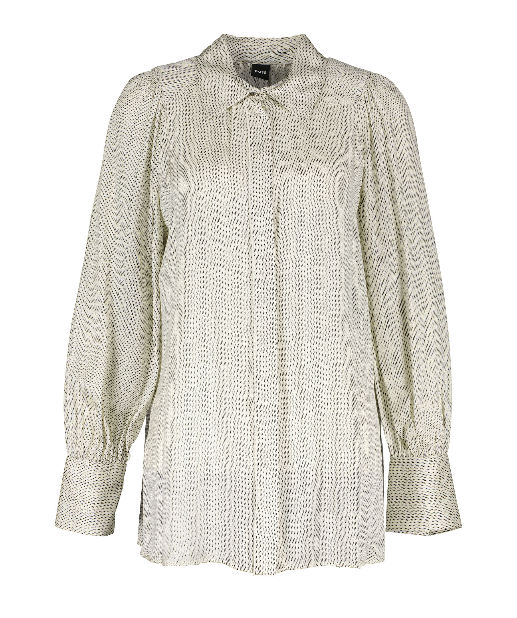 Off-white, silkesblus med svarta mönster från Boss Black. Blusen har dold knappstängning. Krage med synlig silverfärgad knapp. Tillverkad av en silkesblandning.