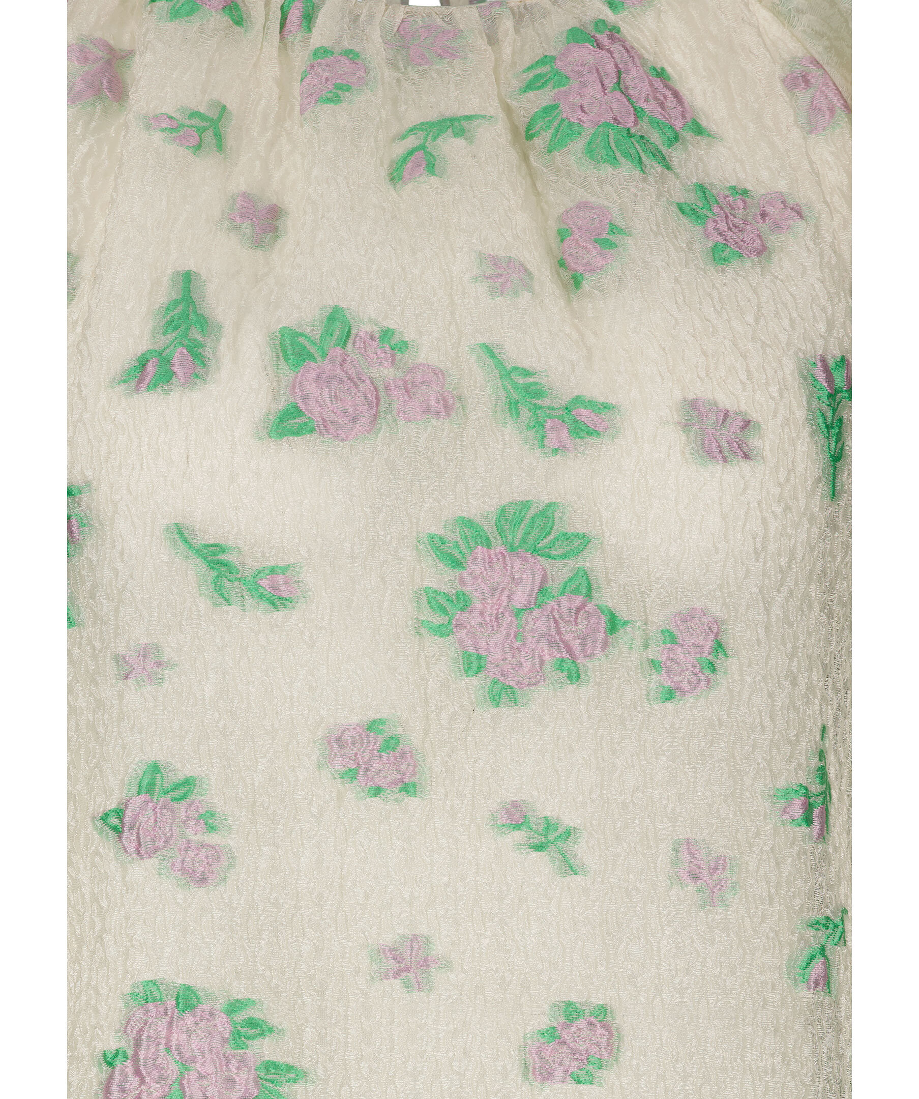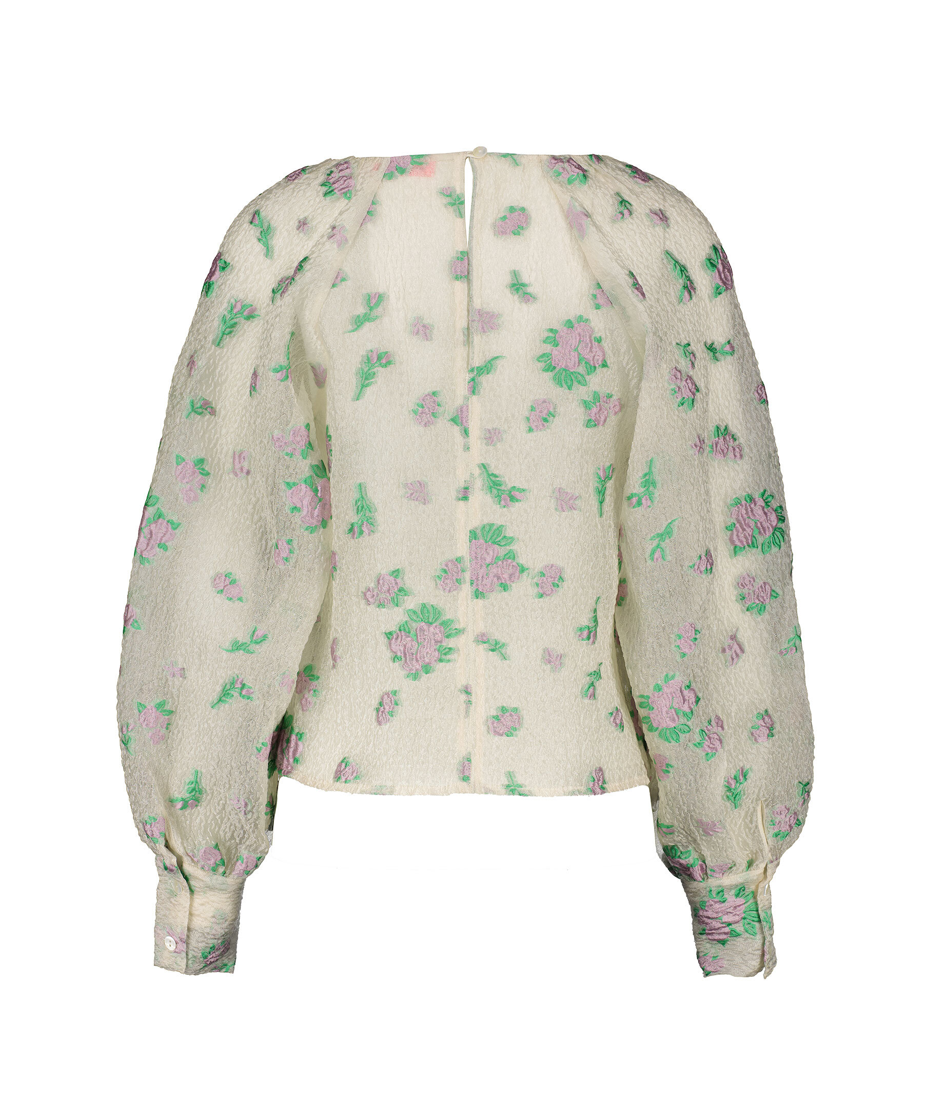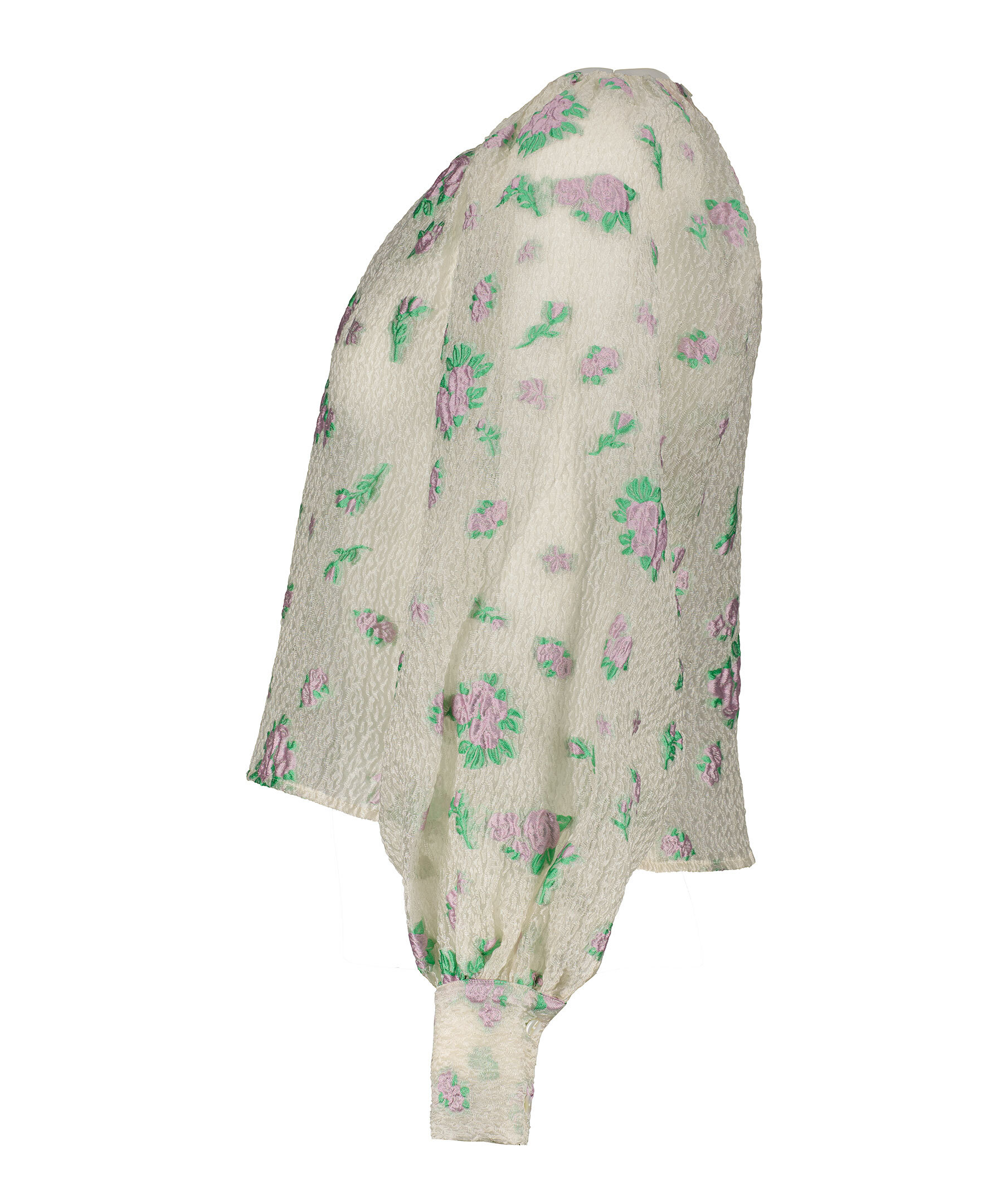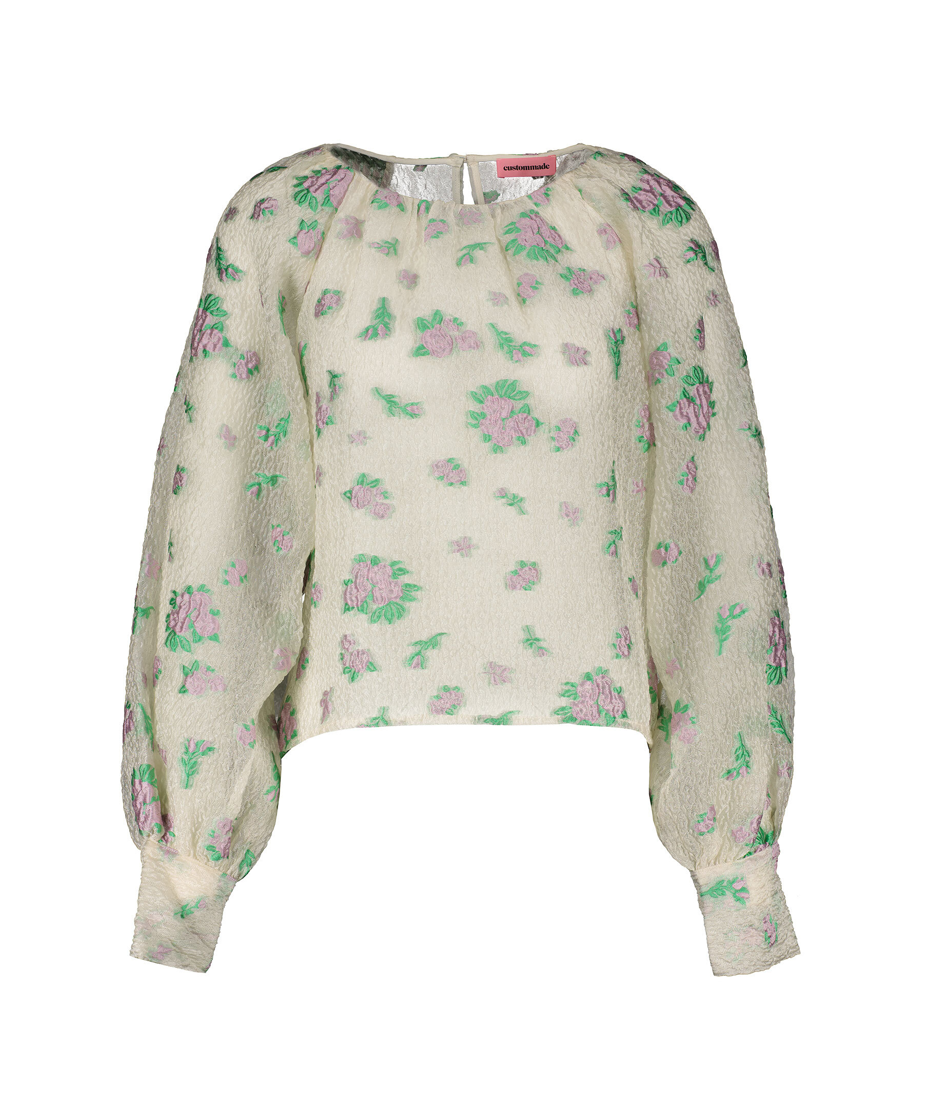 Blommönstrad, halvgenomskinlig blus från Custommade. Lös passform med långa pösiga ärmar och knapp i nacken. Tillverkad i en polyester- och polyamidblandning.