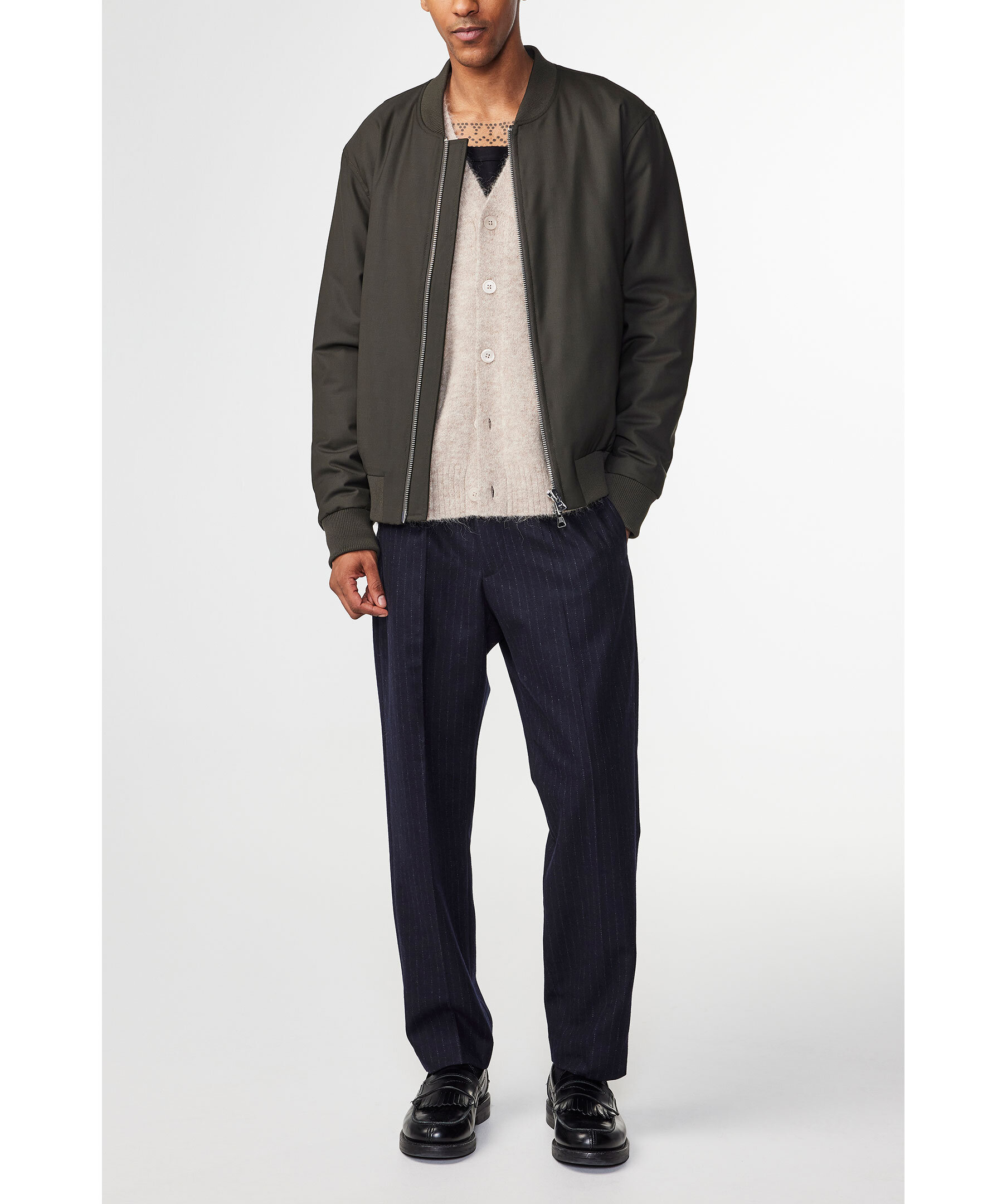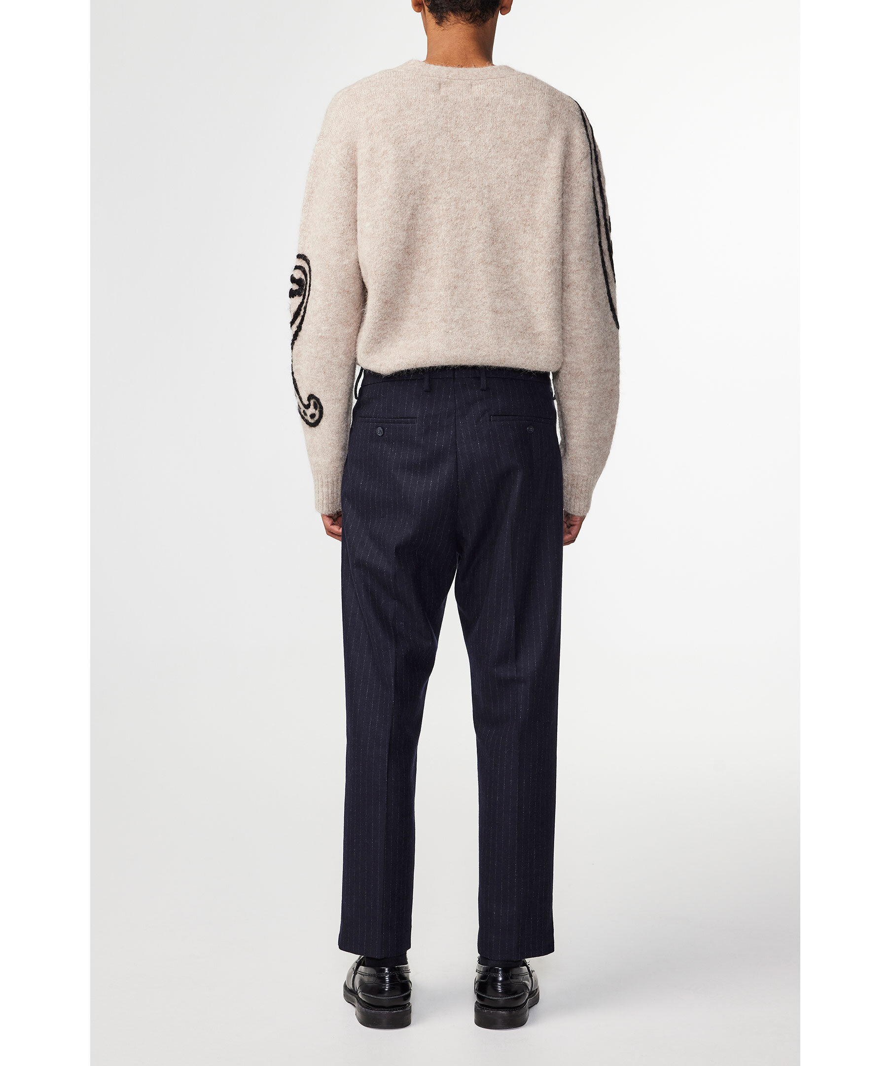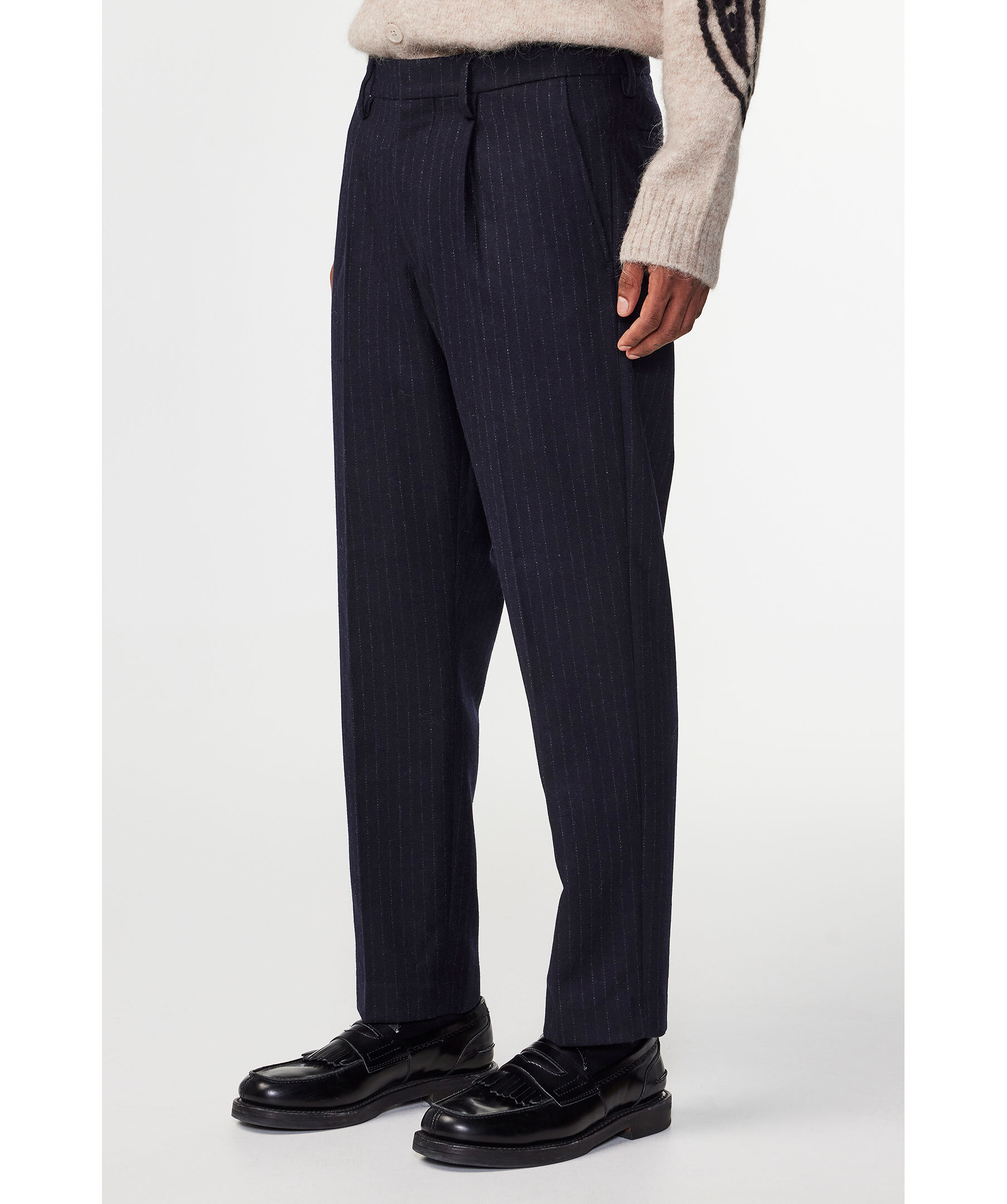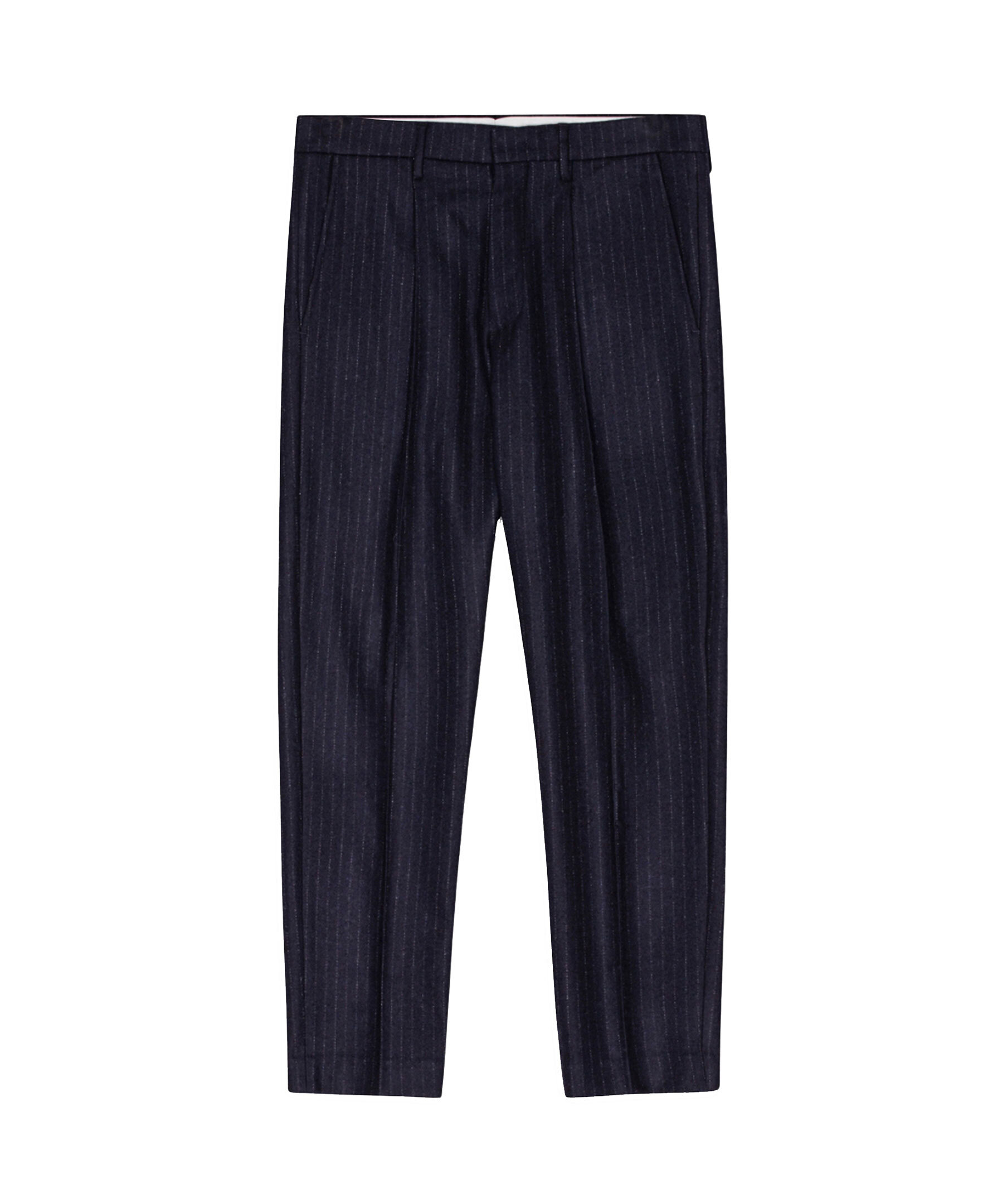 Marinblå randiga byxor från NN07. Byxorna har avsmalnande ben och regular fit, har pressveck, blindfåll och dold stängning. Dubbla passpoal-fickor med knappstägning och jordhornsknappar. Tillverkade i en 380 g/m2 återvunnen ullblandning melangetwill.