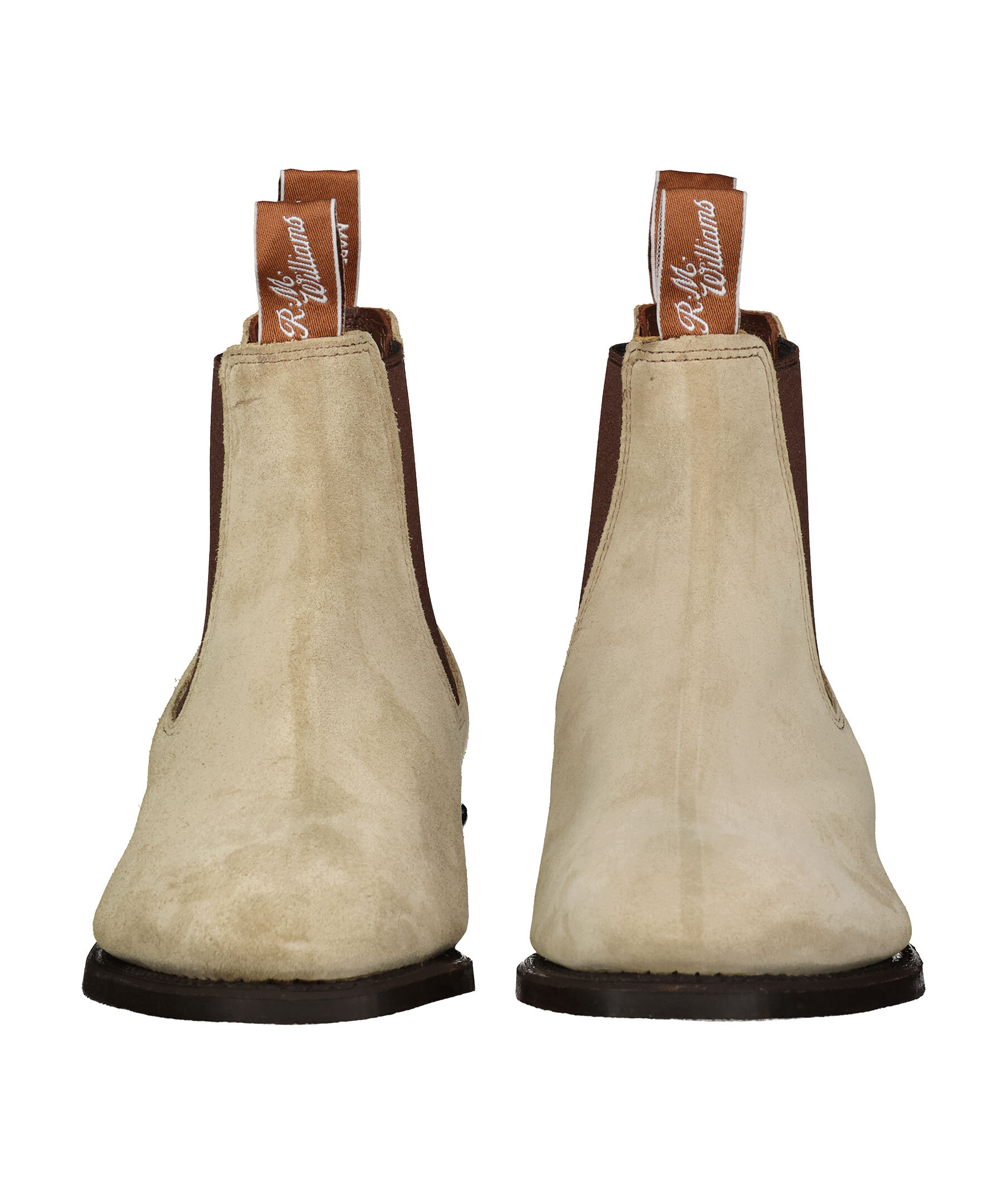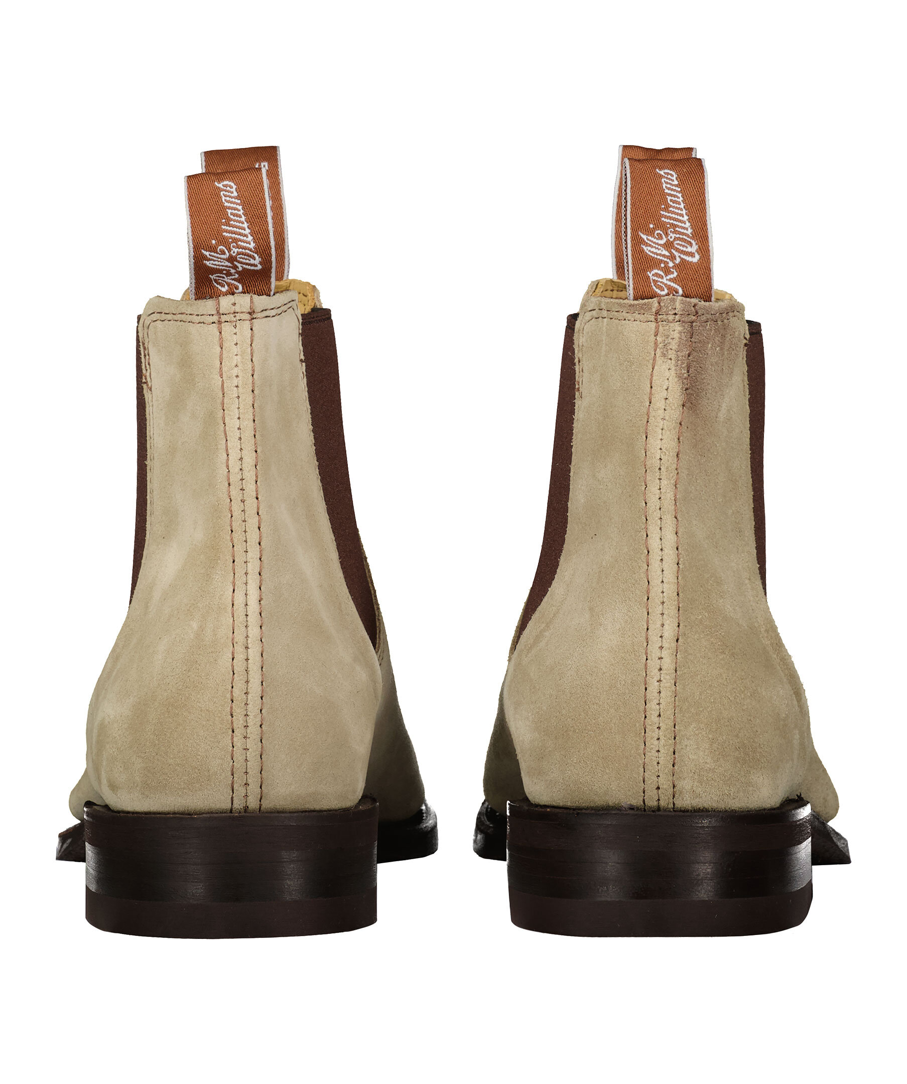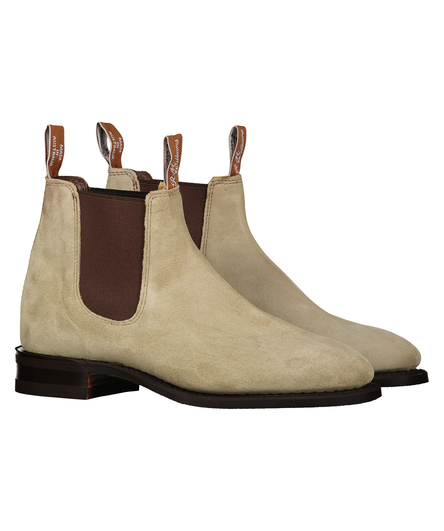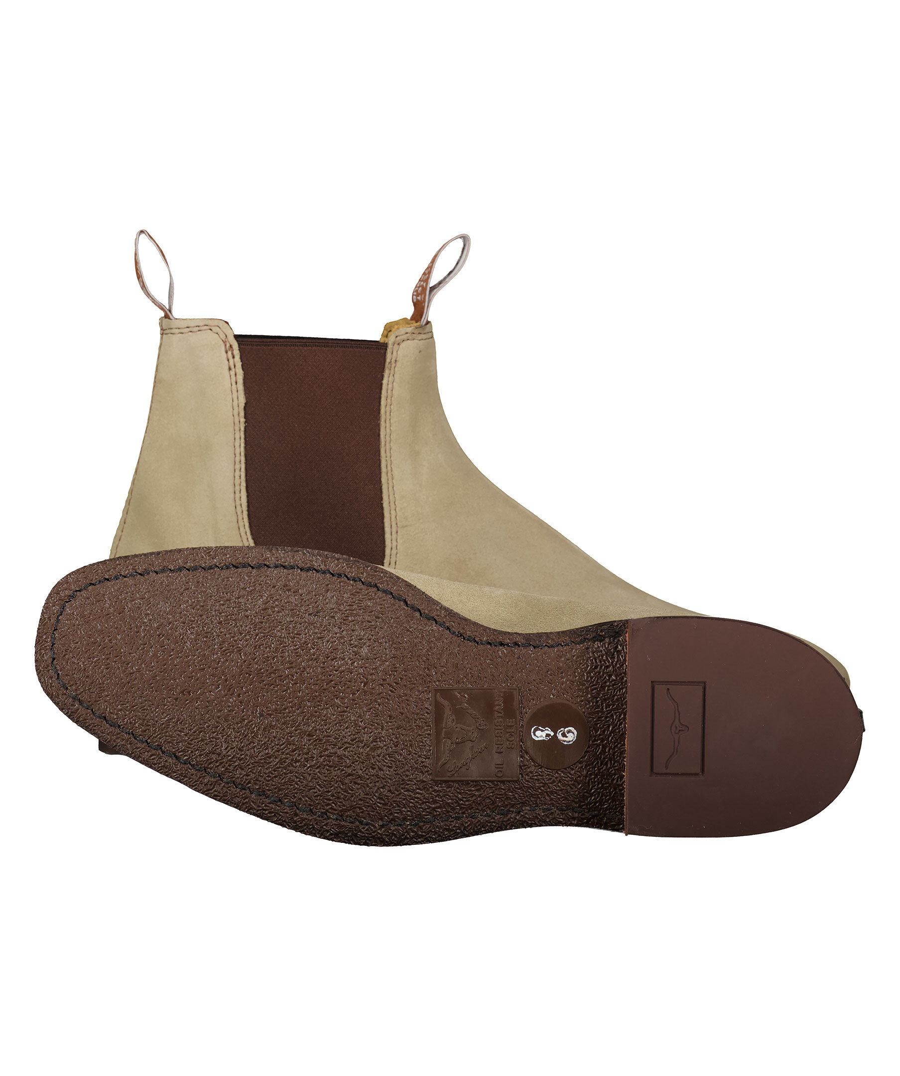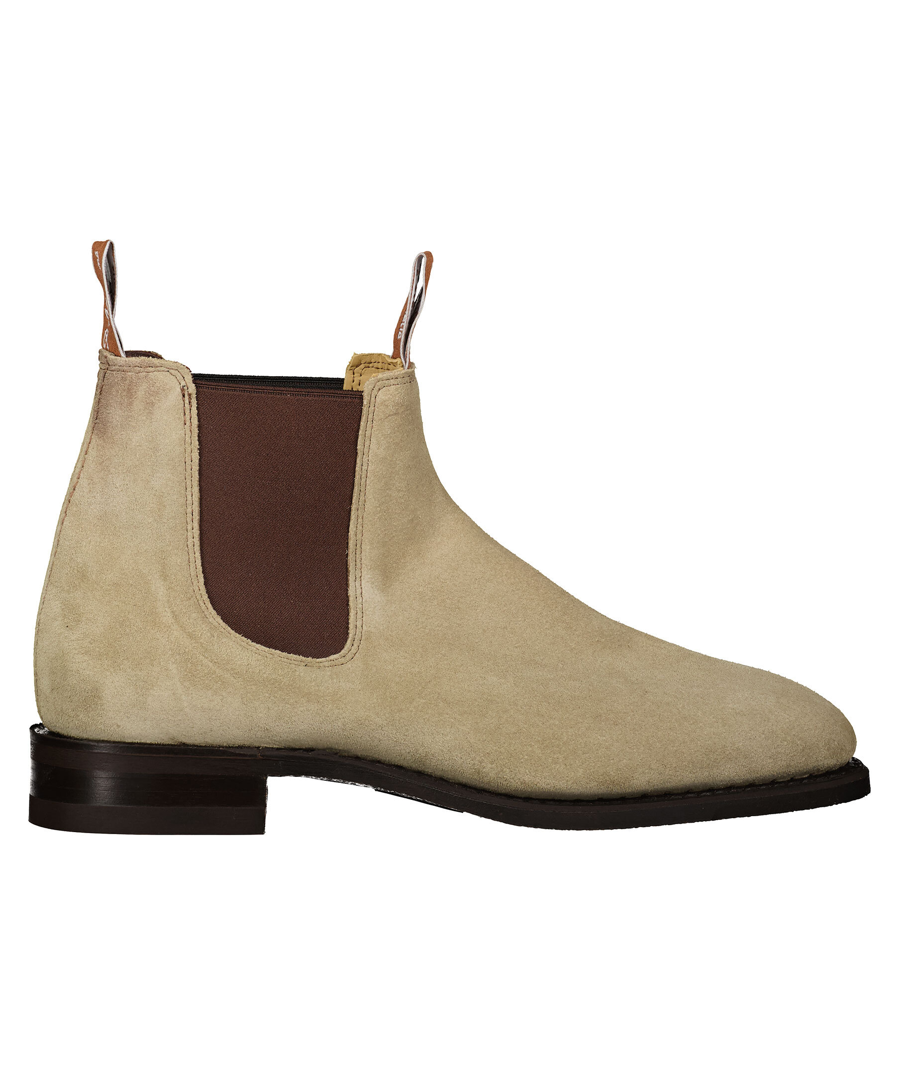 Benvita Handgjorda Chelsea boots från australienska R.M.Williams med skogsgrön mocka som ovandel, innersula i läder och randsydd yttersula i gummi.