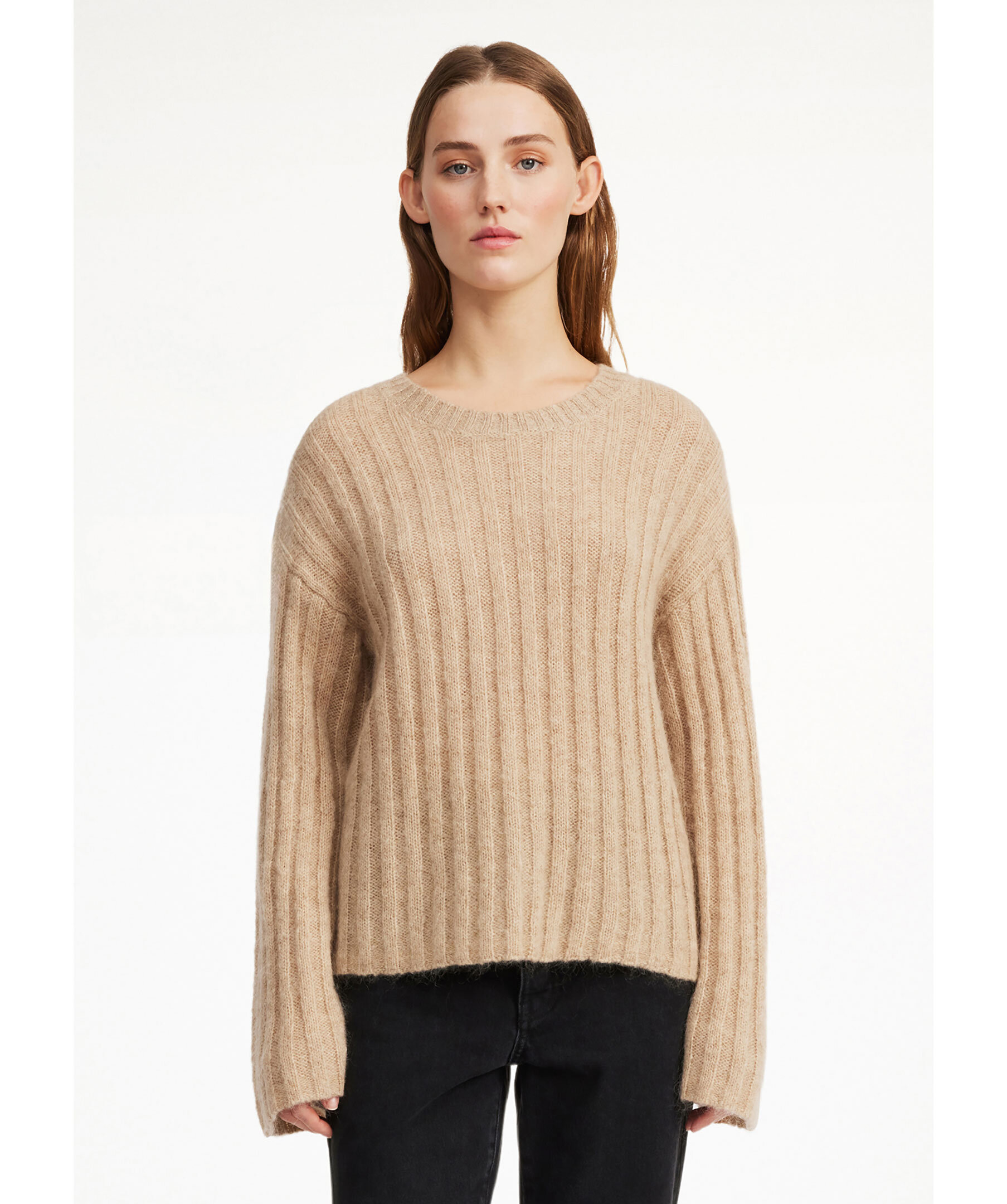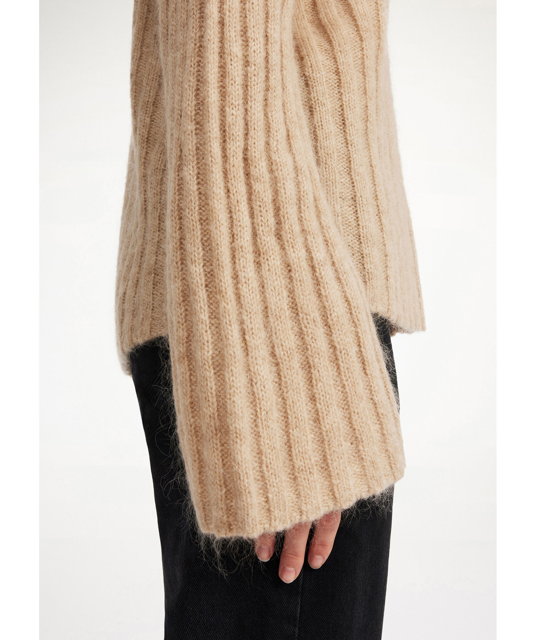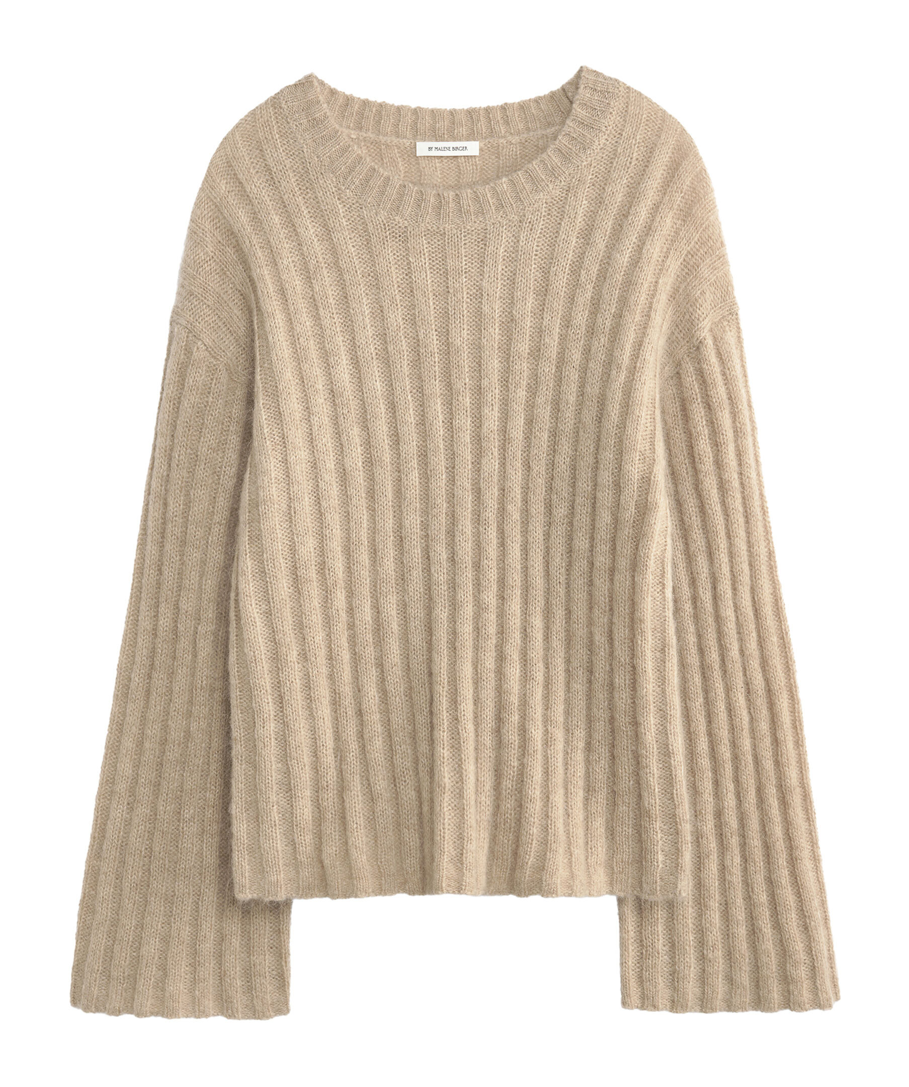 Beige, ribbstickad tröja från By Malene Birger. Tröjan har en rund, ribbstickad halsringning, tappade axlar och vida, långa ärmar. Tillverkad i en mohairblandning.