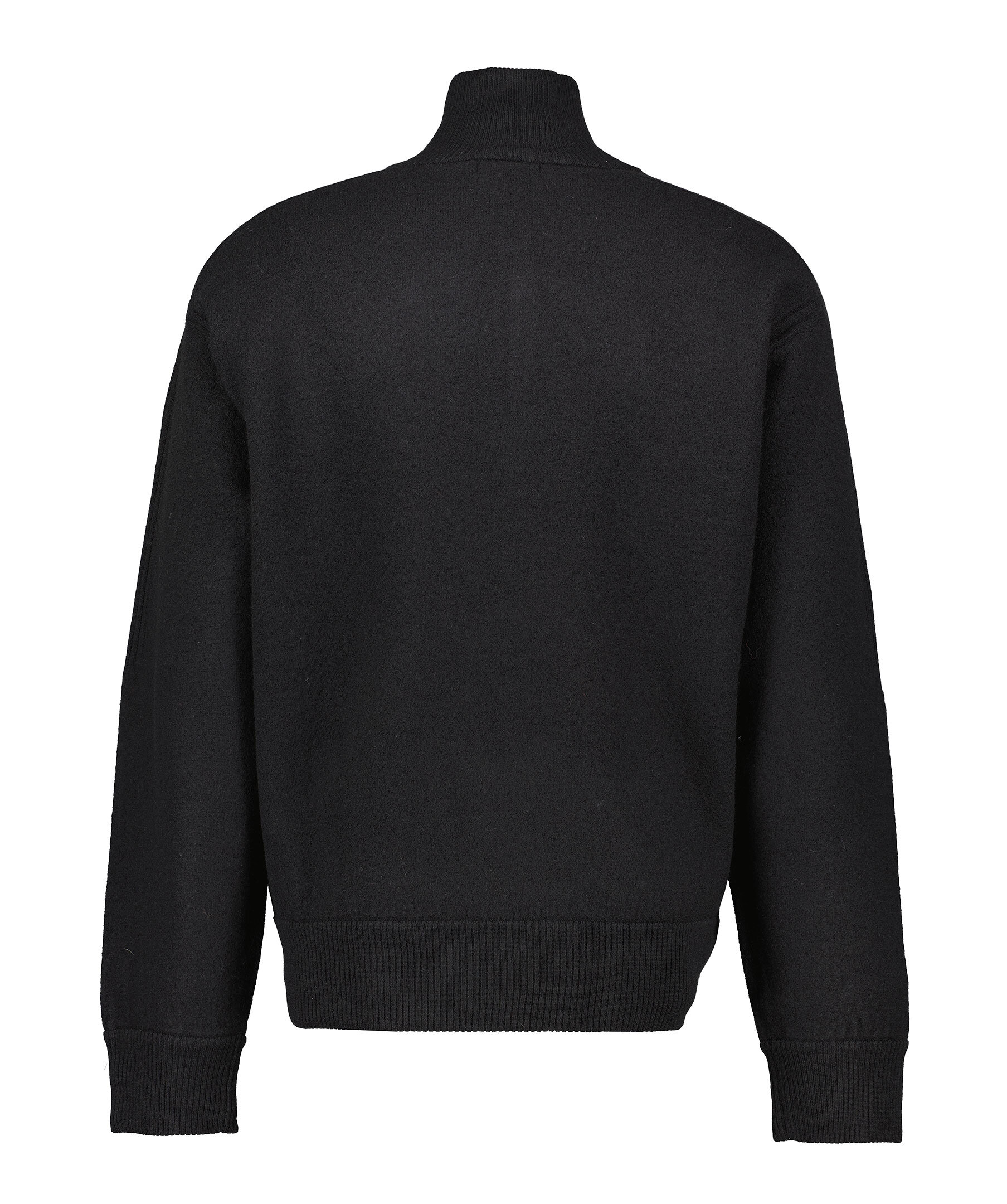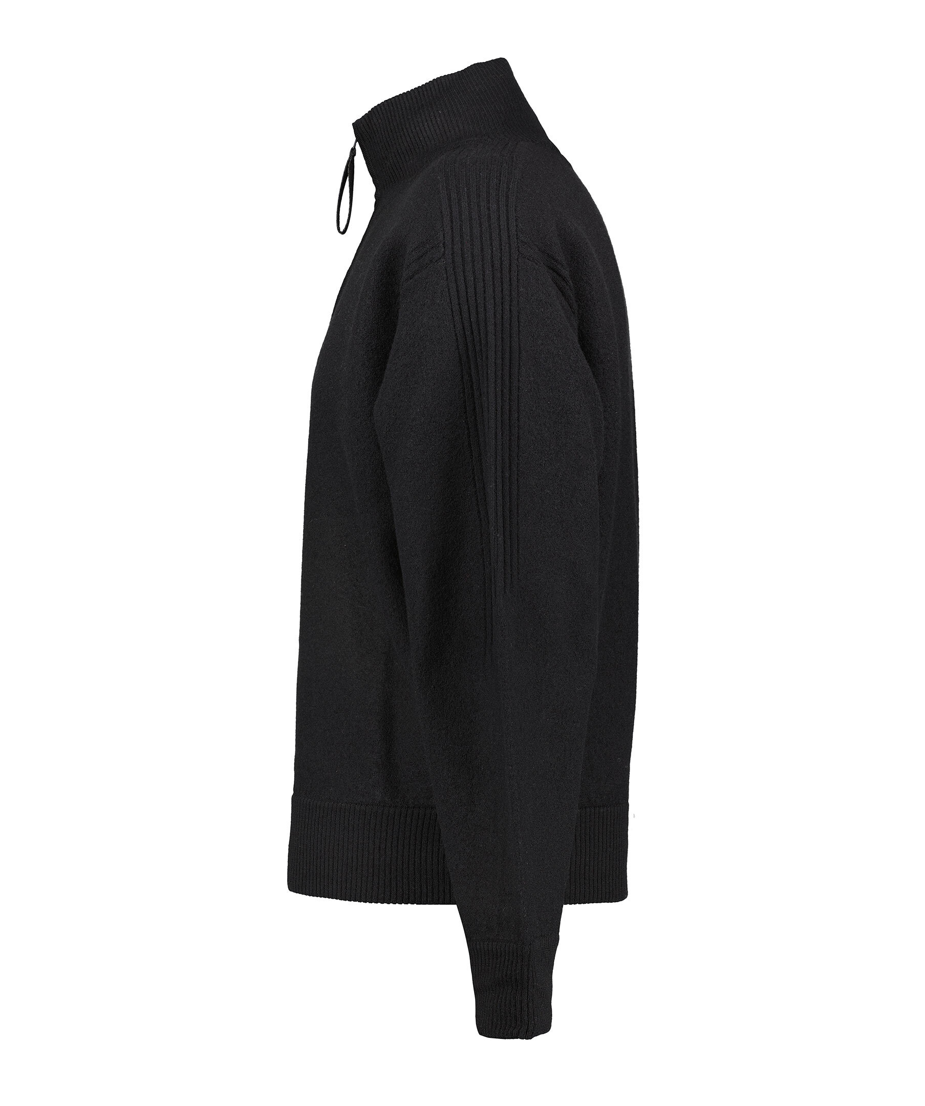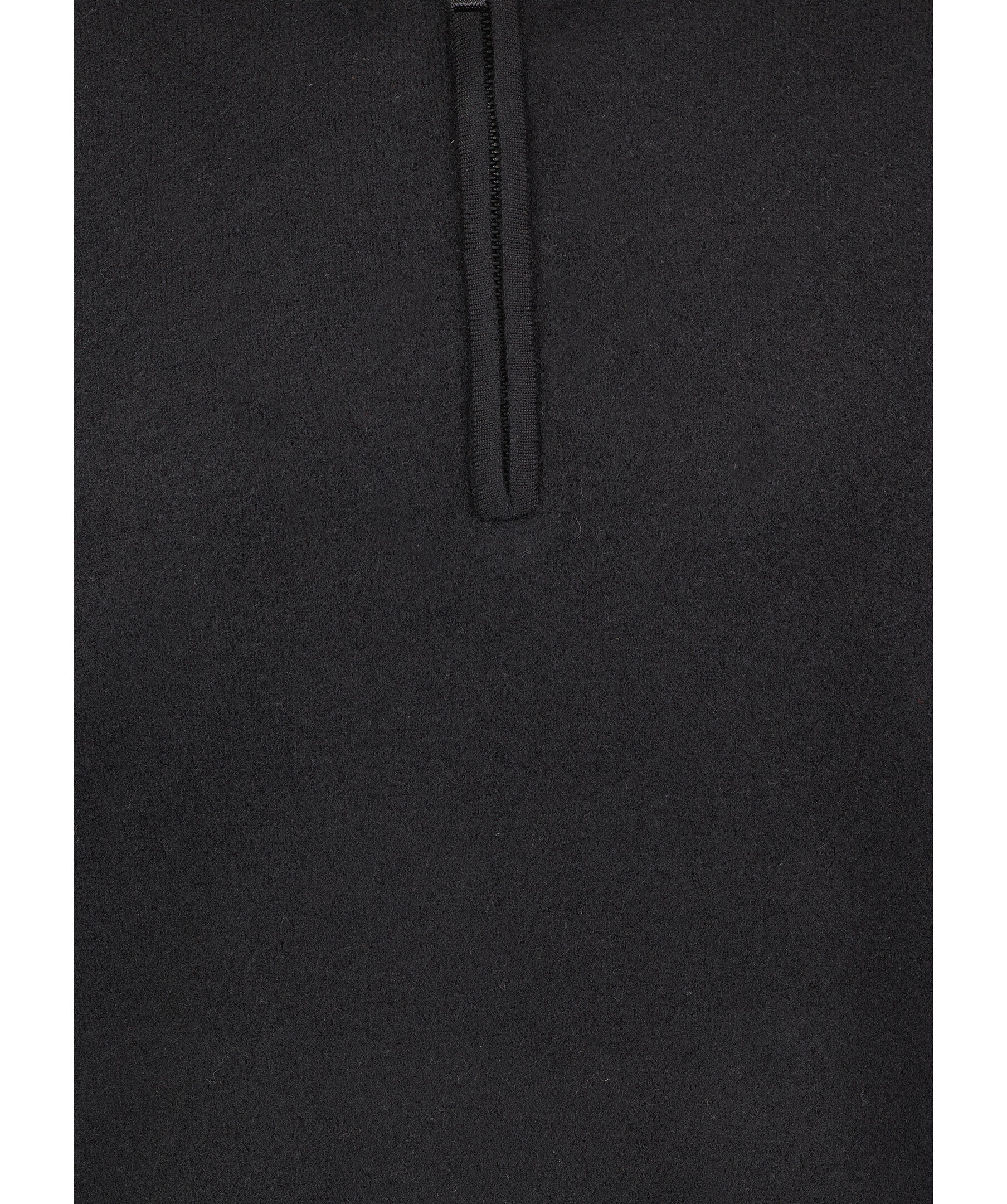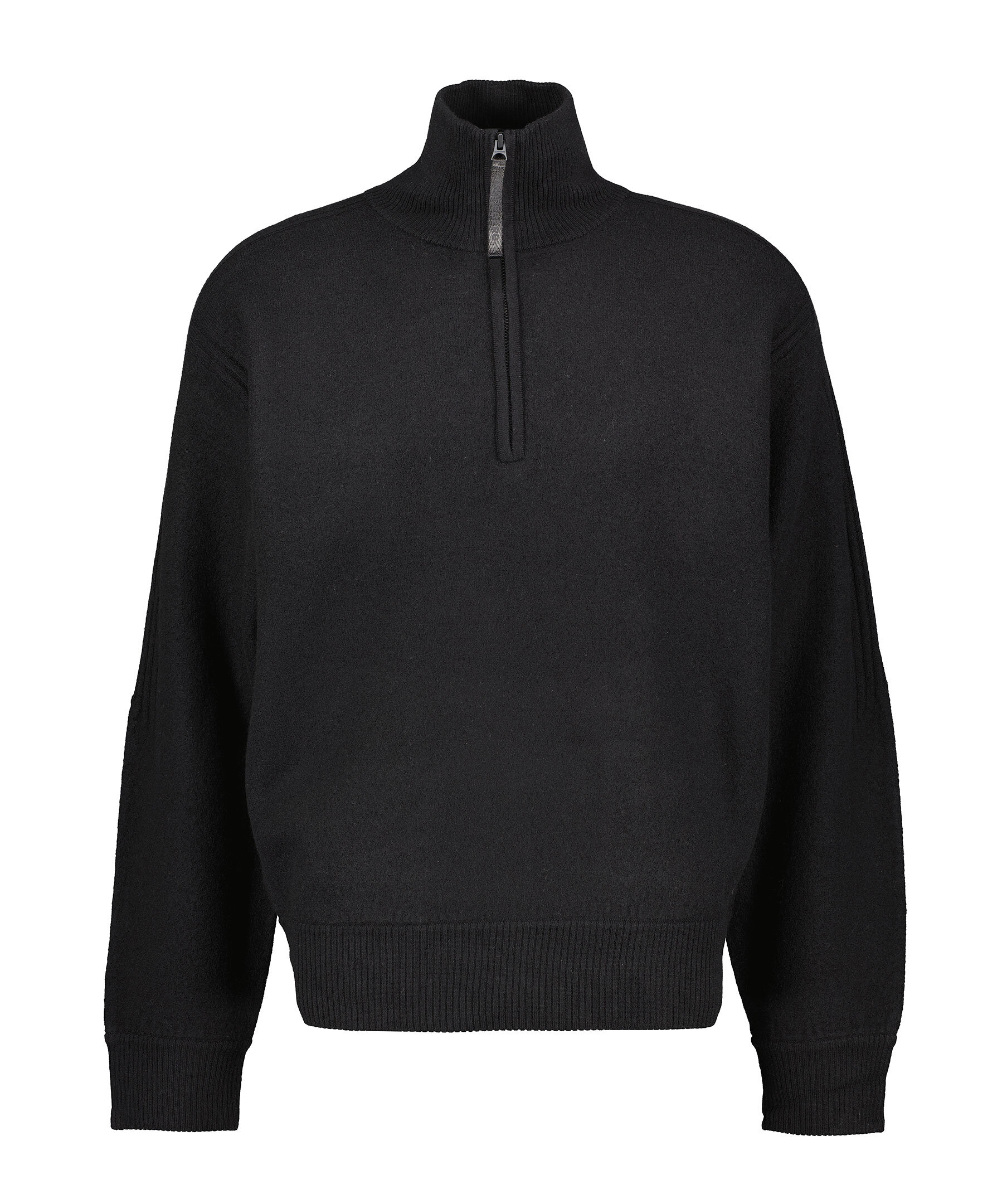 Svart half-zip tröja från J.Lindeberg. Tröjan har en avslappnad passform och en rik textur. Högre, ribbstickad krage, ribbade ärm- och tröjavslut samt ribbade detaljer över axlar och ärm. Tillverkad av 100% ull.