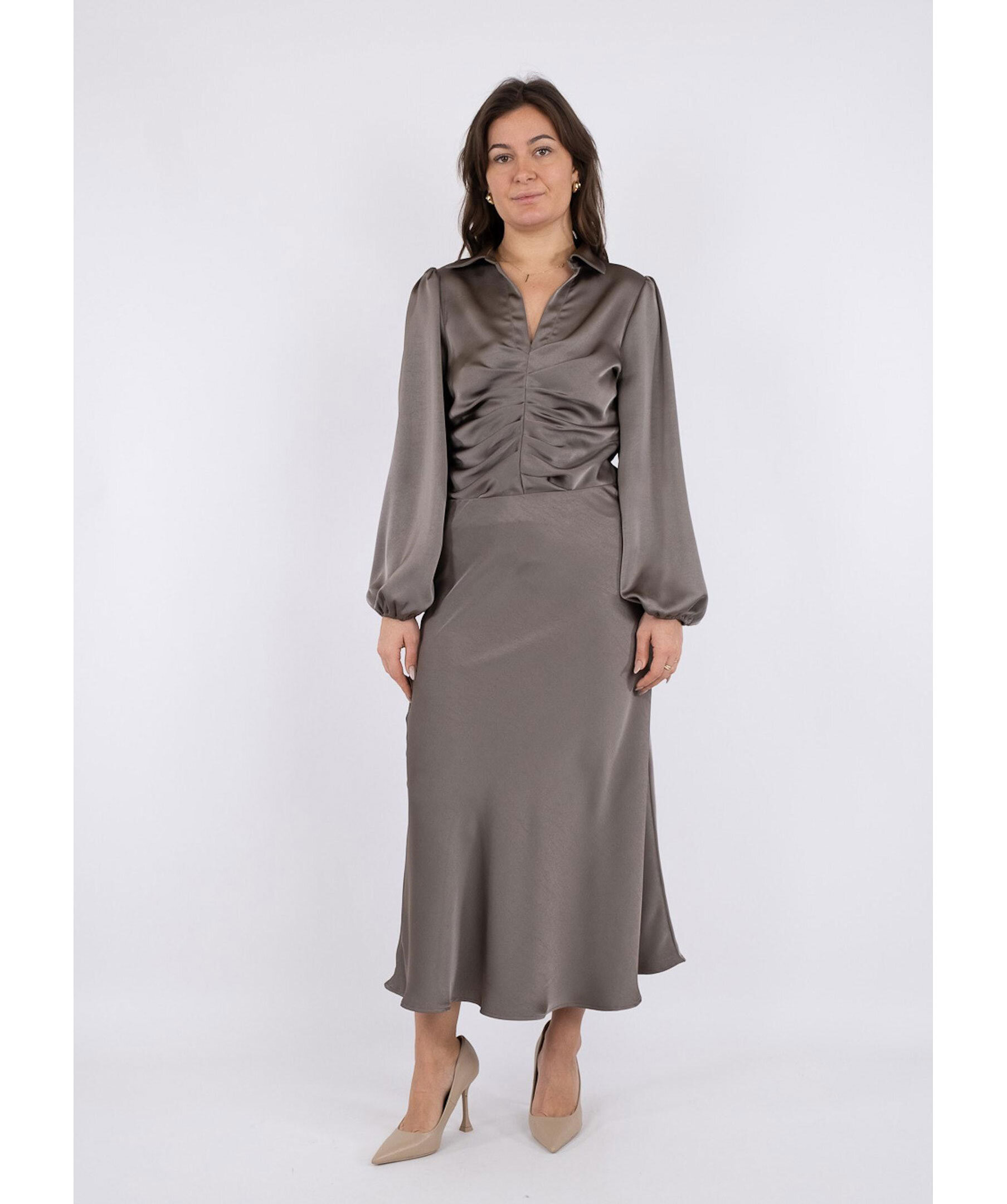 Grå, midi-lång kjol från Neo Noir. Resår på insidan i midjan och snedskuren med en mycket smickrande passform. Tillverkad i 100% Polyester.