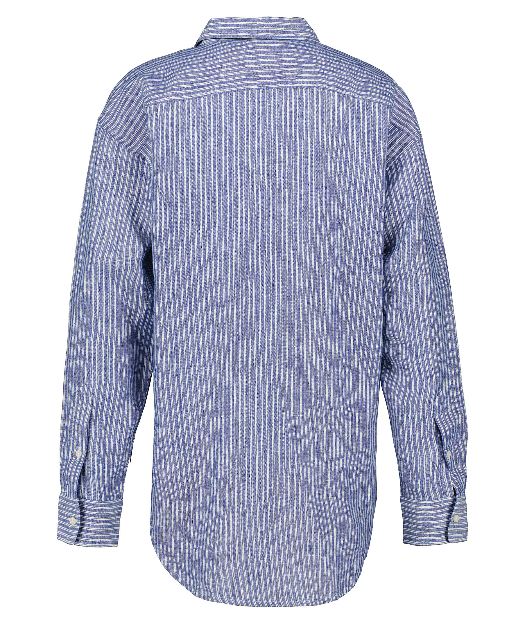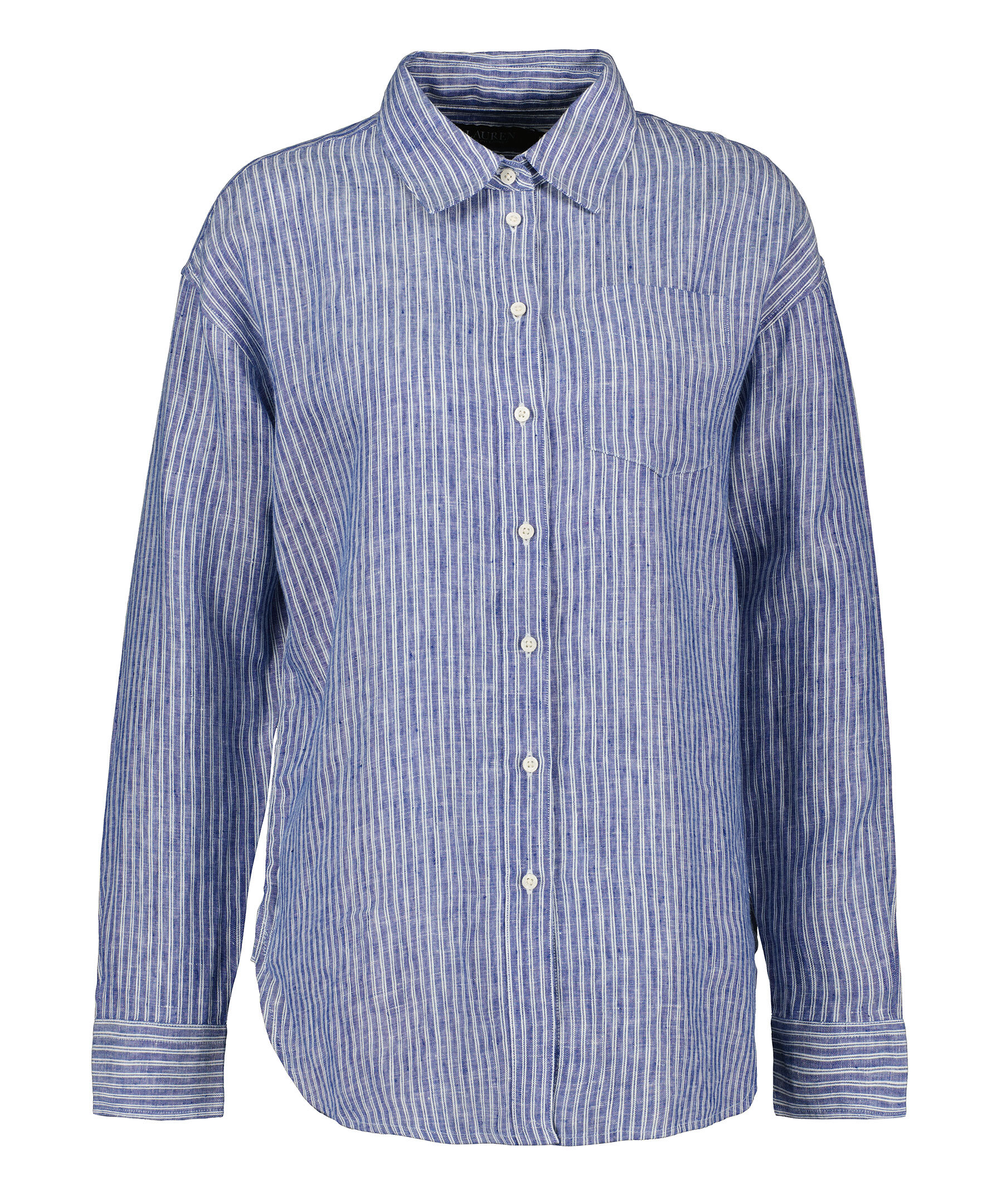 Blå och vit randig skjorta från Lauren Ralph Lauren. Tillverkad i 100% Linne. Bröstficka på vänster sida. Enkla manschetter. Spetsig krage.