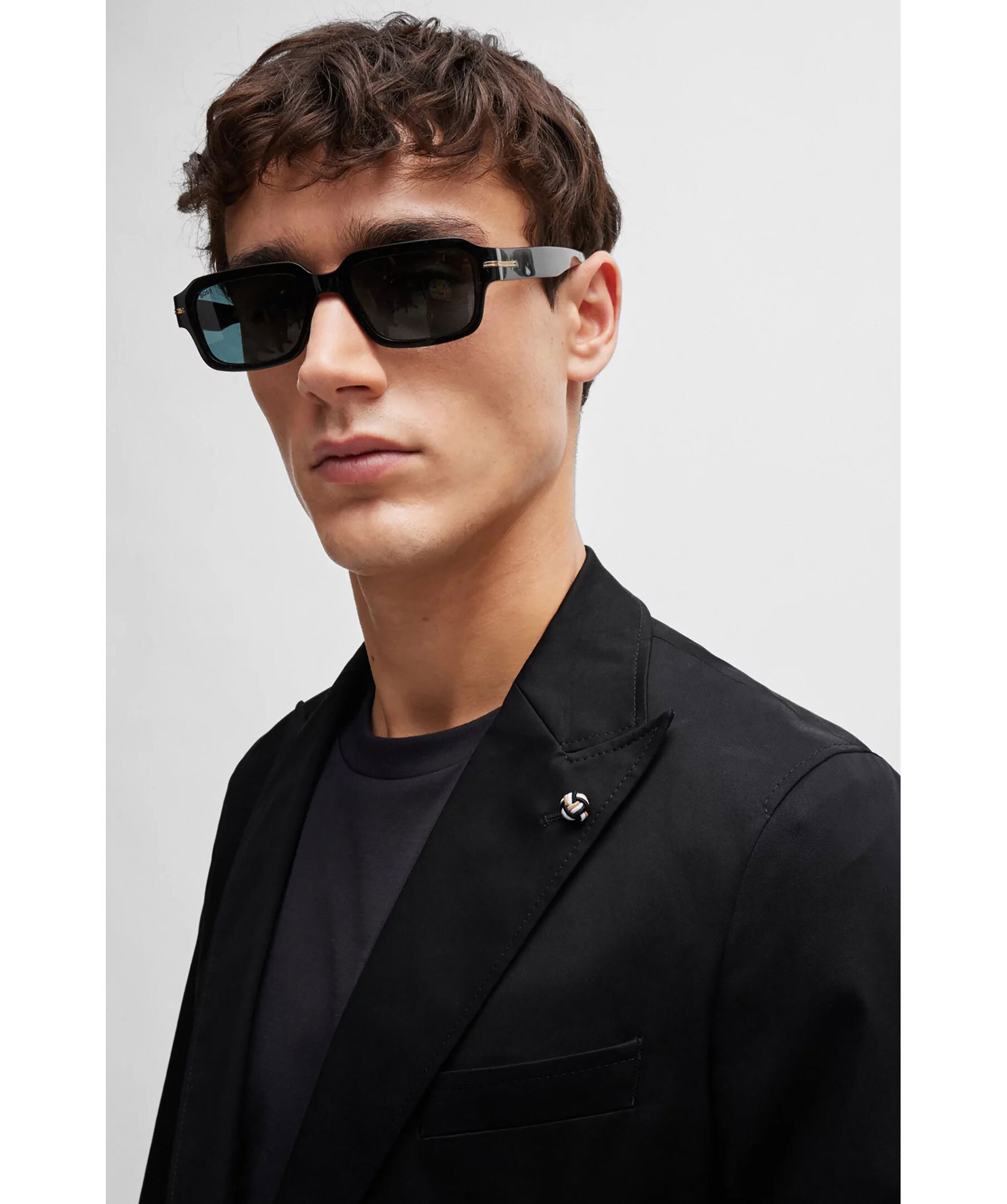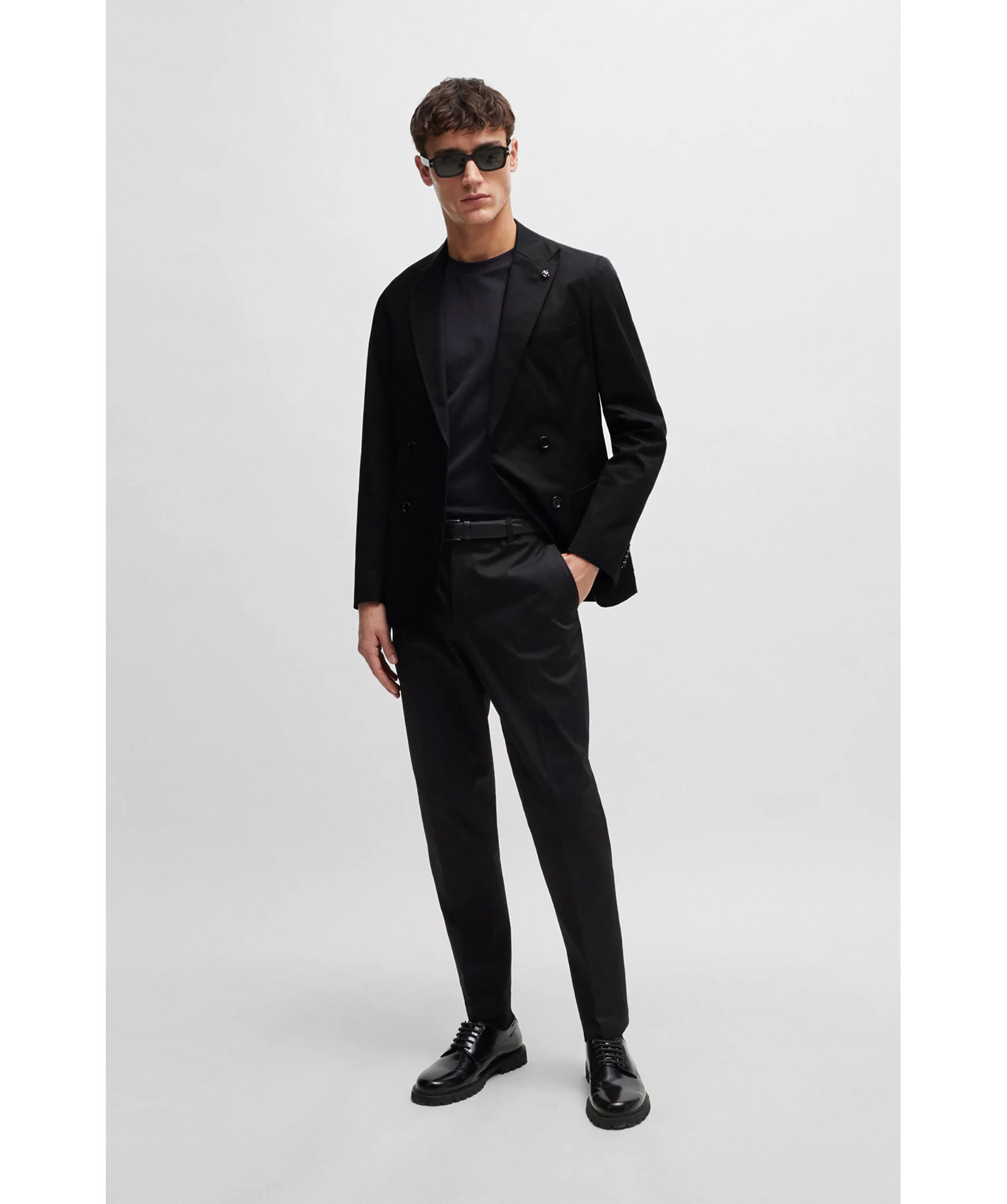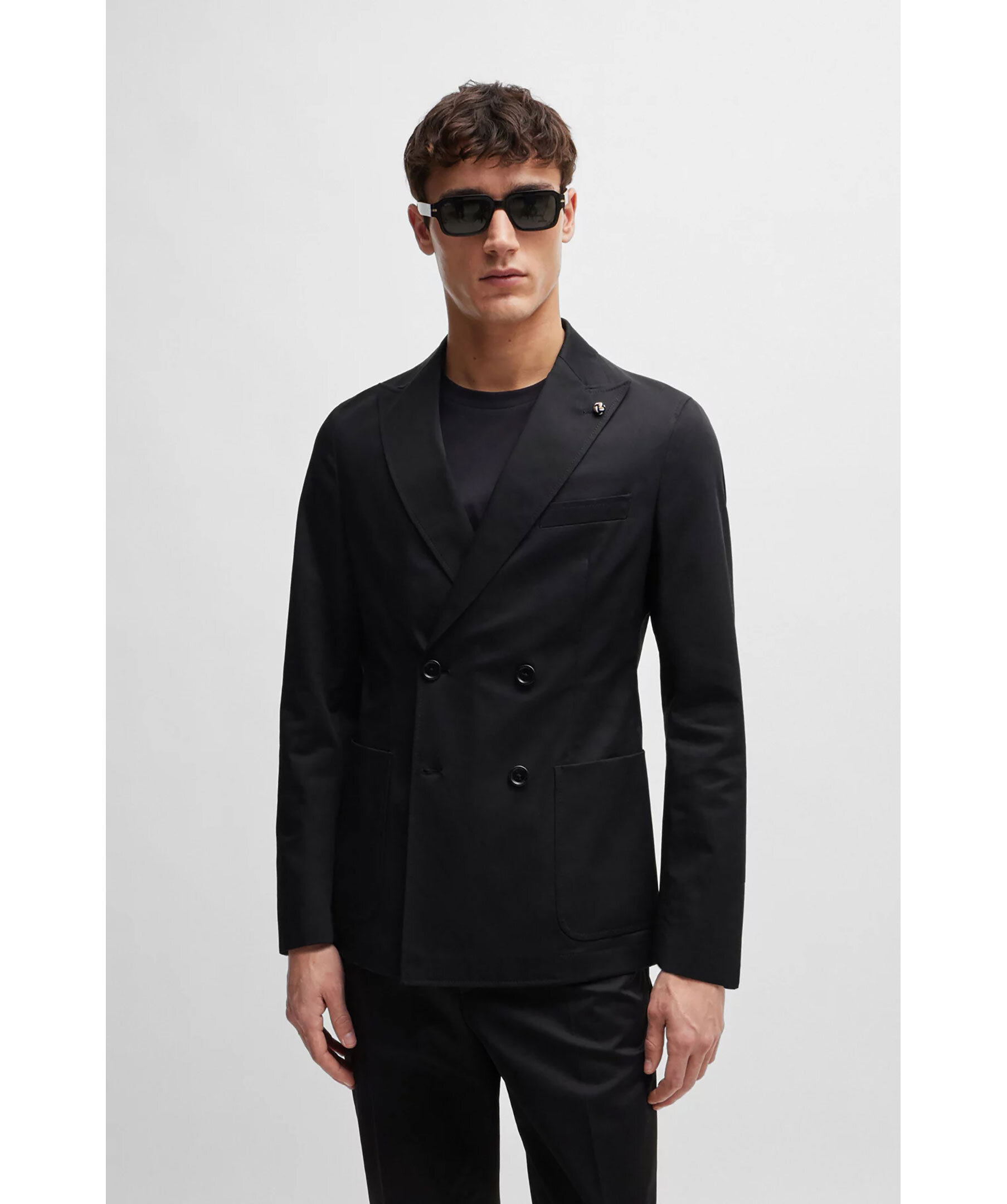 Svart, dubbelknäppt kavaj från BOSS. Kavajen har spetsiga kavajslag, två utanpåliggande fickor samt en welt-bröstficka och överlappande knappar på manschetten. Tillverkad i en bomullsblandning.