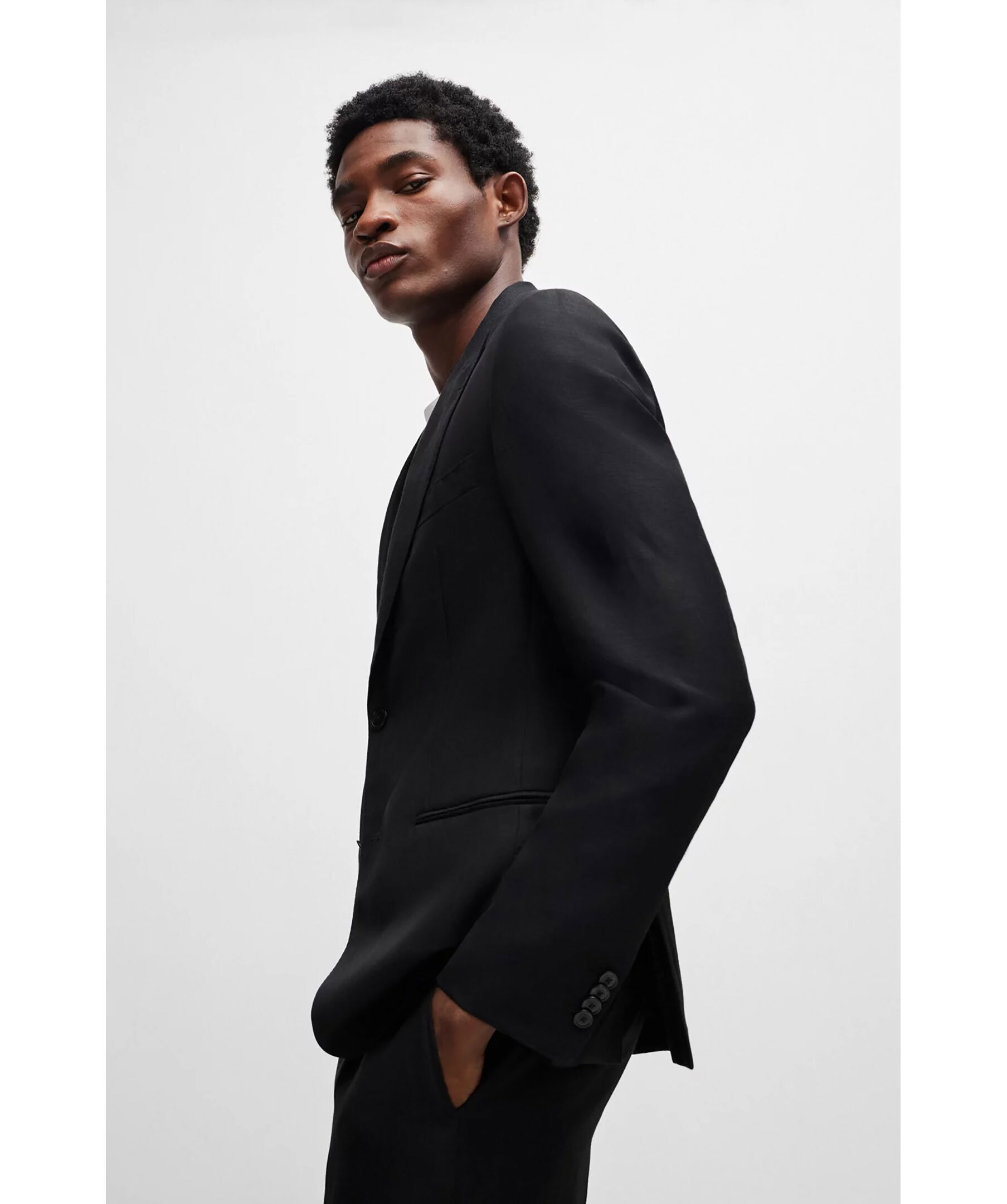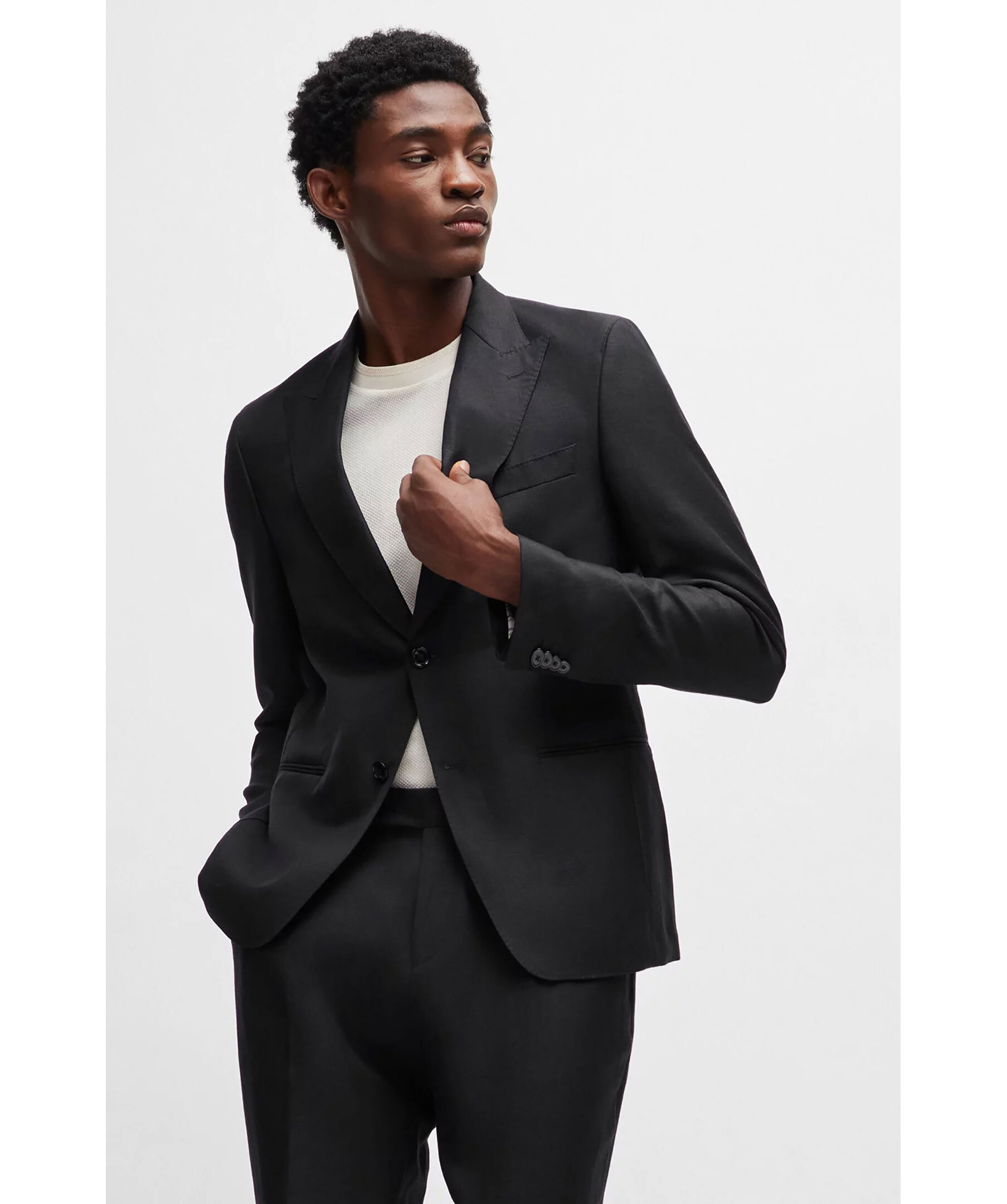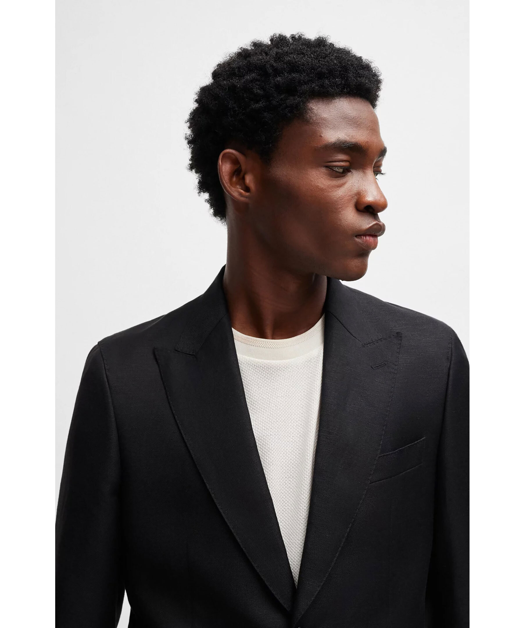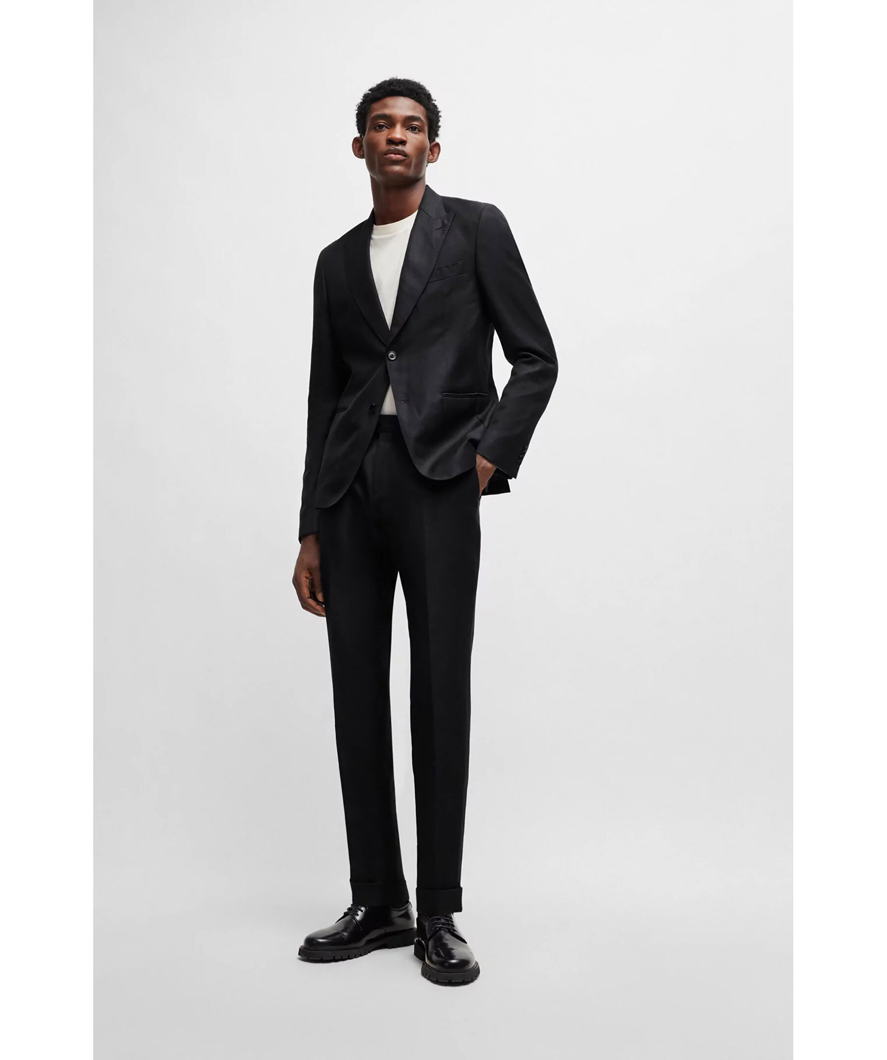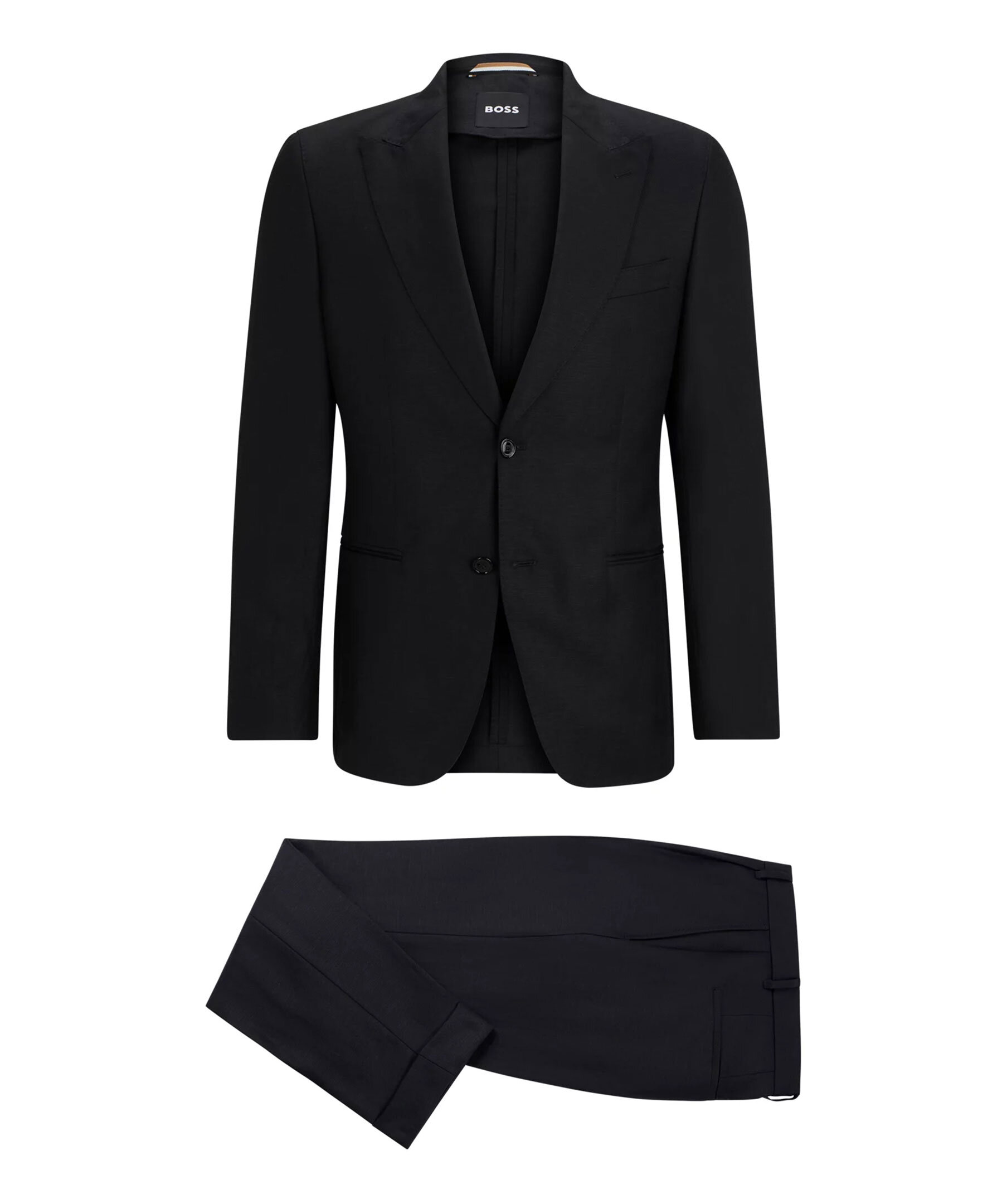 Svart kostym från BOSS. Kavajen har spetsiga kavajslag, enkelknäppt, två passpoalfickor samt en welt-bröstficka och överlappande knappar på manschetten. Byxorna har bälteshällor i midjan, pressveck framtill, två sidfickor samt två passpoal bakfickor. Tillverkade i en linne- och ullblandning.