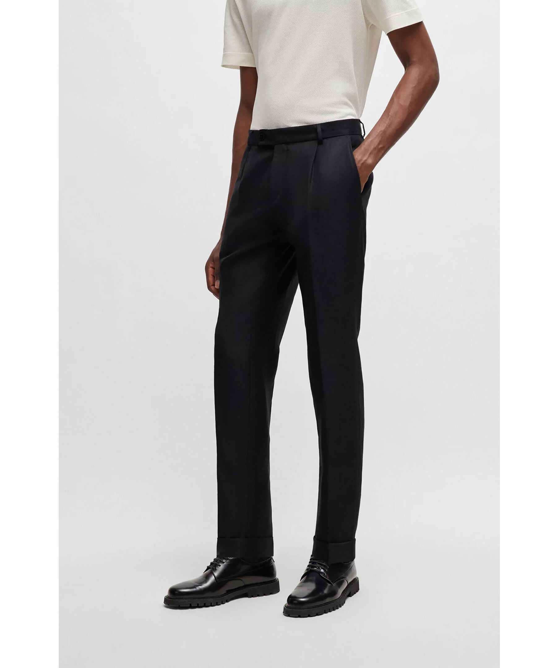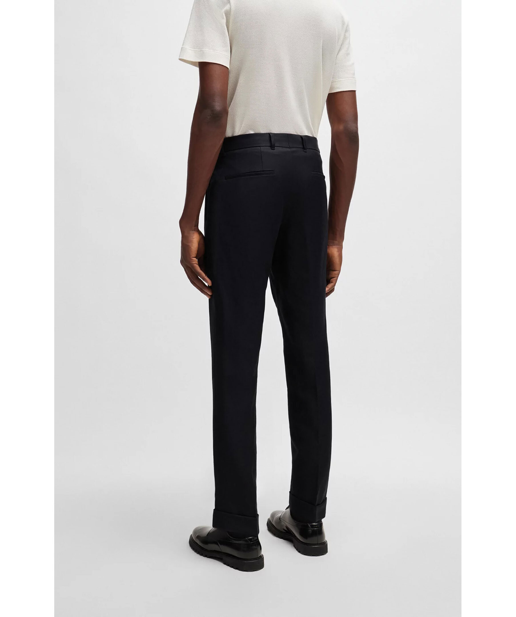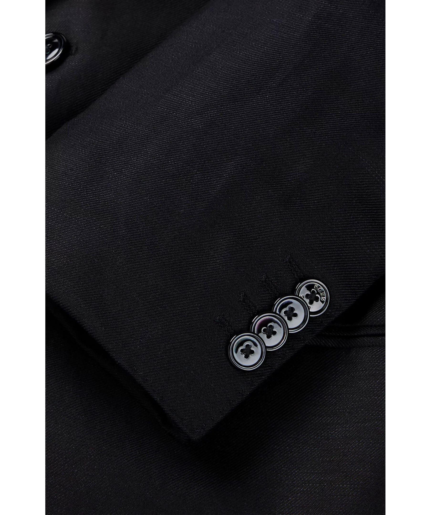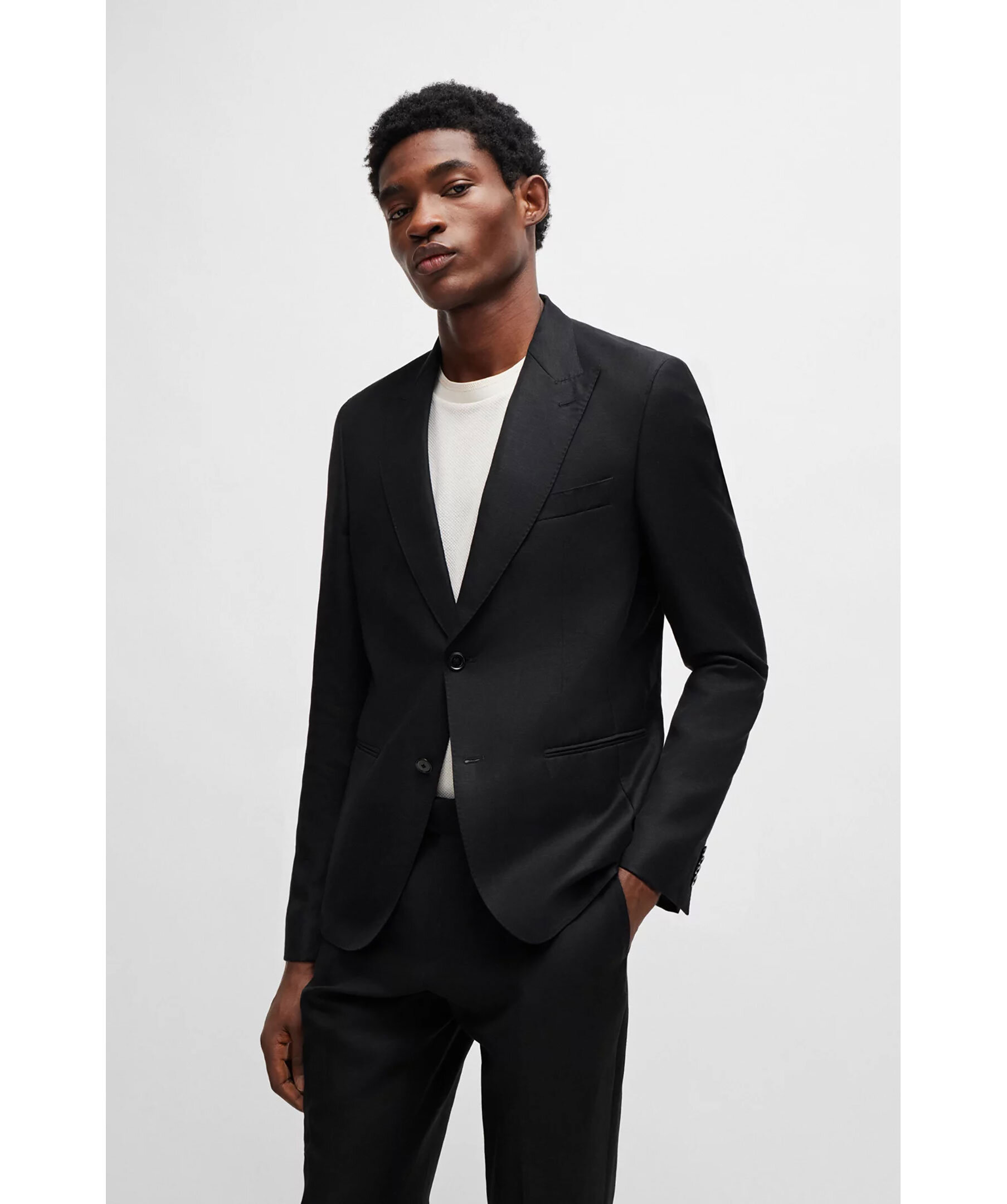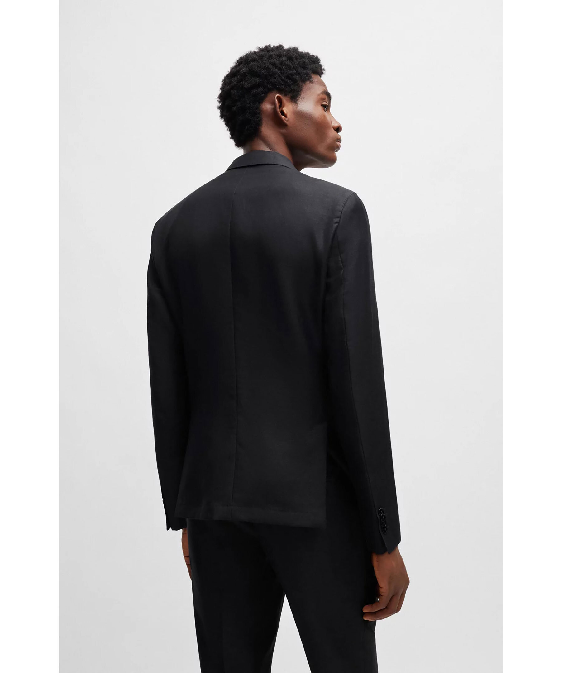 Svart kostym från BOSS. Kavajen har spetsiga kavajslag, enkelknäppt, två passpoalfickor samt en welt-bröstficka och överlappande knappar på manschetten. Byxorna har bälteshällor i midjan, pressveck framtill, två sidfickor samt två passpoal bakfickor. Tillverkade i en linne- och ullblandning.