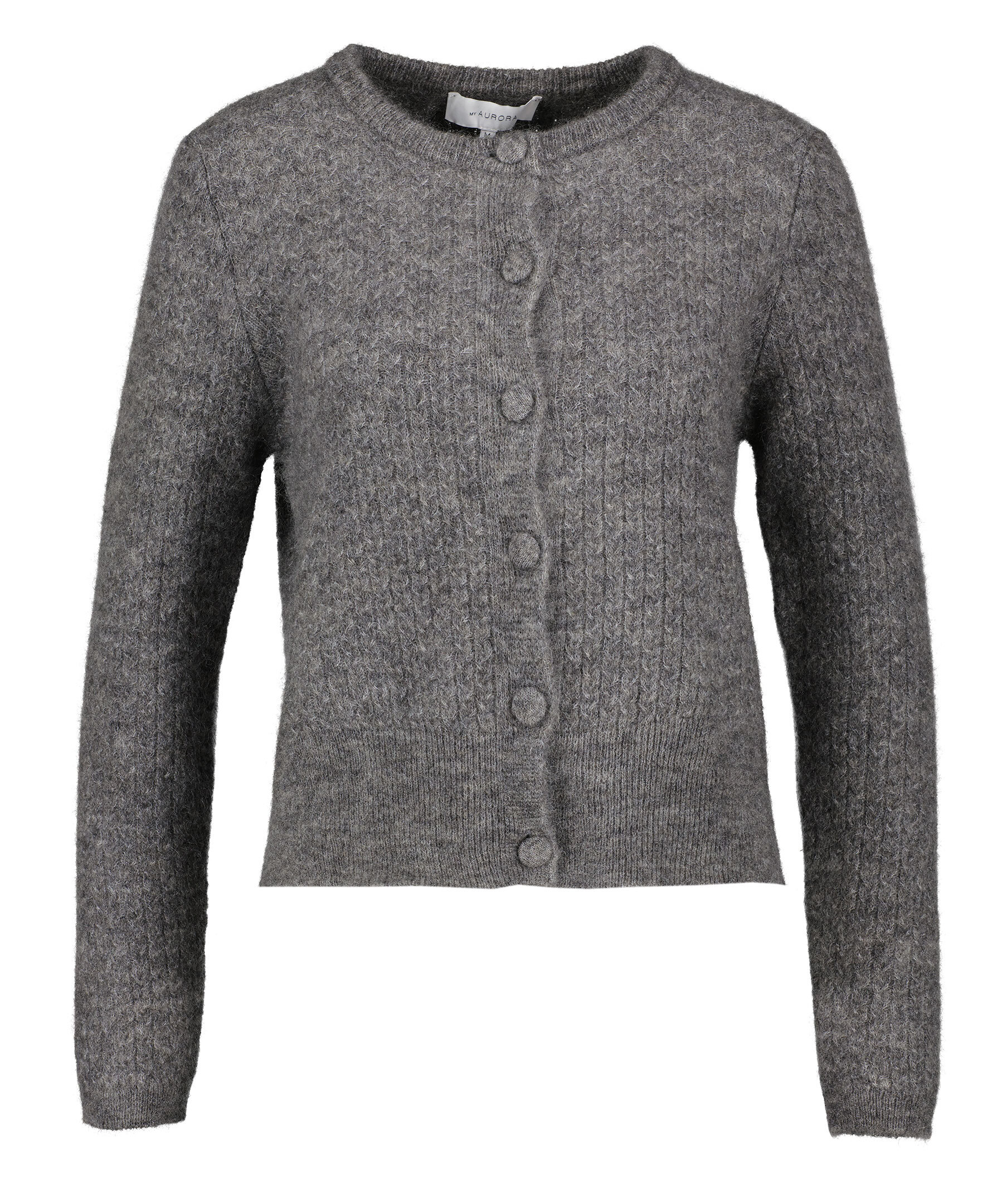 Grå, stickad kofta från My Aurora. Koftan har ett subtilt kabelstickat mönster, stängs med klädda knappar. Rund halsringning och ribbstickade avslut. Tillverkad av en ullblandning.
