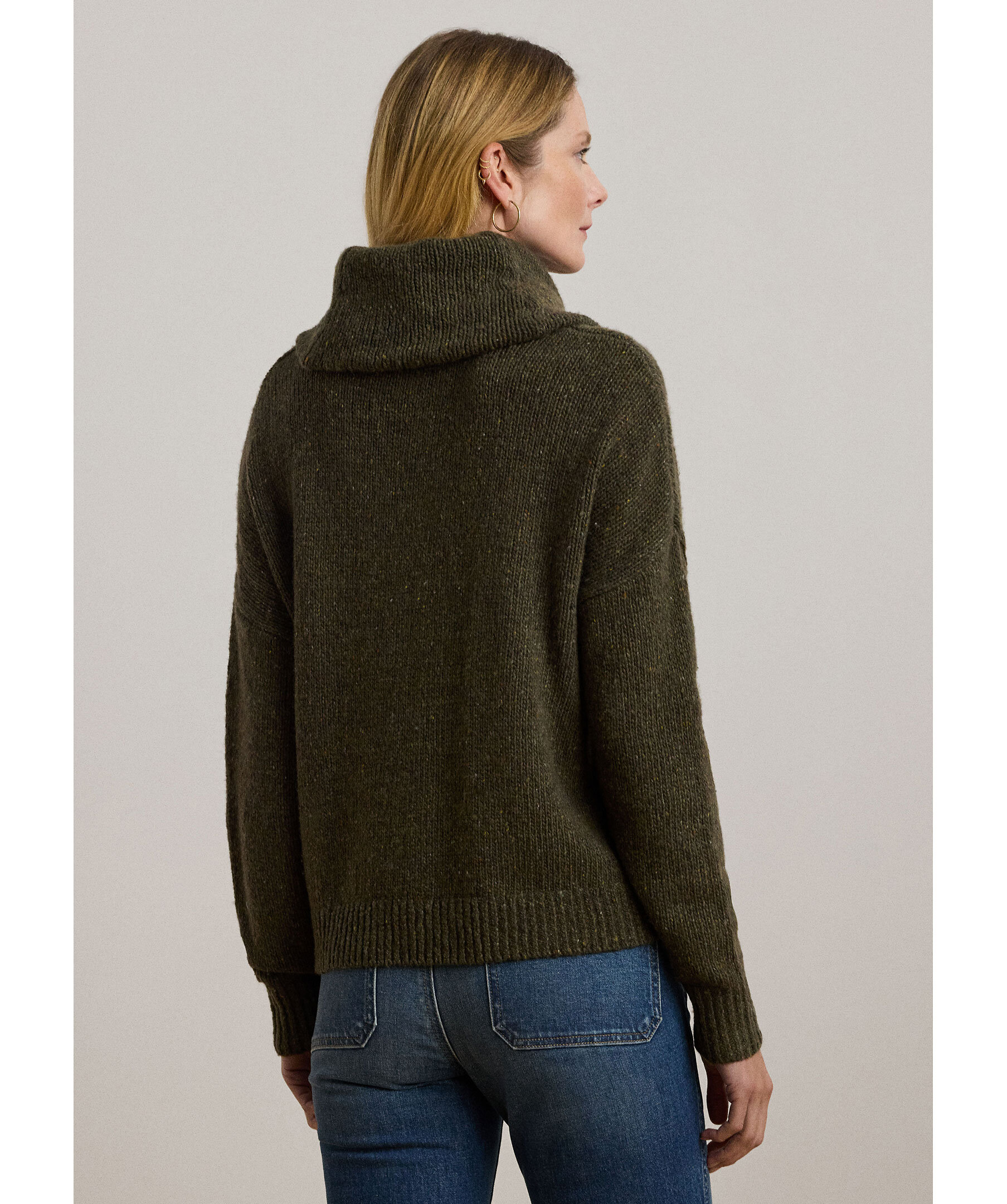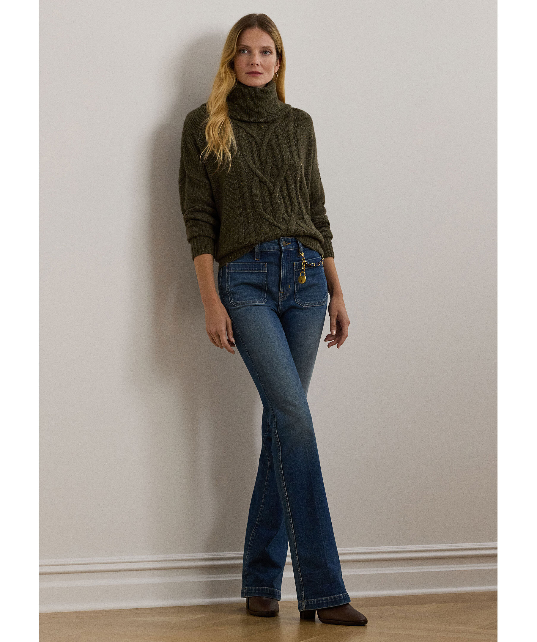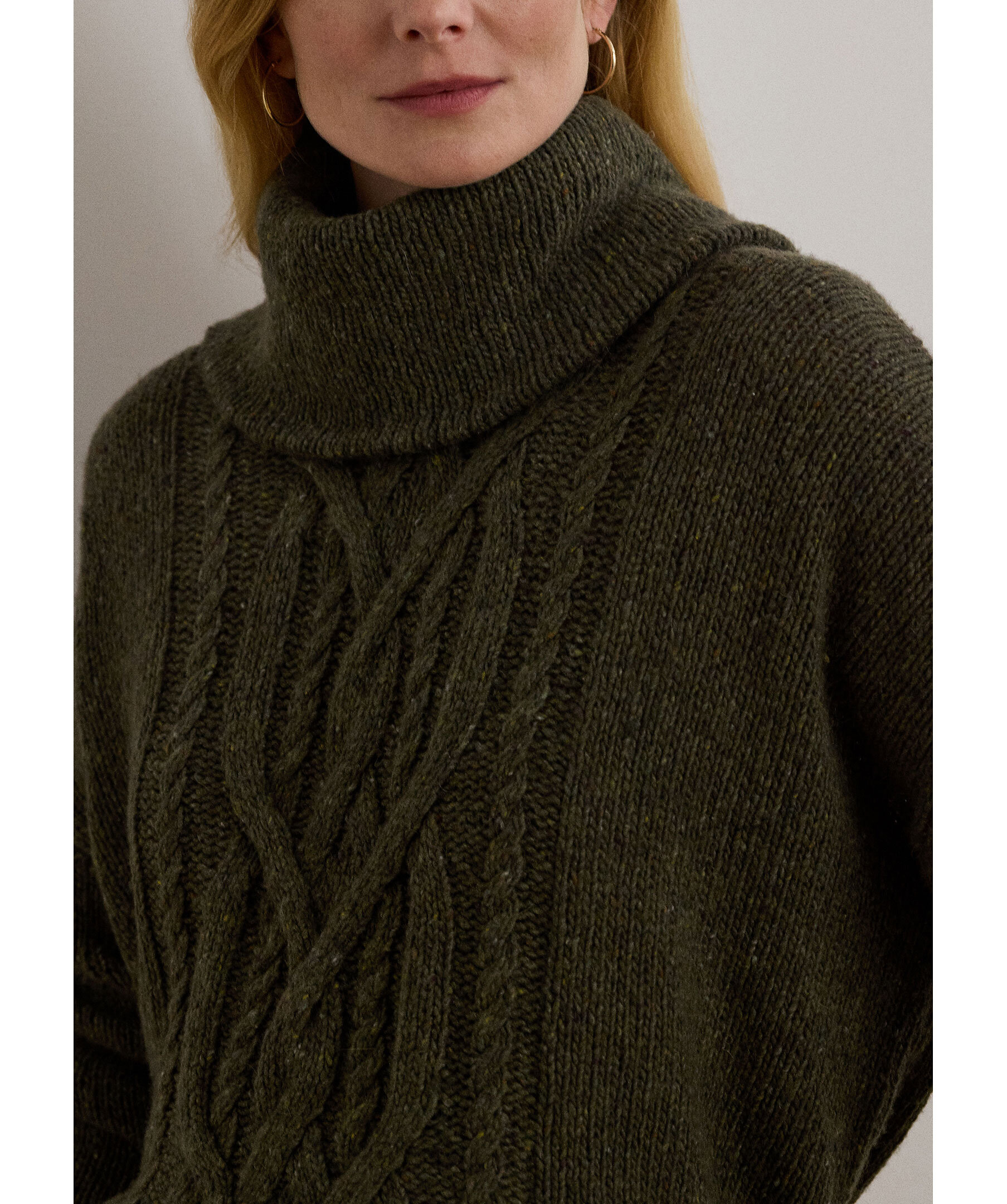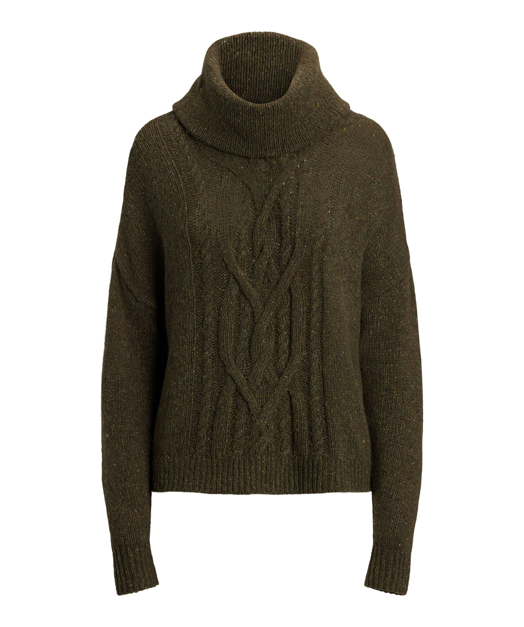 Stickad polotröja i olivgrönt från Lauren Ralph Lauren. Tröjan är gjord i en mjuk ullblandning och är stickad i ett aran mönster. Nedhasade axlar och en avslappnad passform förstärker den bekväma känslan.