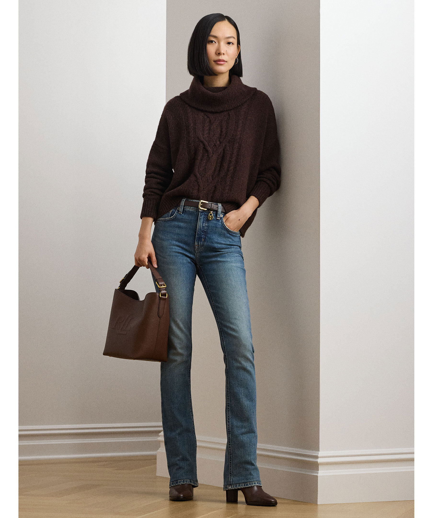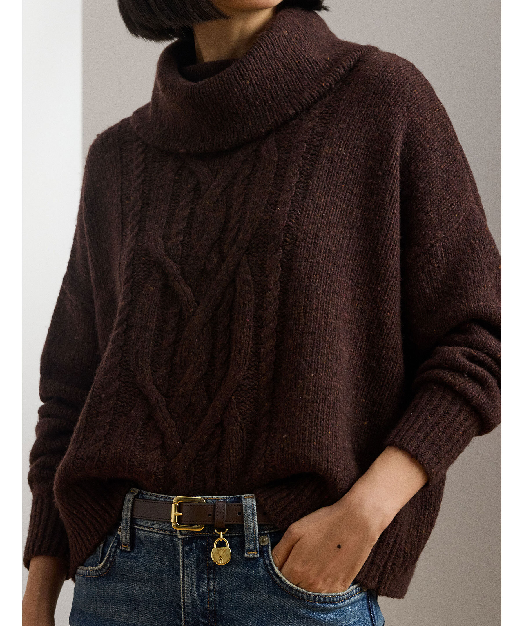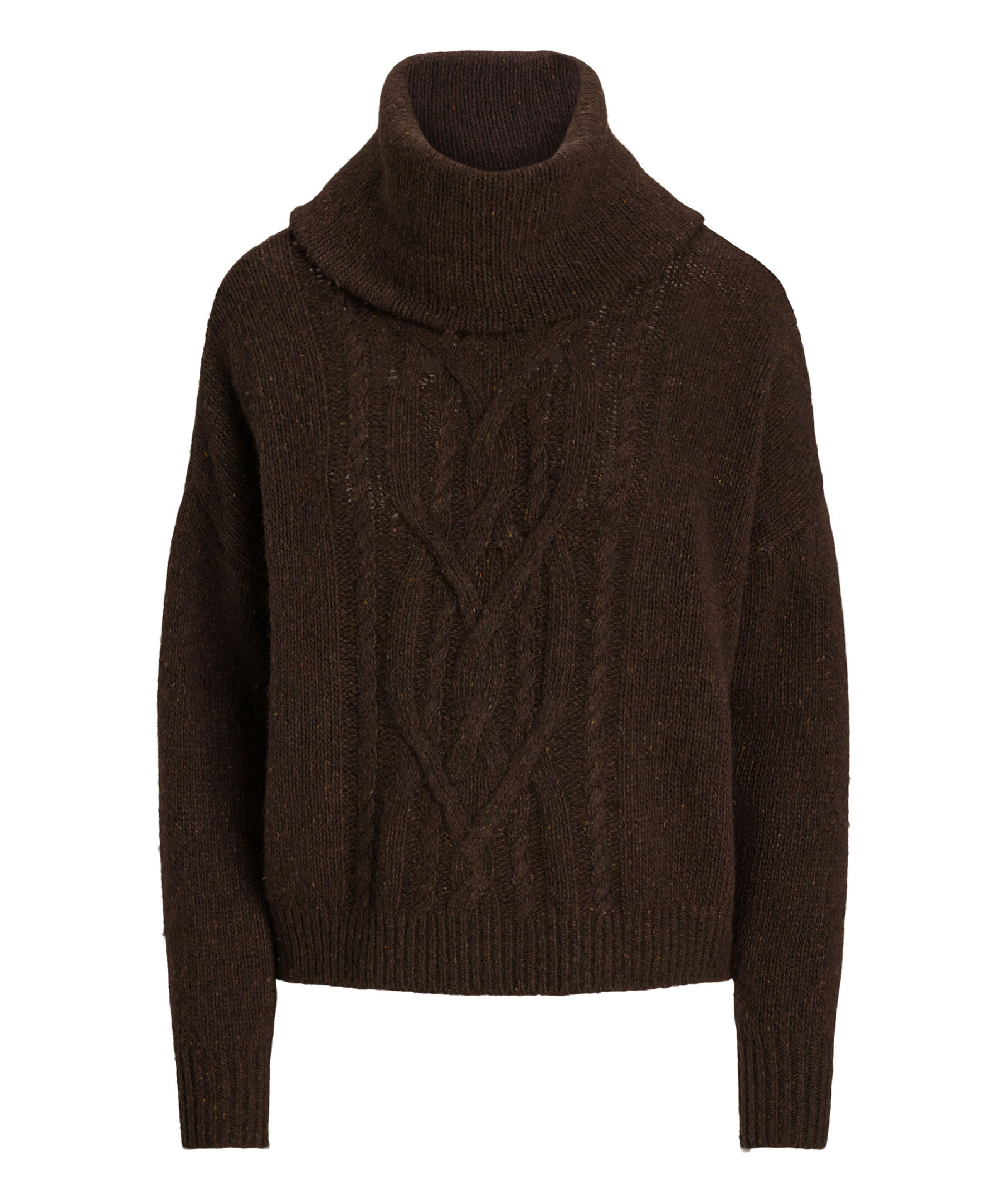 Stickad polotröja i brunt från Lauren Ralph Lauren. Tröjan är gjord i en mjuk ullblandning och är stickad i ett aran mönster. Nedhasade axlar och en avslappnad passform förstärker den bekväma känslan.