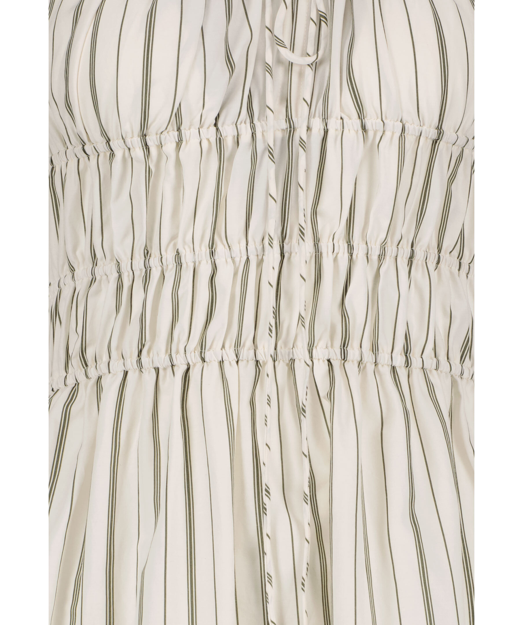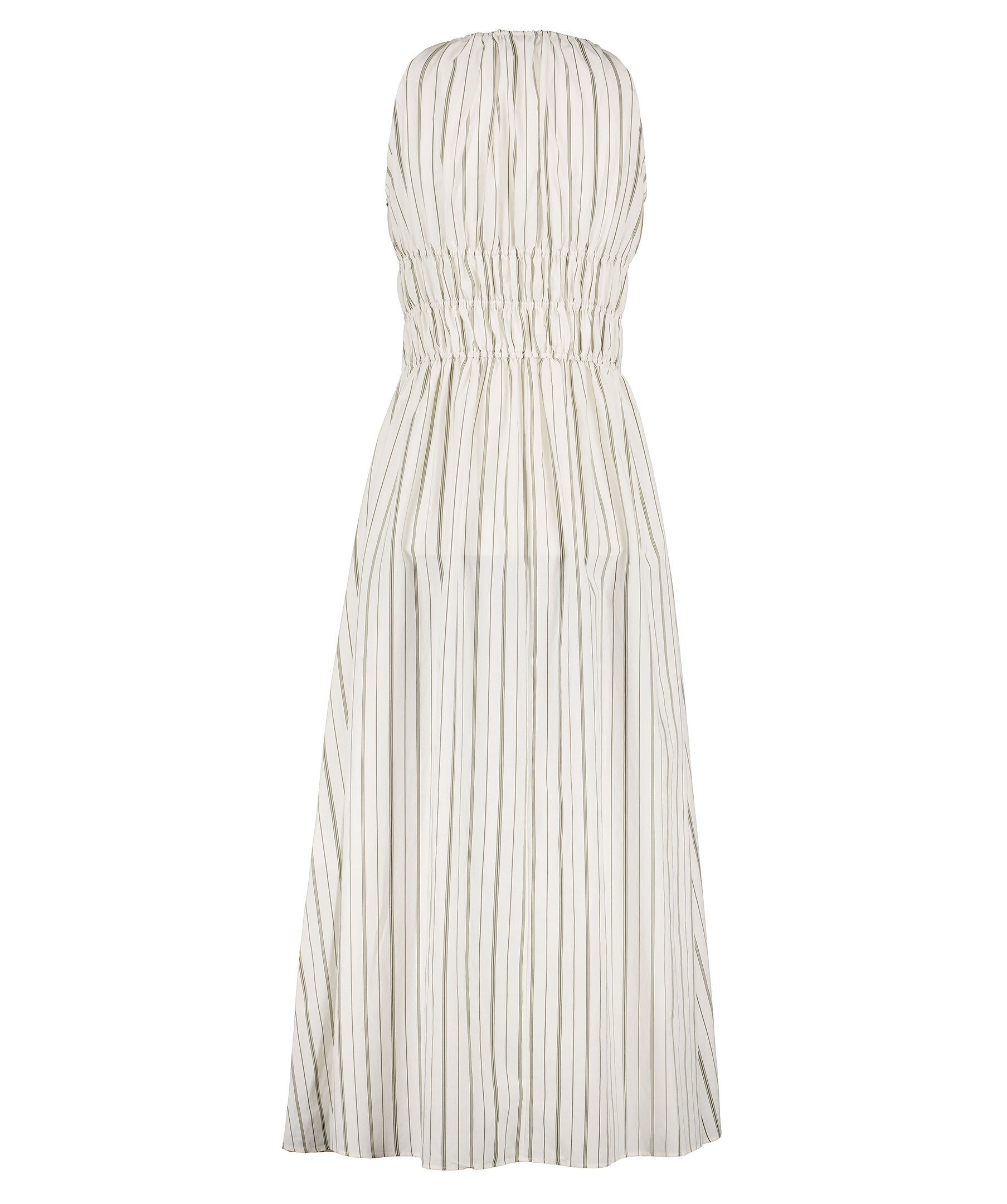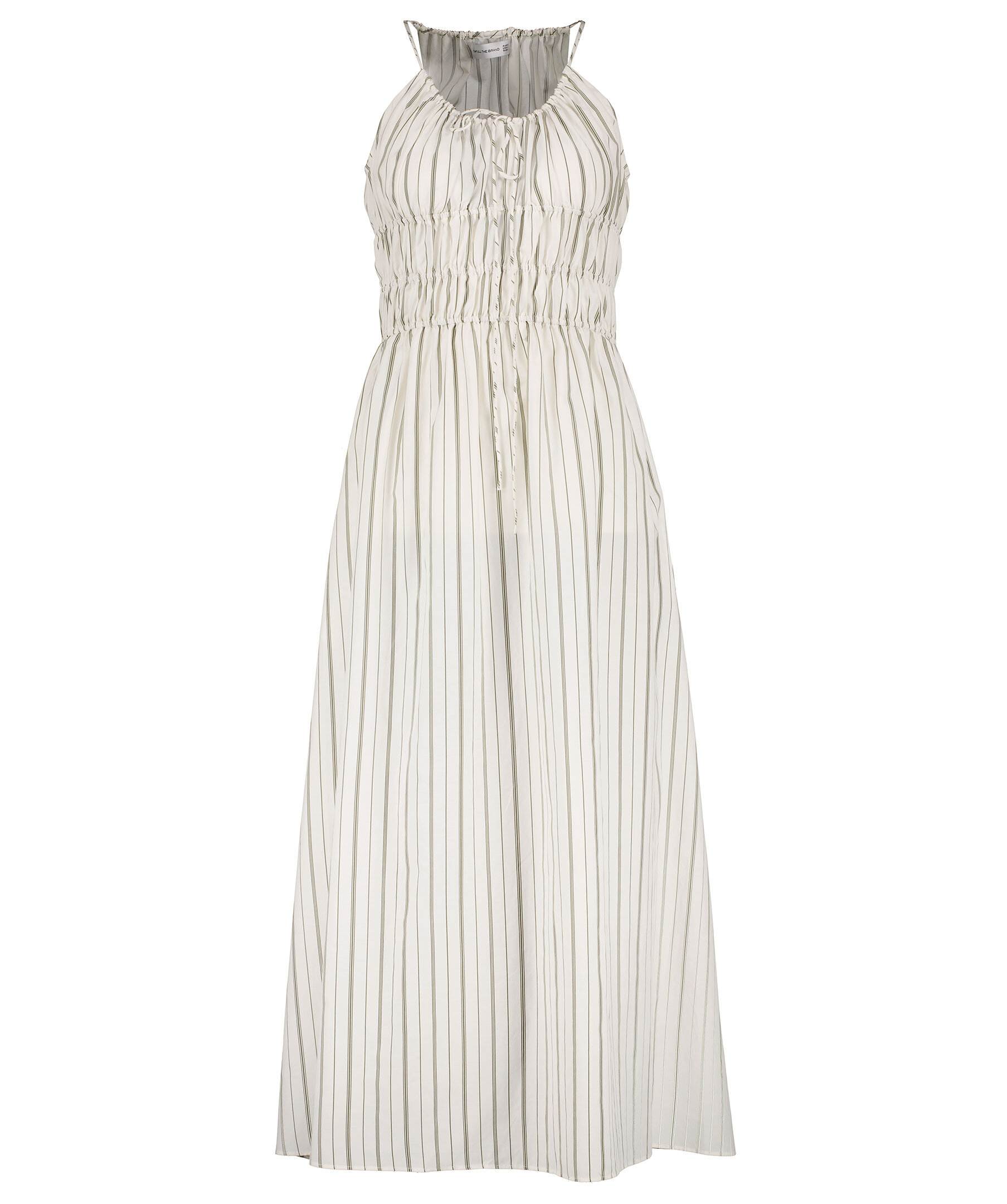 Randig midiklänning med smock från Faithfull the brand. Reglerbara axelband, rundad halsringning samt knytning vid bröstet.