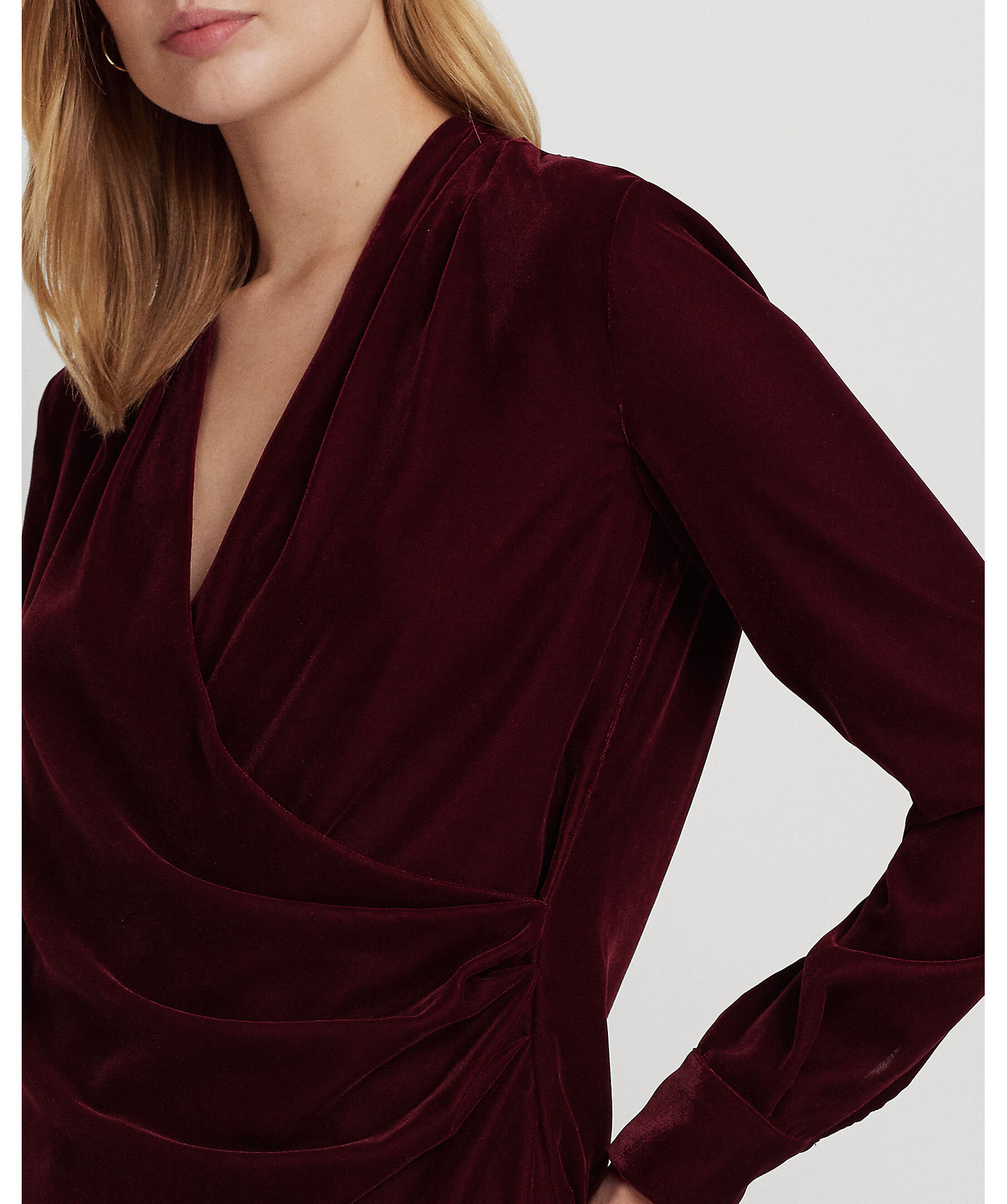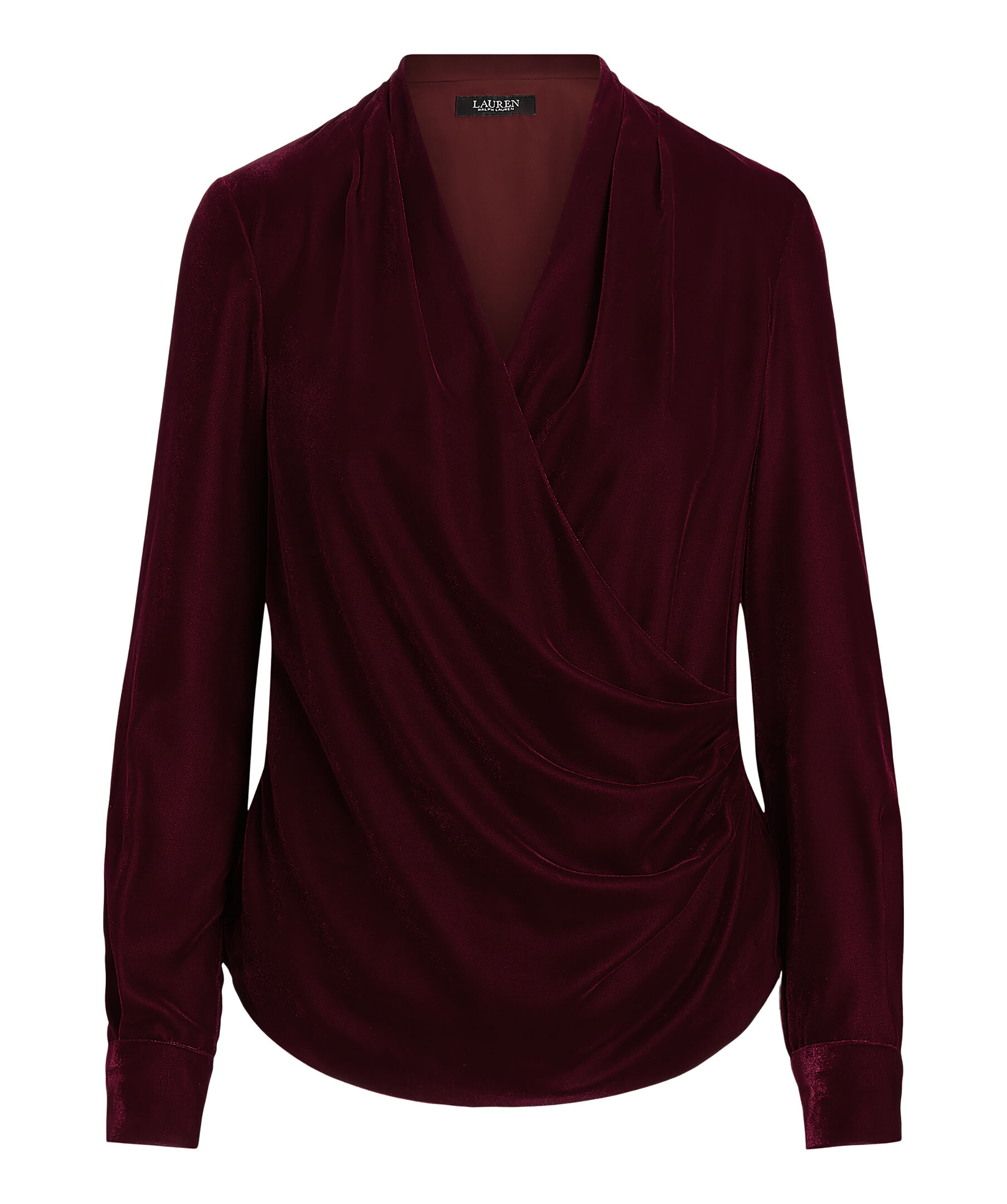 Vinröd velvet topp från Lauren Ralph Lauren. Eleganta veck förstärker överdragssilhuetten av denna blus, som är designad med romantiska blusärmar och "LRL"-graverade knappar. Klippt för en avslappnad passform, denna förhöjda essential är gjord i lyxig sammet. Veckning på främre axlarna och framstycket.