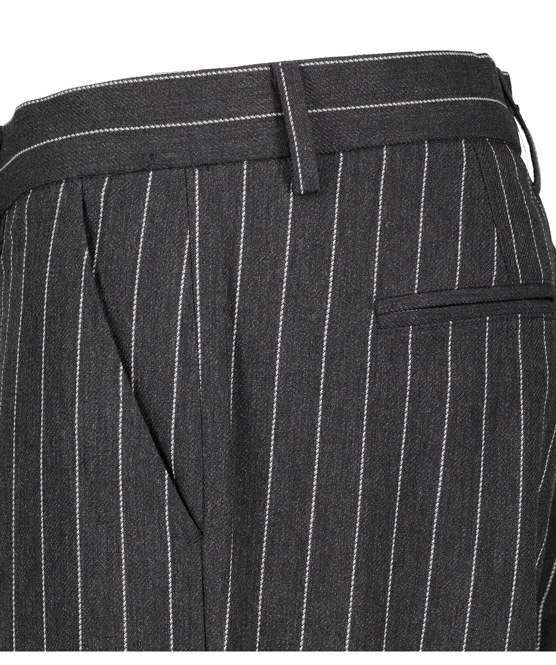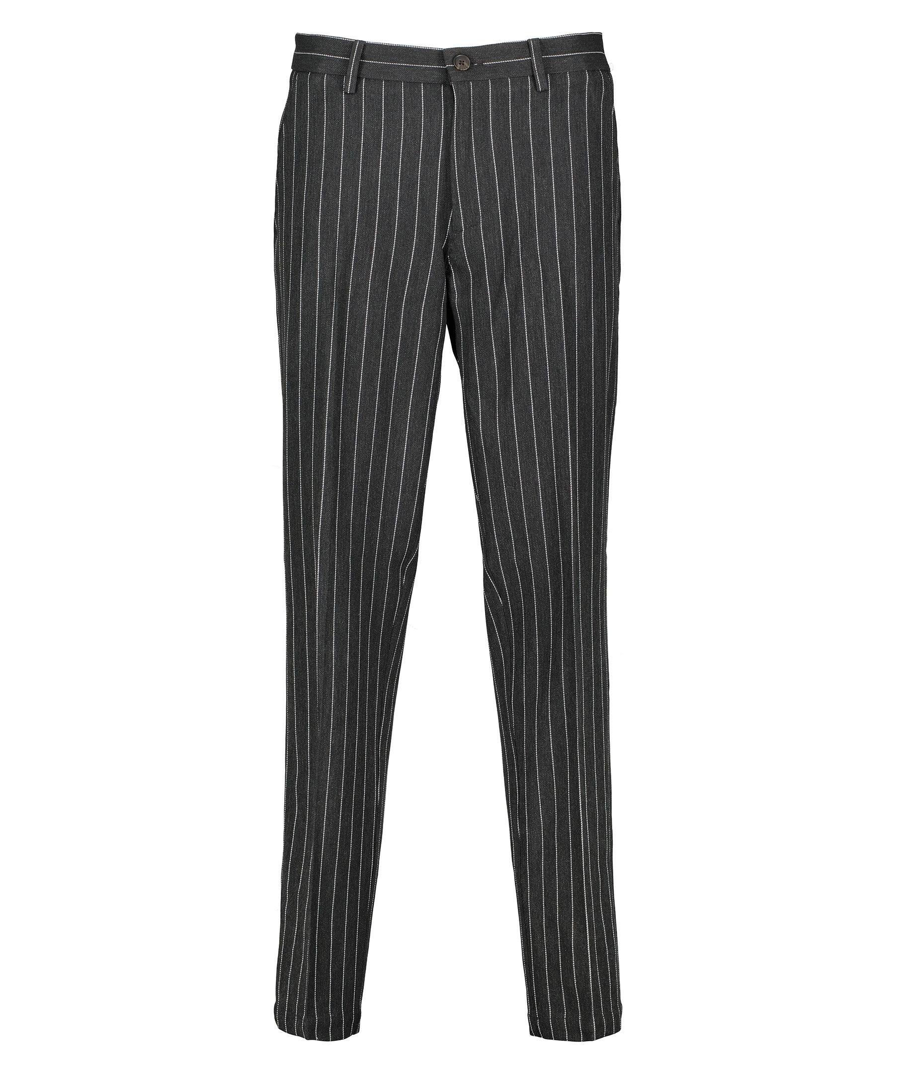 Mörkgråa kostymbyxor från Les Deux med vertikala ränder. Stängs med dragkedja och knapp, bälteshällor i midjan. Två sidfickor samt två passpoalfickor baktill. Broderar logotyp ovanför ena bakfickan. Pressveck. Tillverkade i en ullblandning.