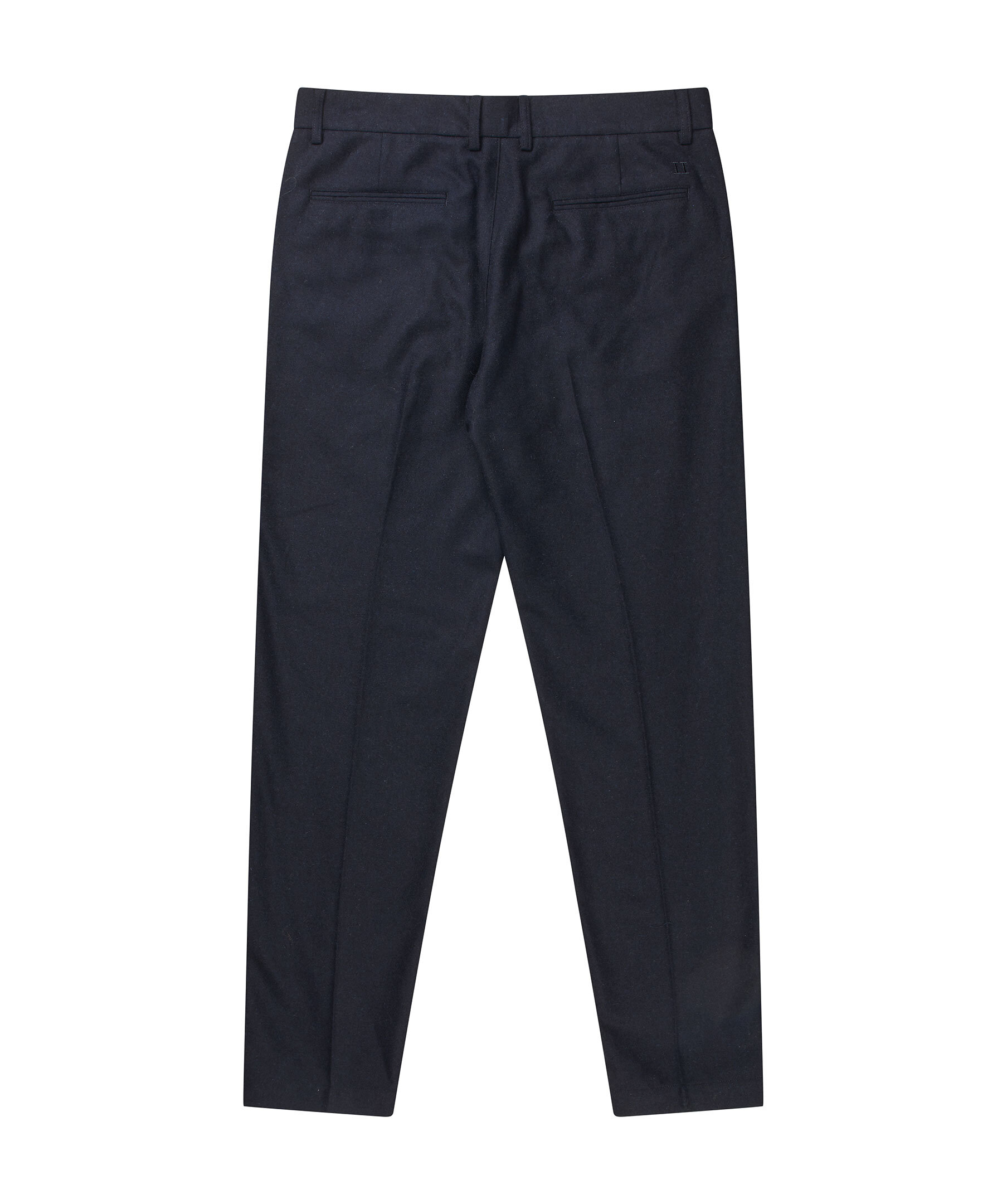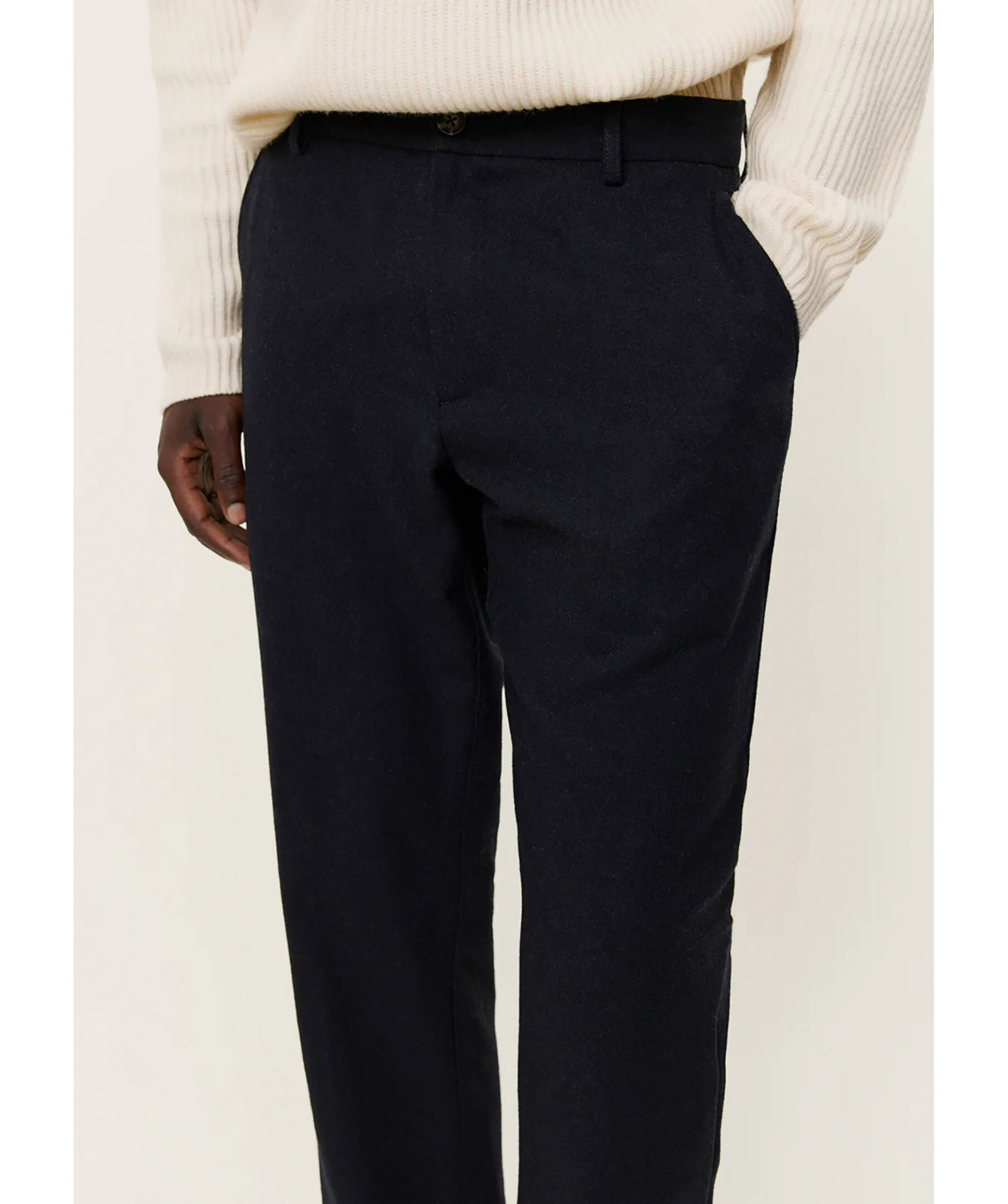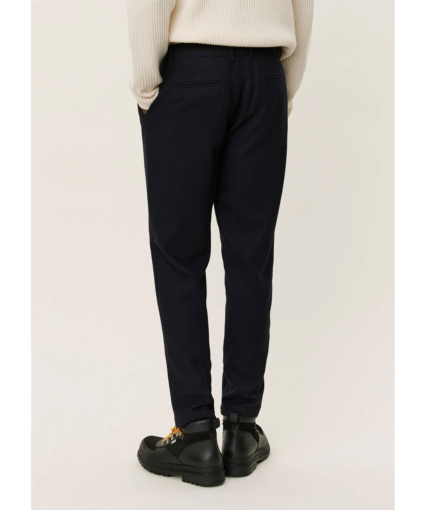 Mörkblåa kostymbyxor i borstad ullblandning från Les Deux. Byxorna har silkeslent innerfoder, pressveck, två sidfickor, två passpoalbakfickor med broderad logotyp samt bälteshällor i midjan.