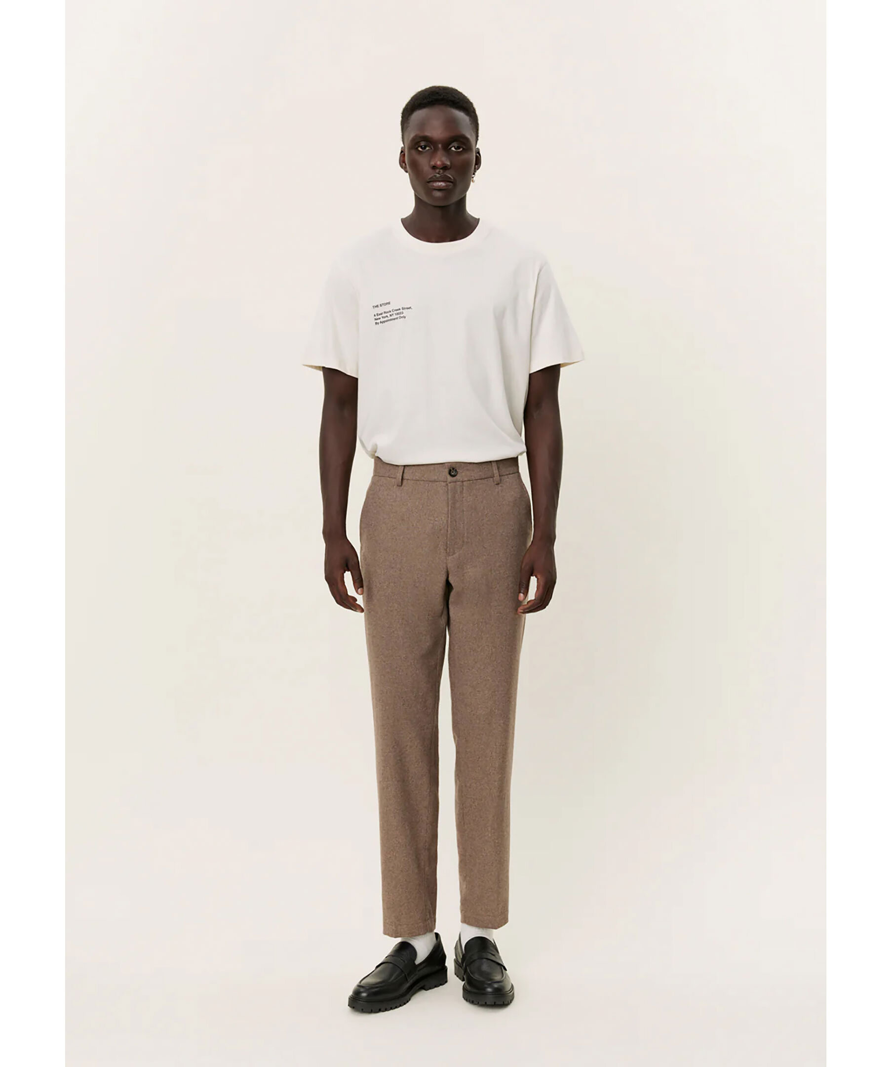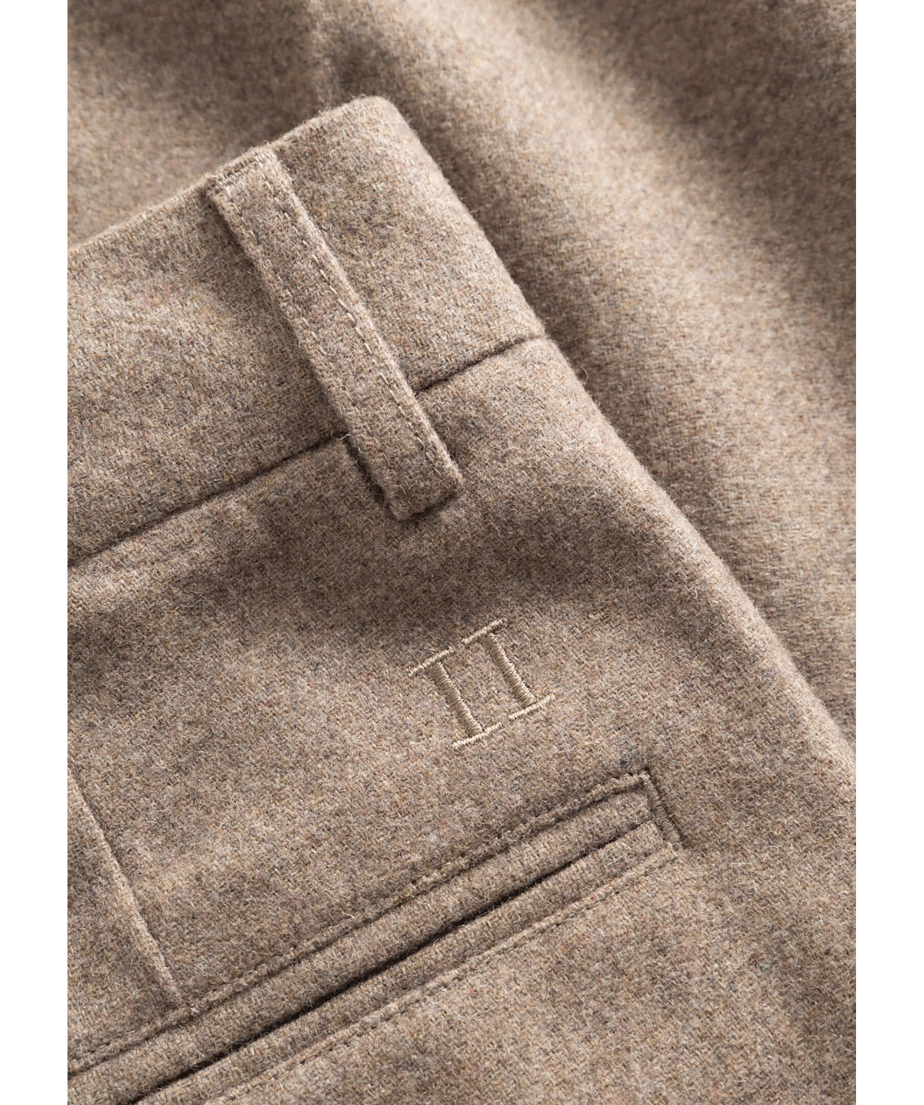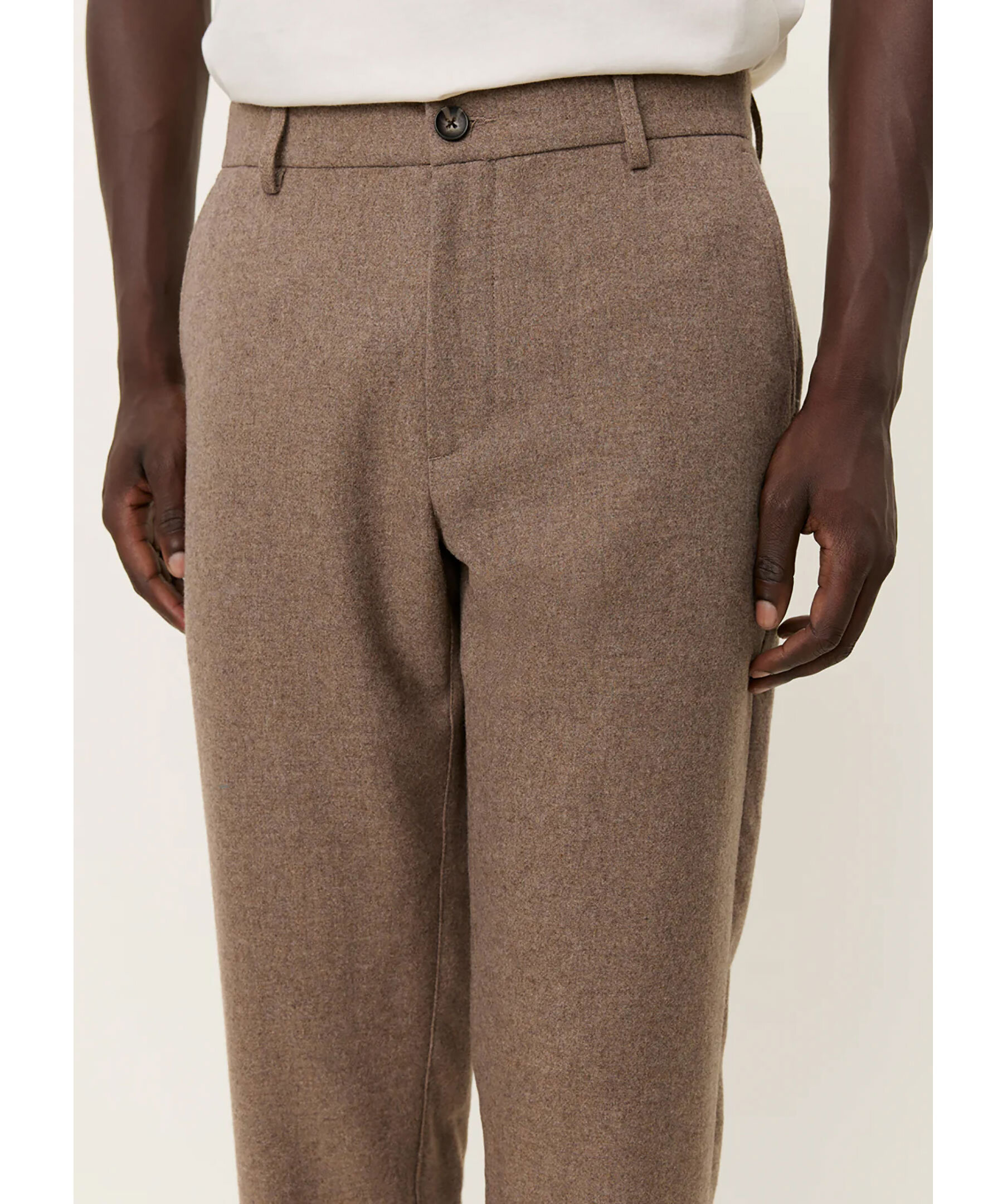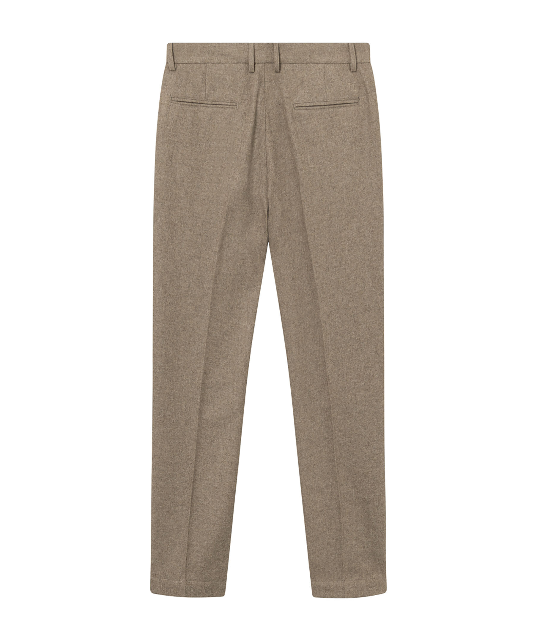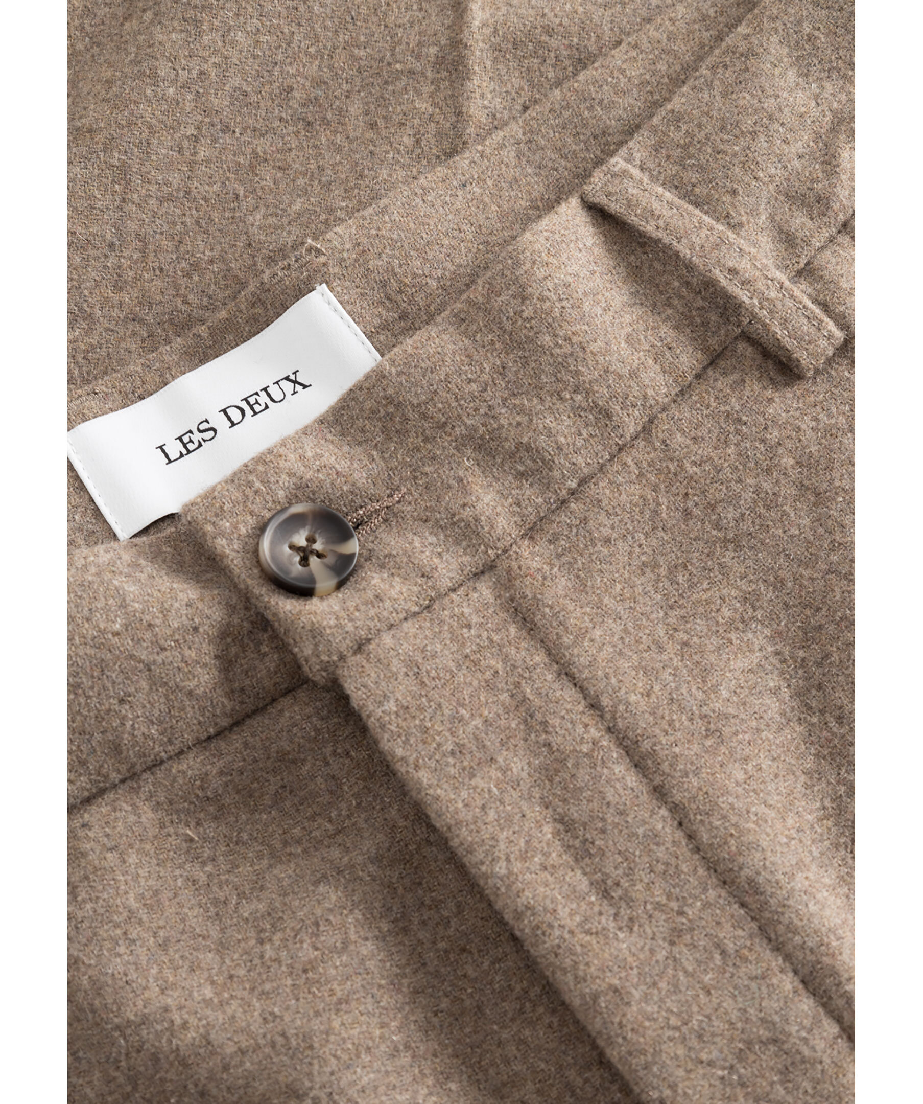 Bruna kostymbyxor i borstad ullblandning från Les Deux. Byxorna har silkeslent innerfoder, pressveck, två sidfickor, två passpoalbakfickor med broderad logotyp samt bälteshällor i midjan.