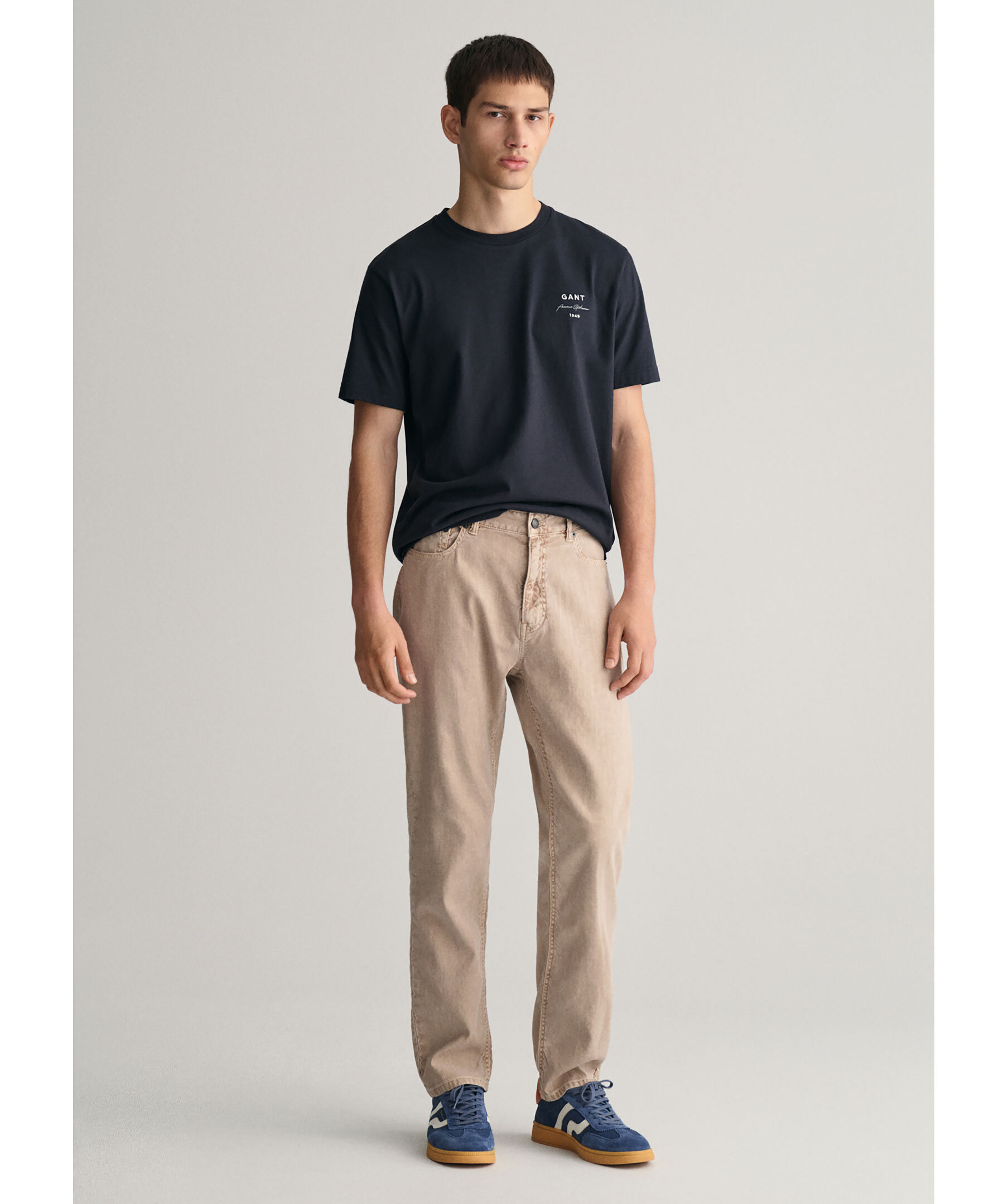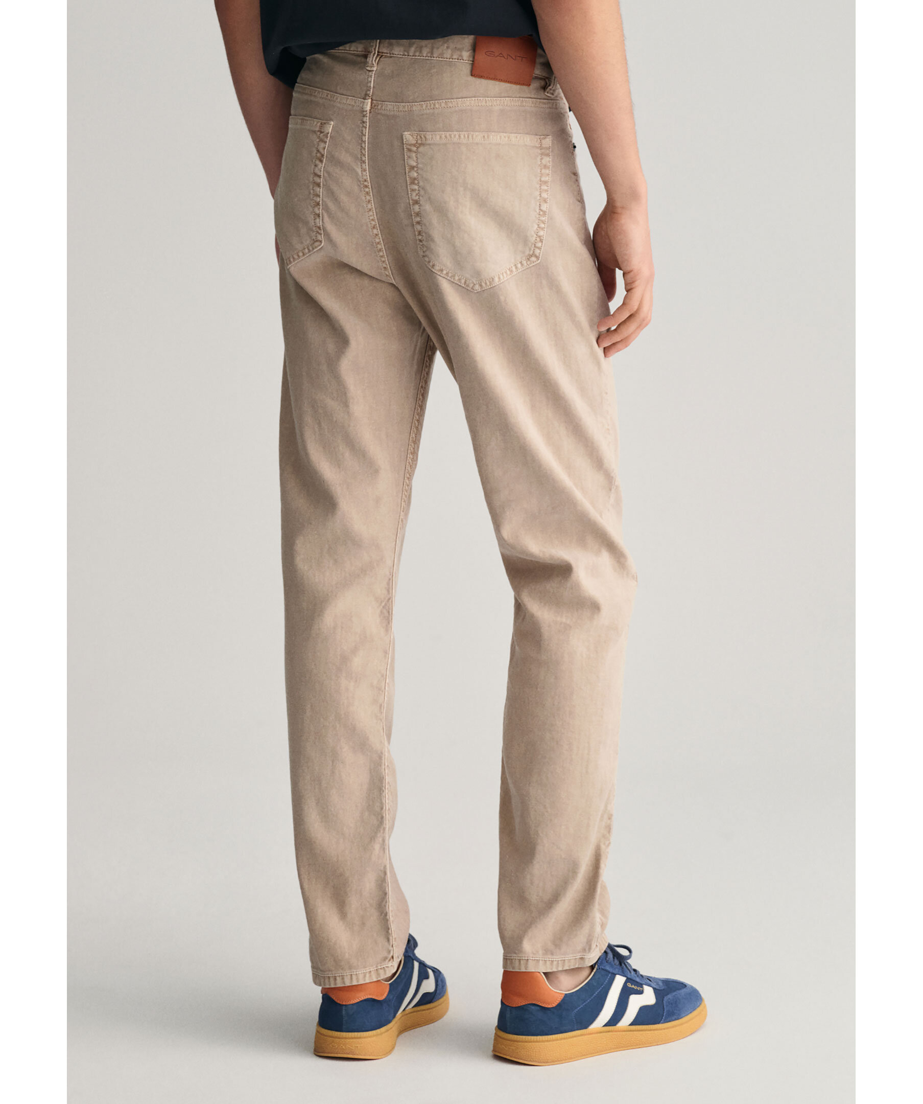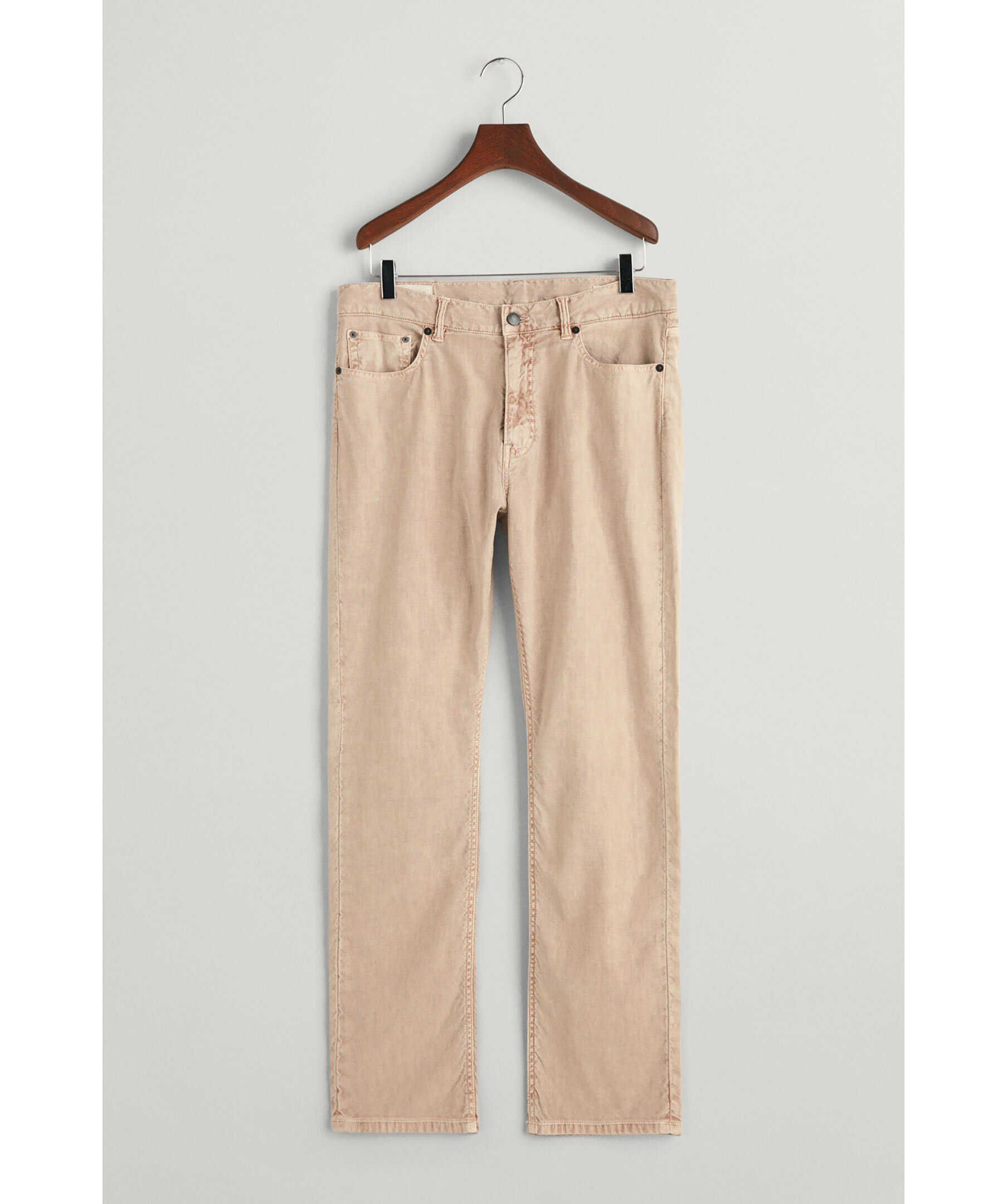 Beigea Jeans Bomull och Linne blandning från Gant i rak modell. Plaggfärgade med en tvättad finish. Fem fickor. Hällor för bälte. Patch i läder med embossad logotyp på höger sida.