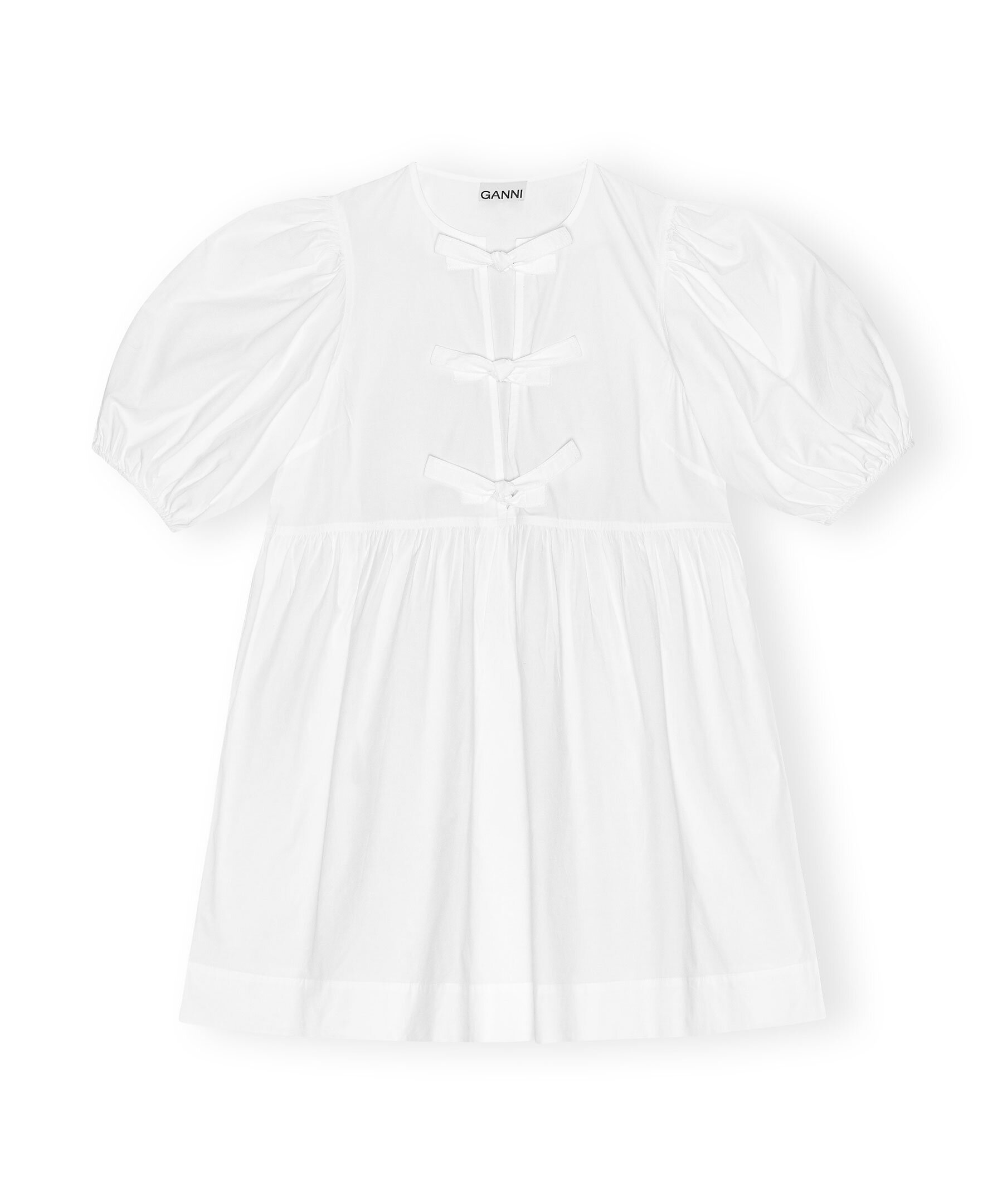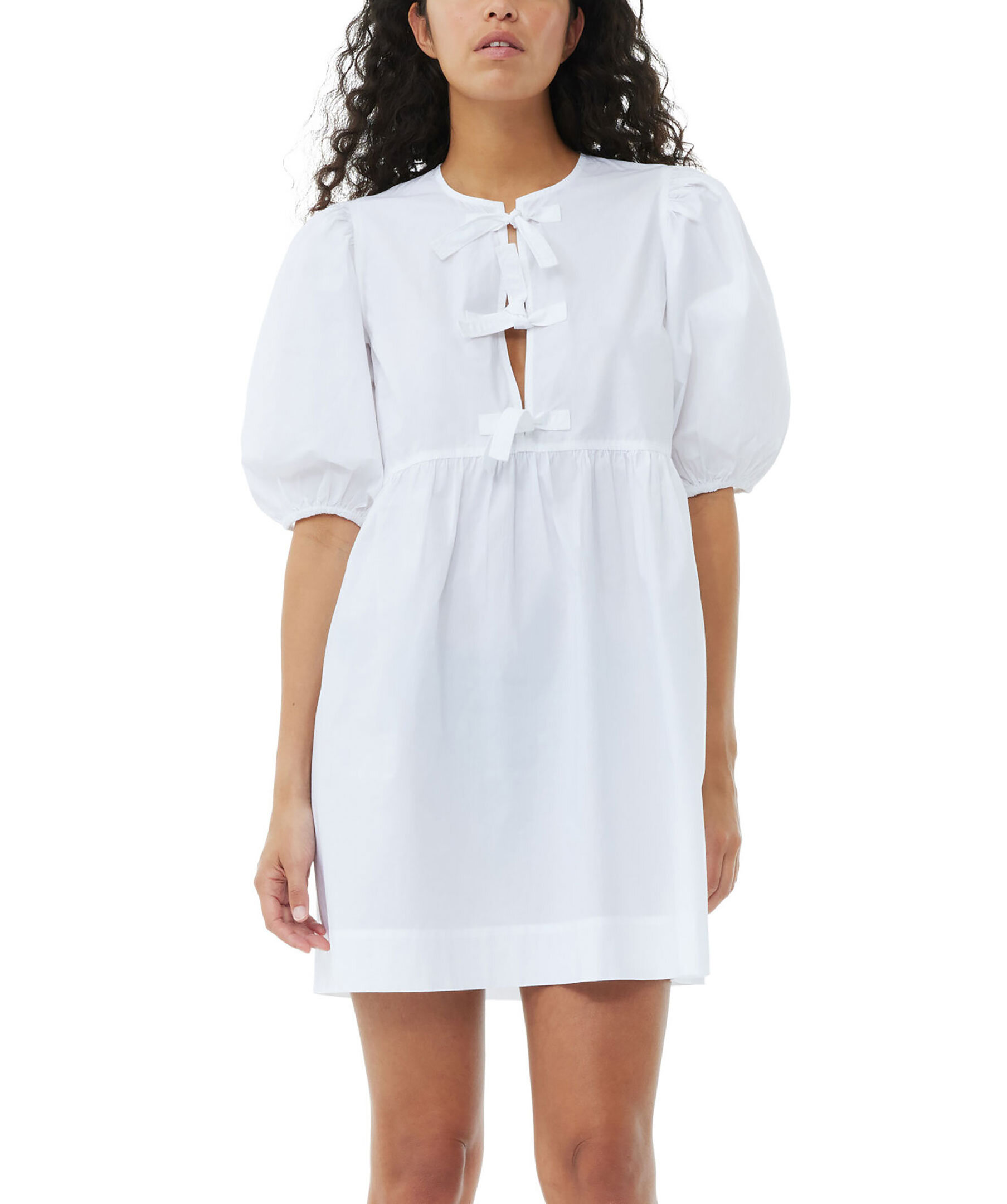Vit miniklänning från Ganni. Puffärmar med elastiska kanter, rund halsringning och knytdetaljer.