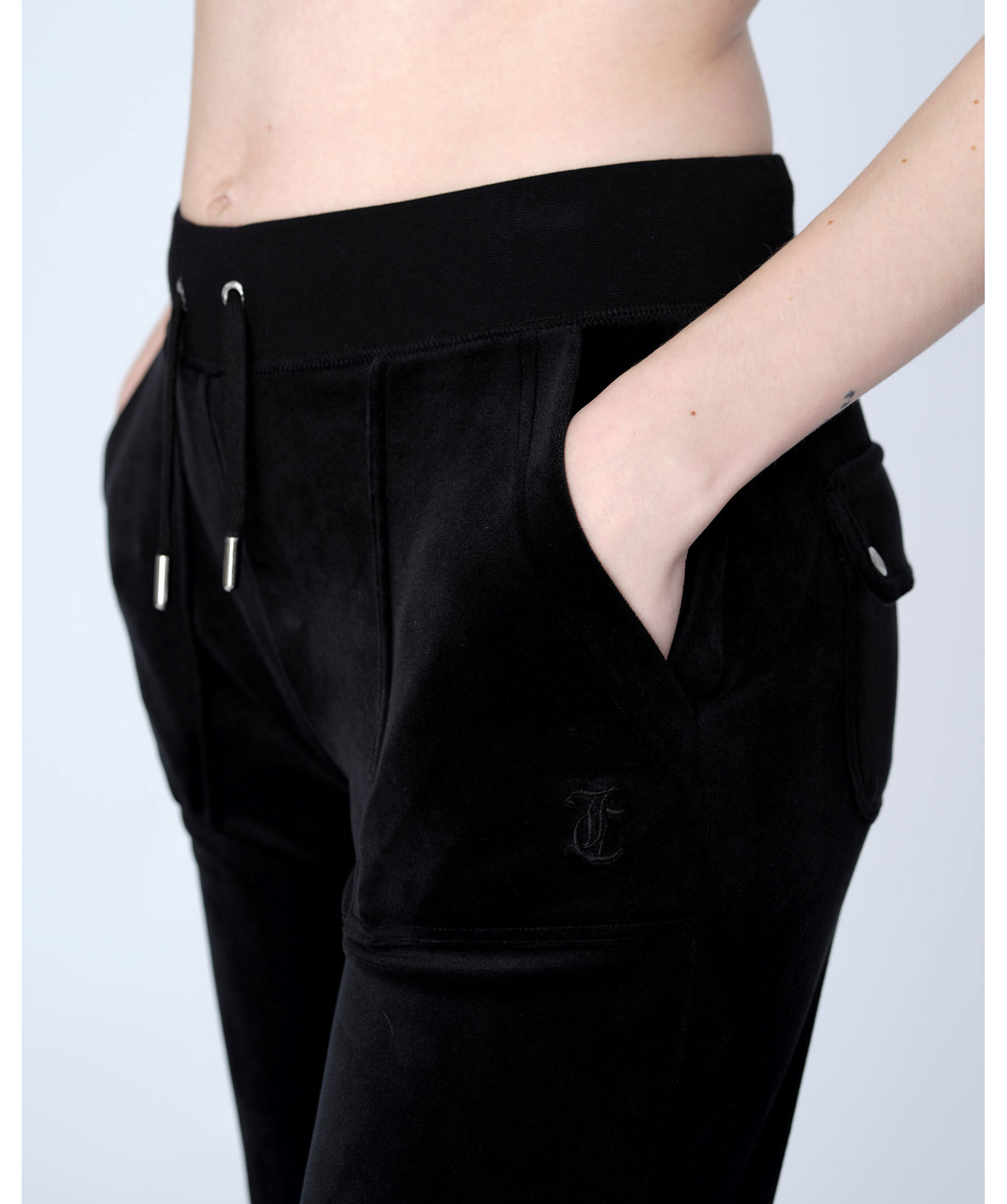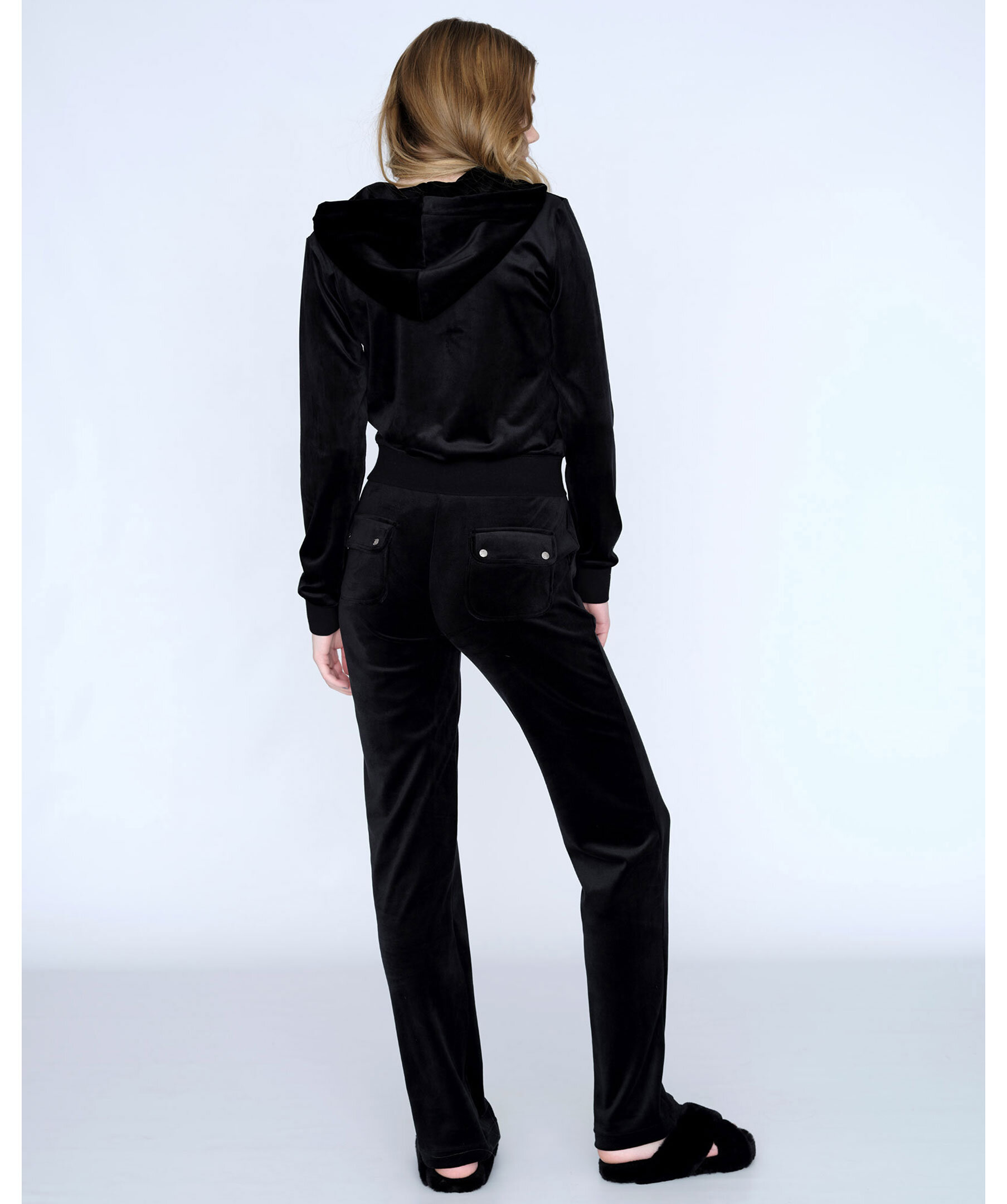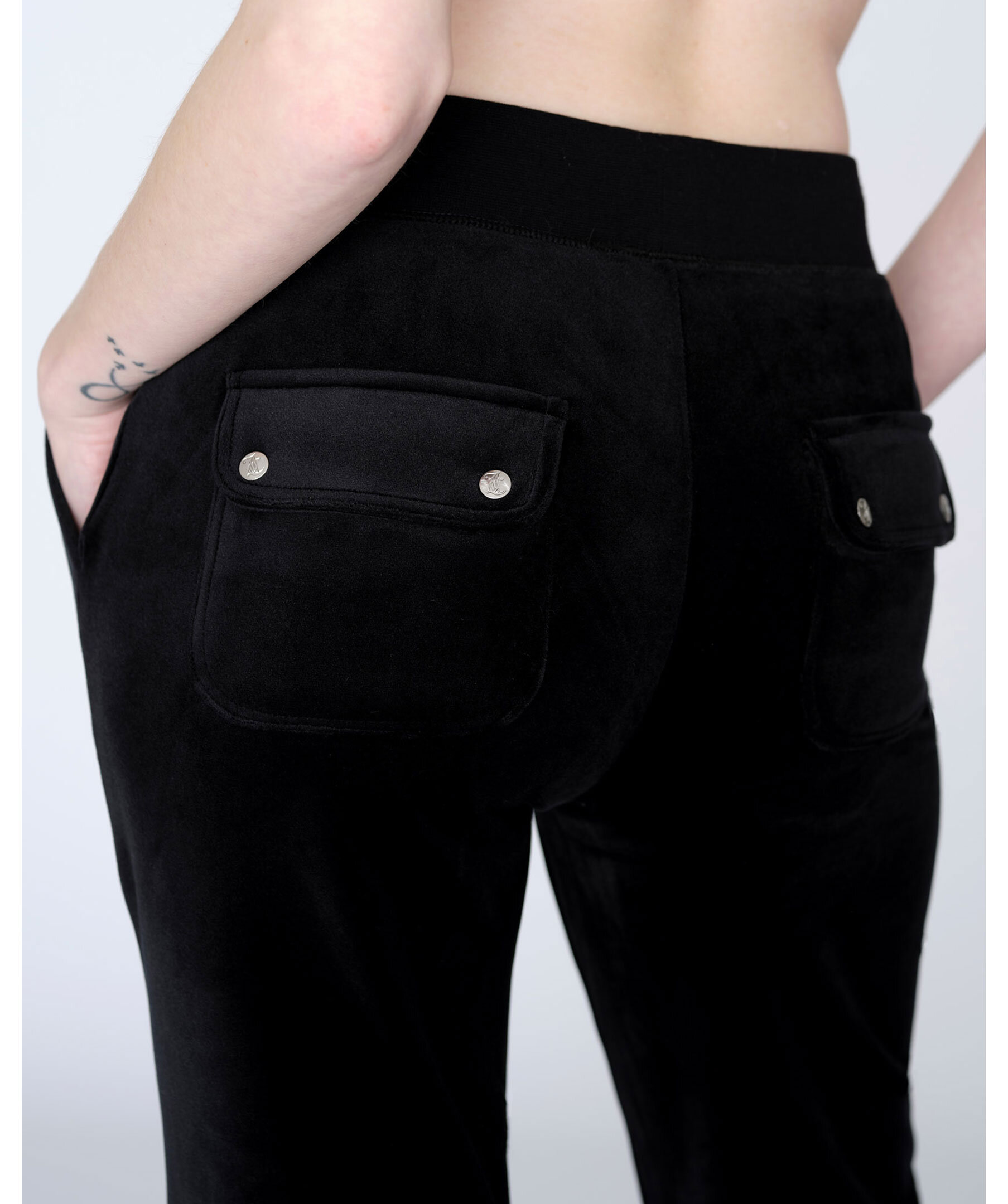 Byxor i velour i färgen black från Juicy Couture. Bred resårkant i midjan med snörning, fickor i sidorna och bakfickor med ficklock och tryckknappar med logotyp. Rak modell Broderad logga framtill på vänster ficka.