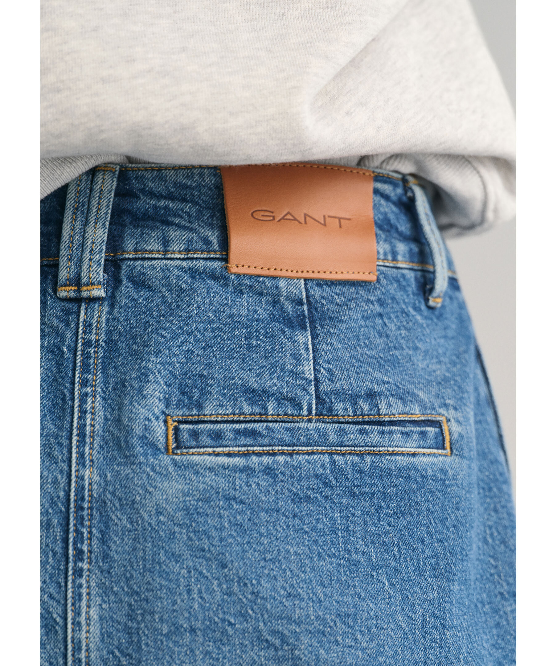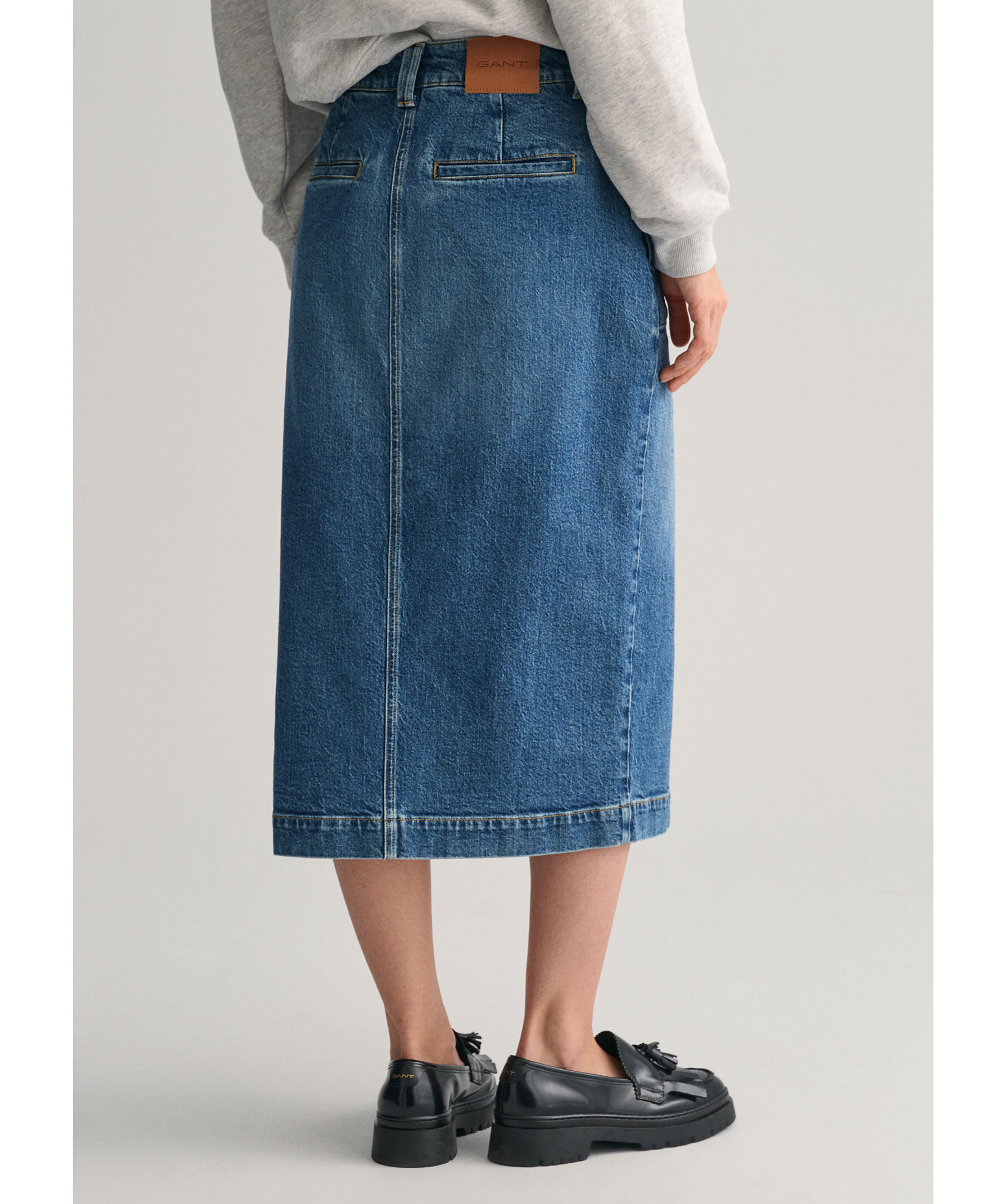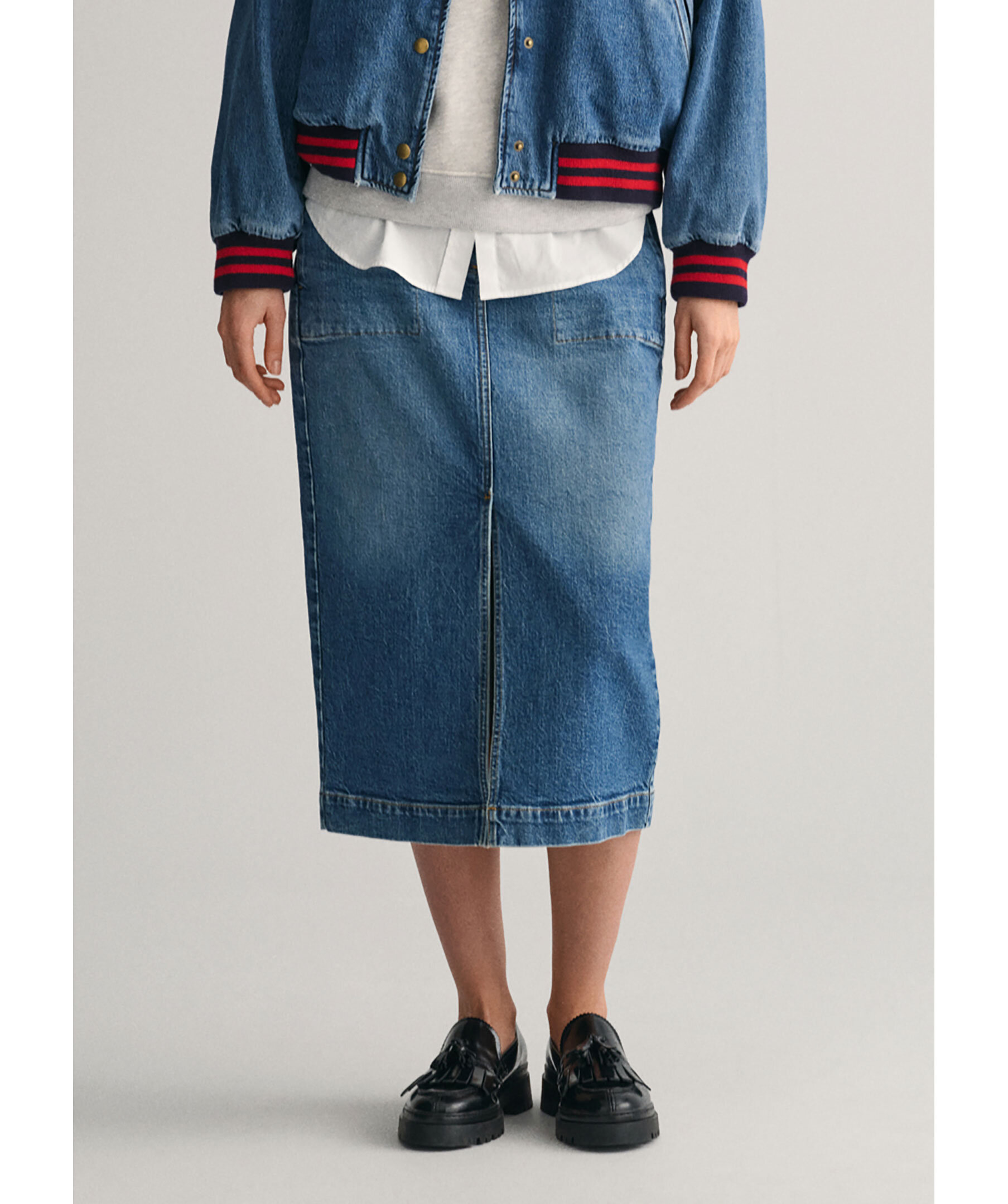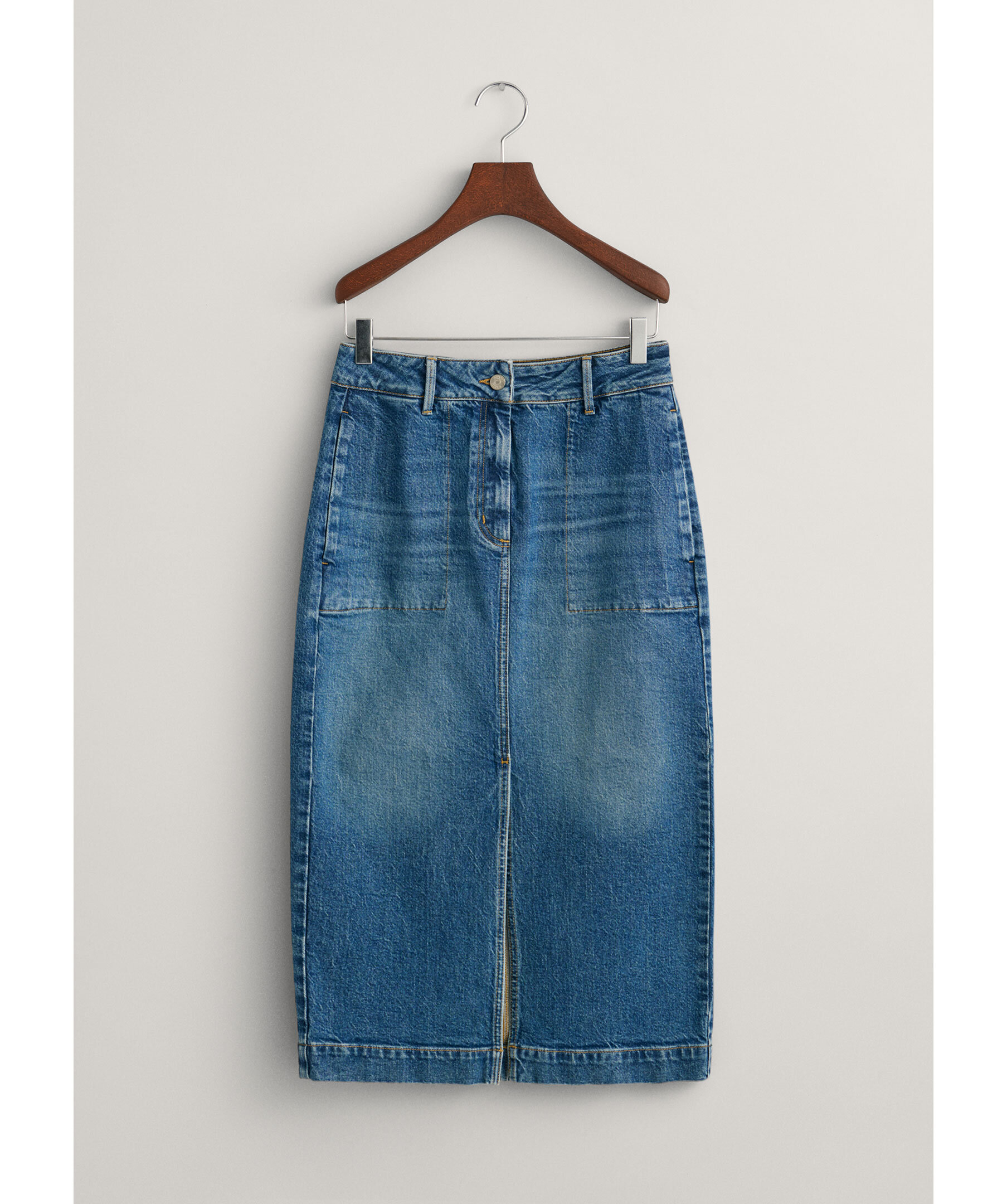 Mörk indigofärgad denimkjol från Gant. Kjolen har smal passform med mellanhög midja. Slutar strax nedanför knät. Den har sprund framtill, två sidfickor samt två passpoalfickor bak. Tillverkad i en stretchig bomullsblandning.