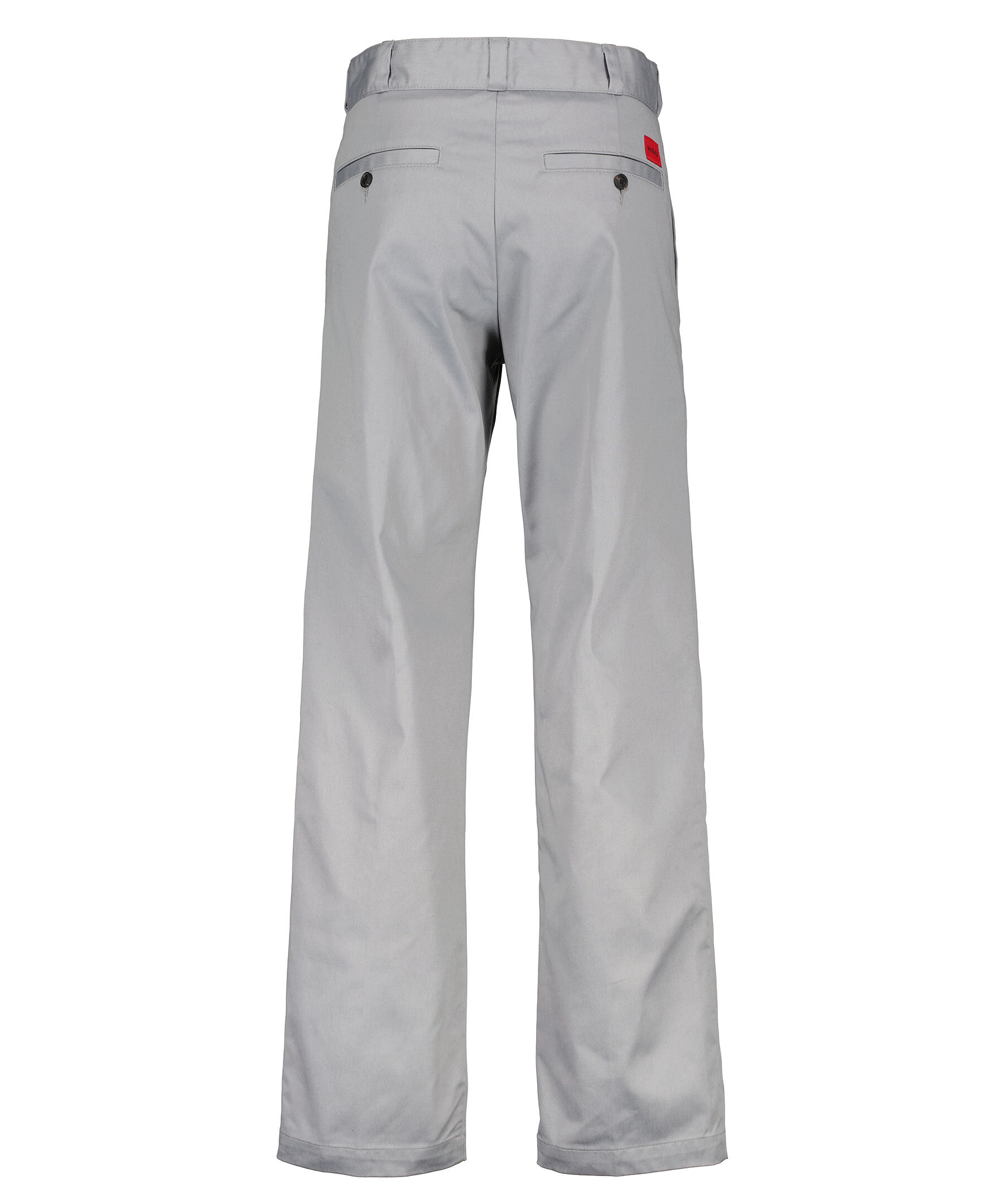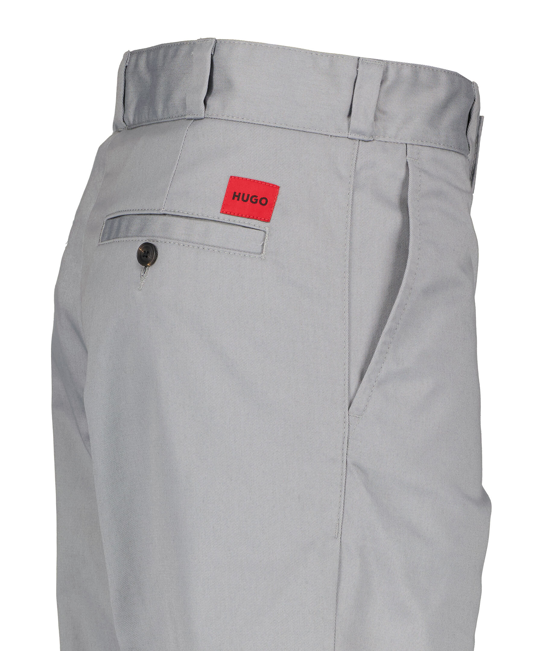 Gråa chino-jeans från HUGO. Bälteshällor i midjan. Två sidfickor och två bakfickor med knapp.Röd logotyp ovanför ena bakfickan. Pressveck. Tillverkade i en polyester- och bomullsblandning.