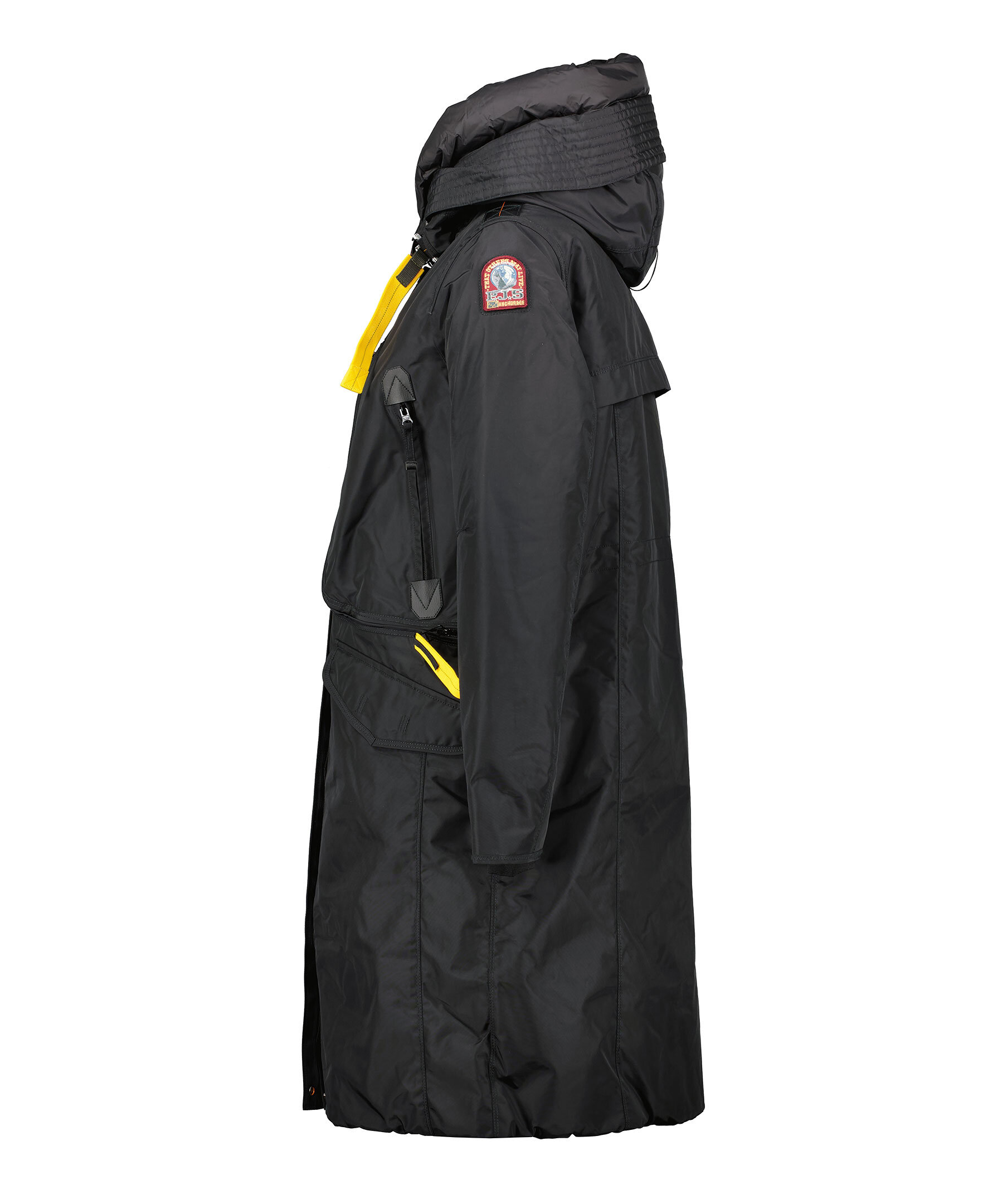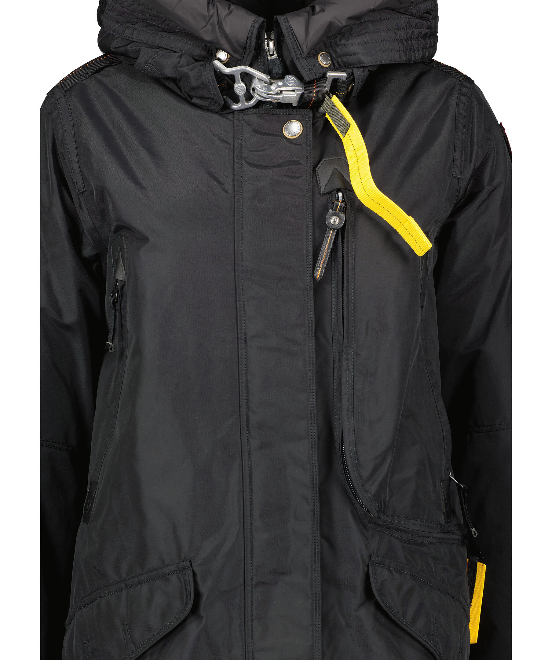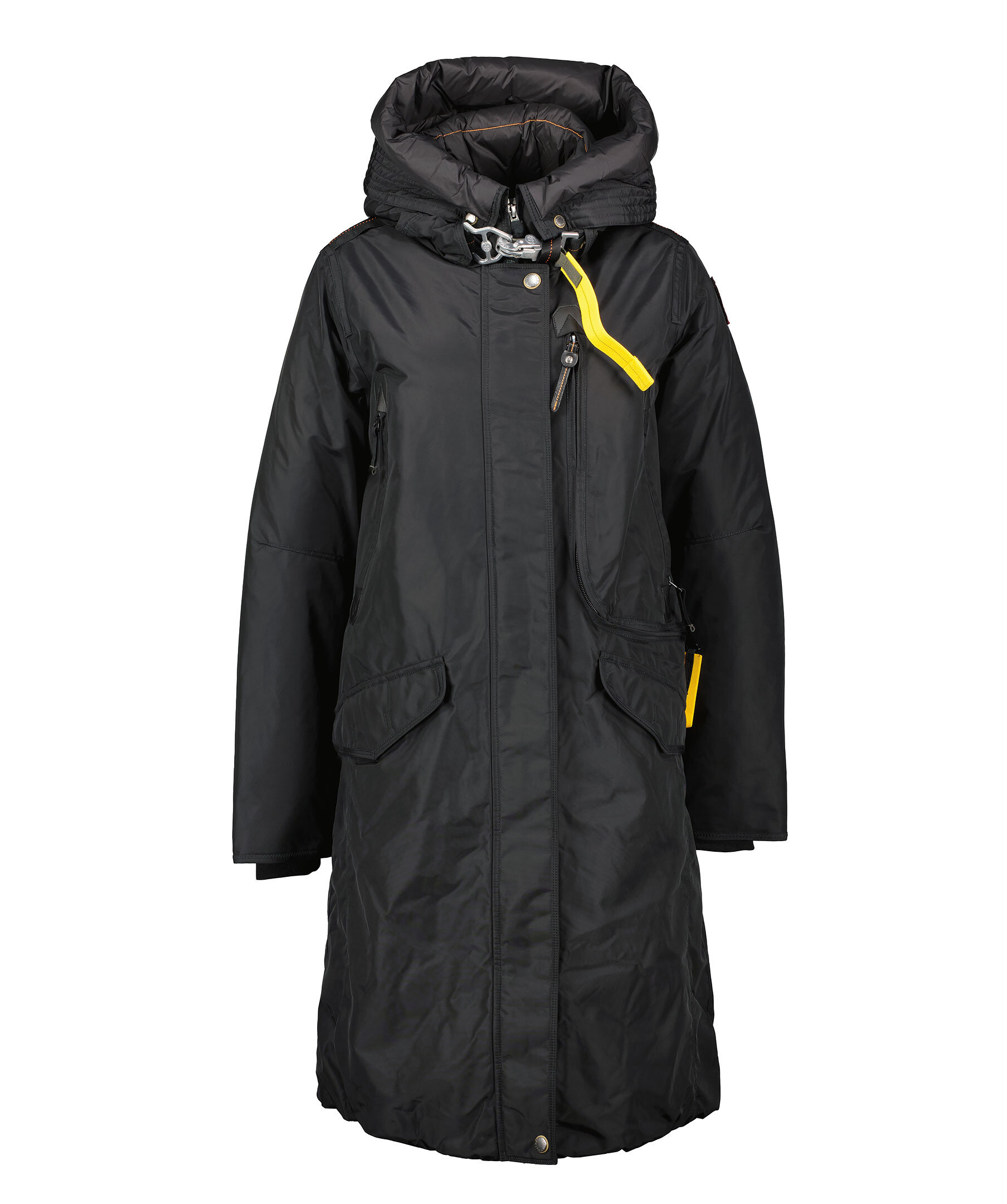 Svart, lång parkajacka med huva från Parajumpers. Jackan stängs med dold tvåvägsdragkedja och tryckknappar framtill. Den har två sidfickor med lock och tryckknapp, tre bröstfickor, patch-logotyp på vänster ärm samt deras ikoniska gula flärp framtill. Tillverkad i polyamid. ■ OBS! Modellbilderna visar endast passform