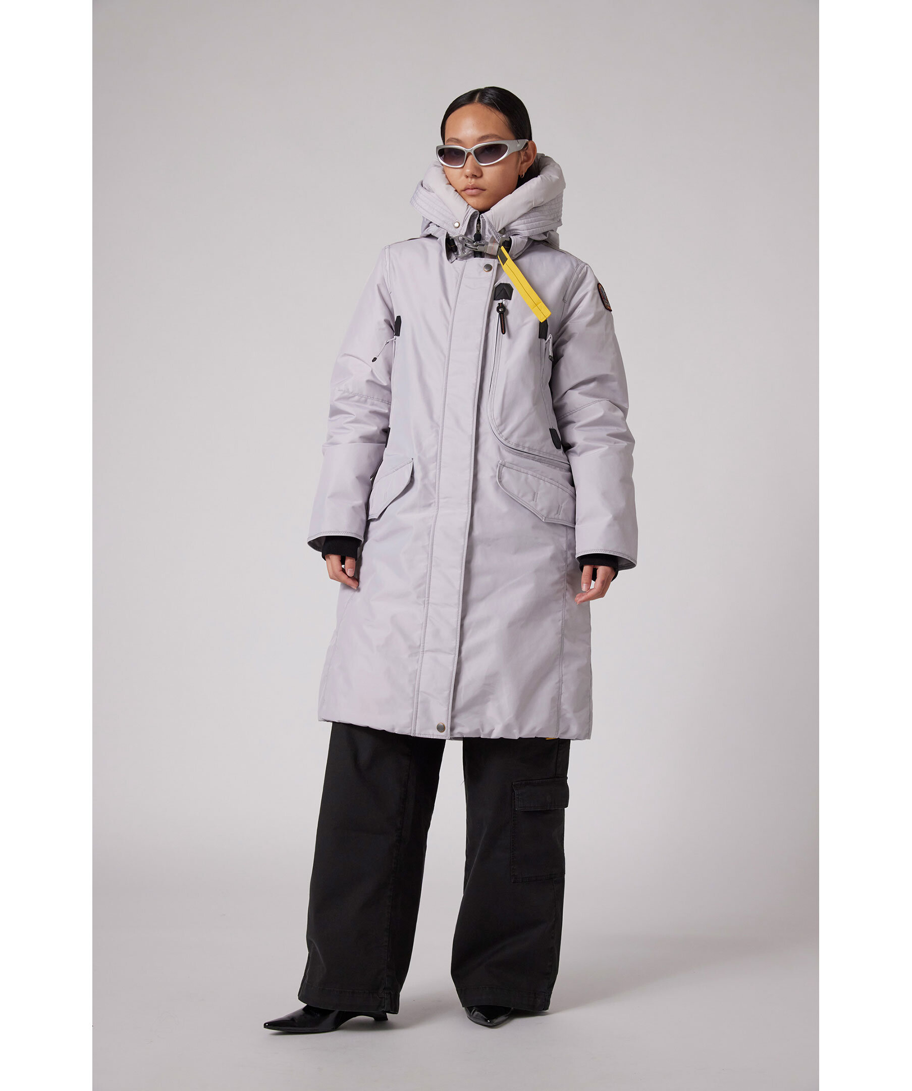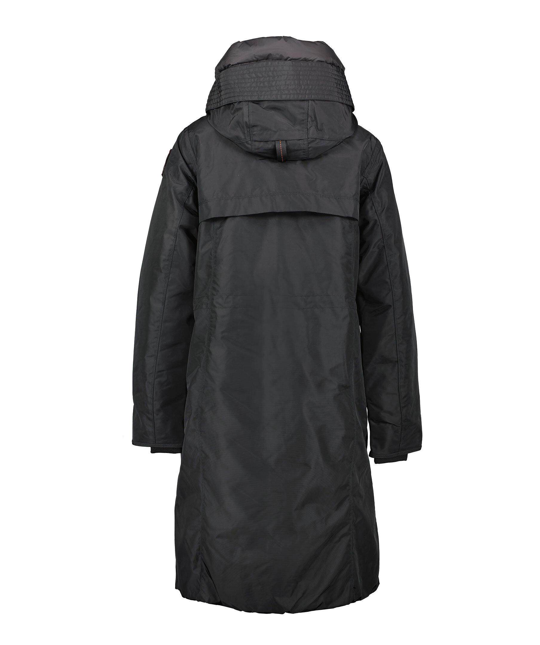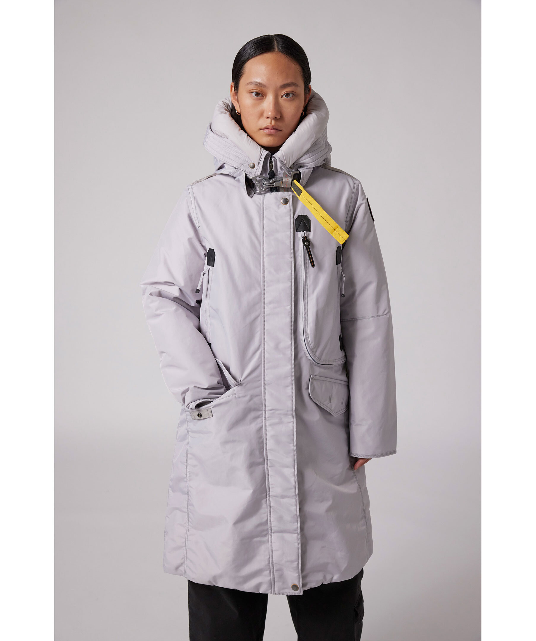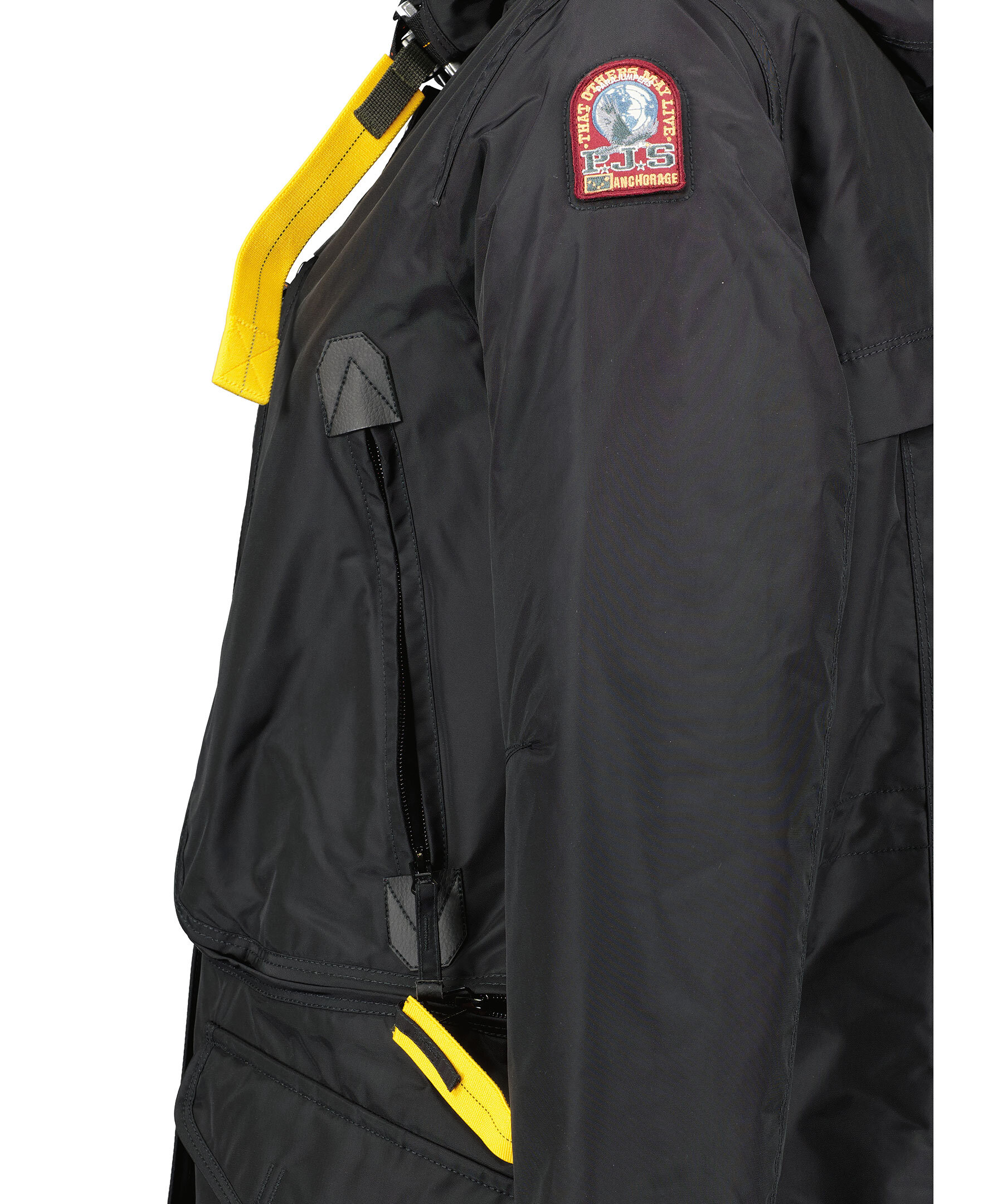 Svart, lång parkajacka med huva från Parajumpers. Jackan stängs med dold tvåvägsdragkedja och tryckknappar framtill. Den har två sidfickor med lock och tryckknapp, tre bröstfickor, patch-logotyp på vänster ärm samt deras ikoniska gula flärp framtill. Tillverkad i polyamid. ■ OBS! Modellbilderna visar endast passform