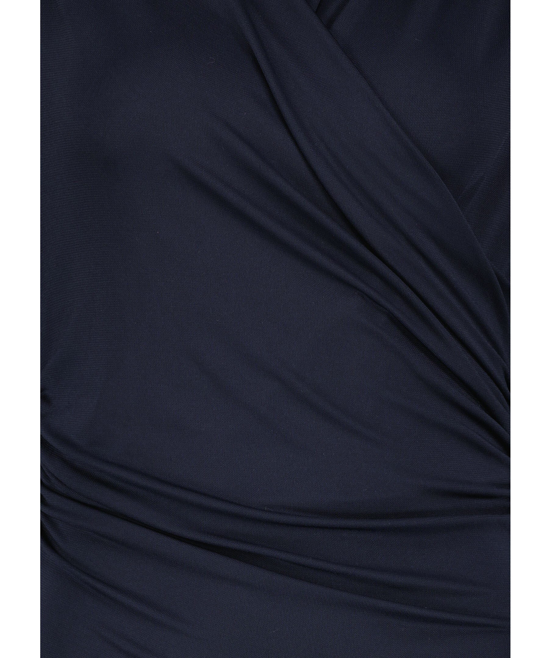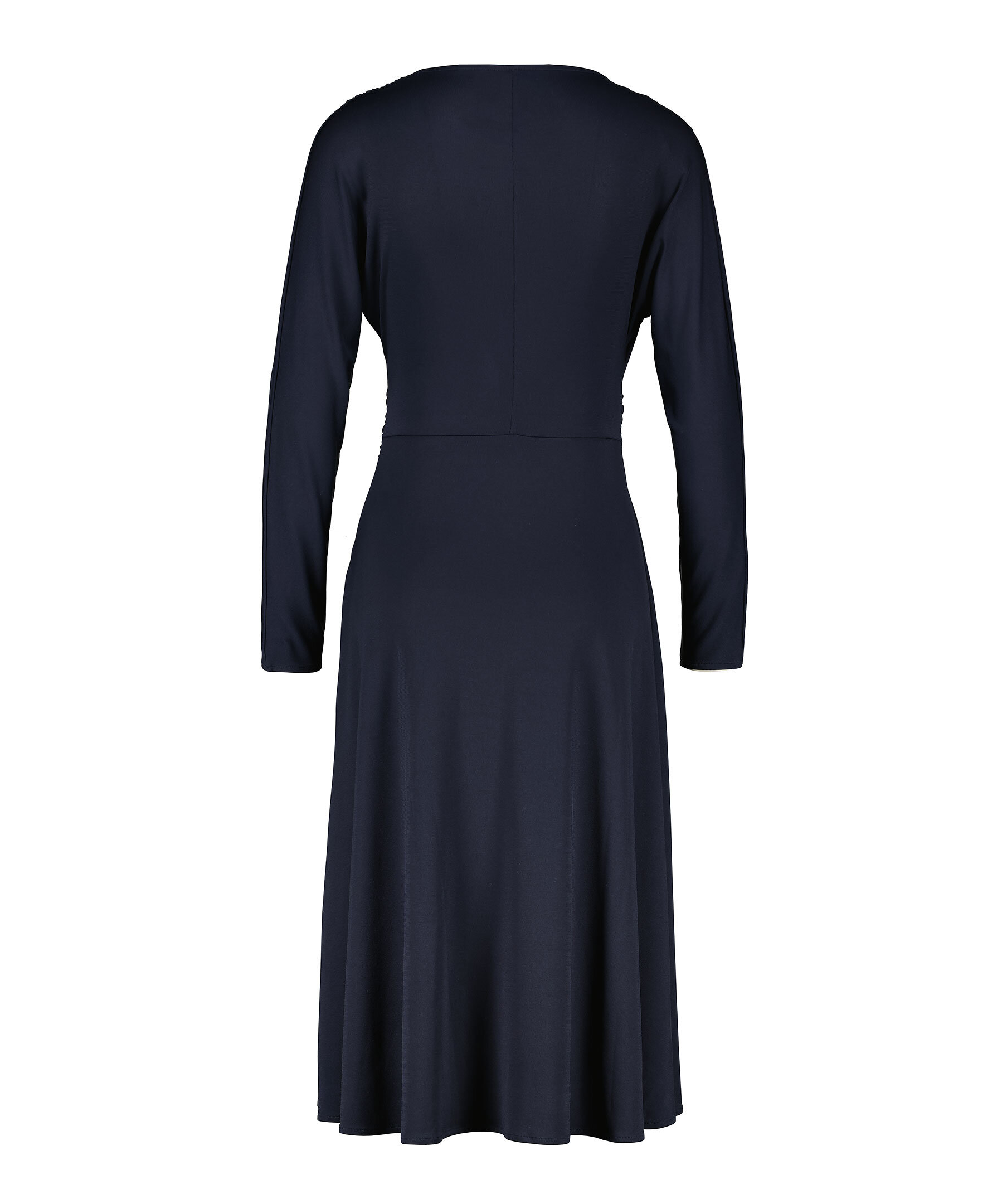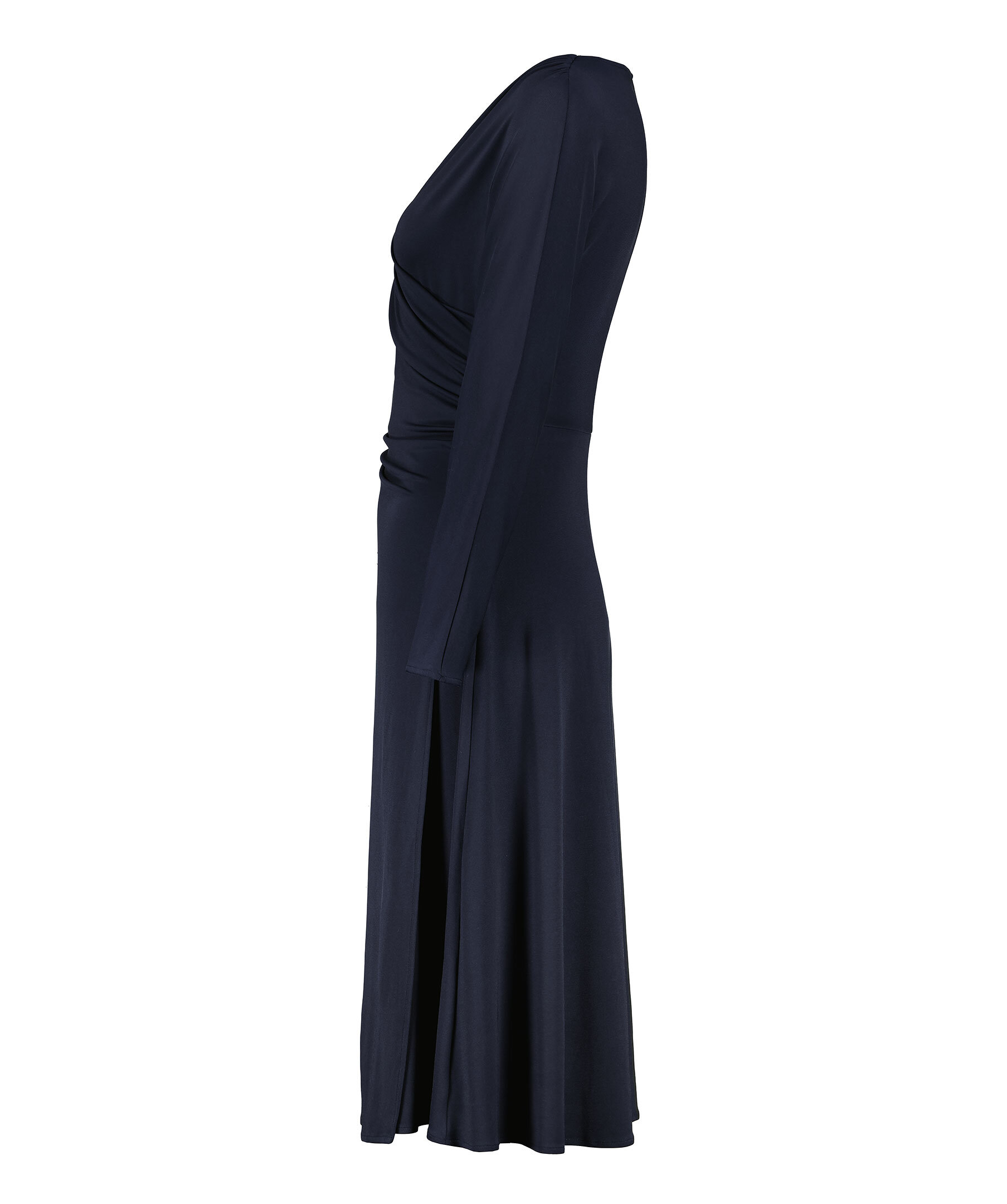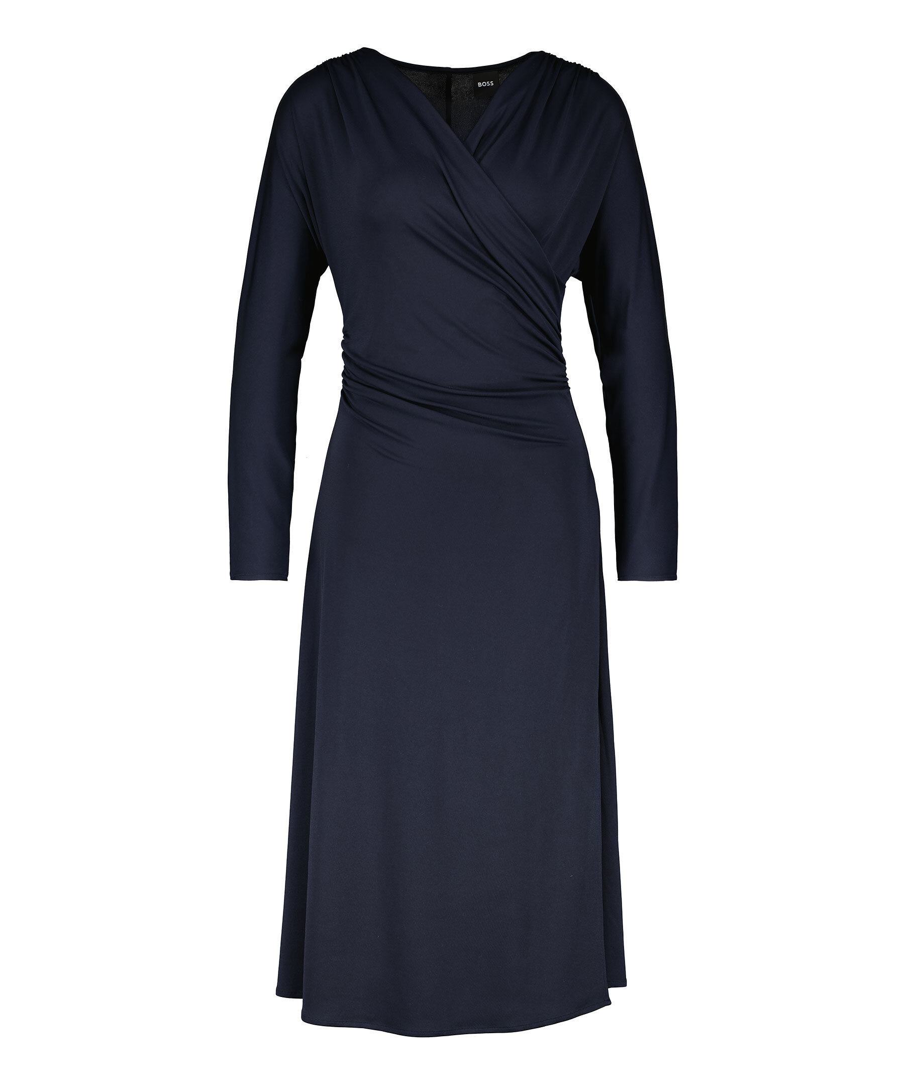 Mörkblå midi klänning från Boss Black. Klänningen har långa ärmar, lätt draperad vid axlarna, går omlott framtill och är lätt draperad även vid midjan. Lång slits på sidan. Tillverkad av en polyesterblandning.