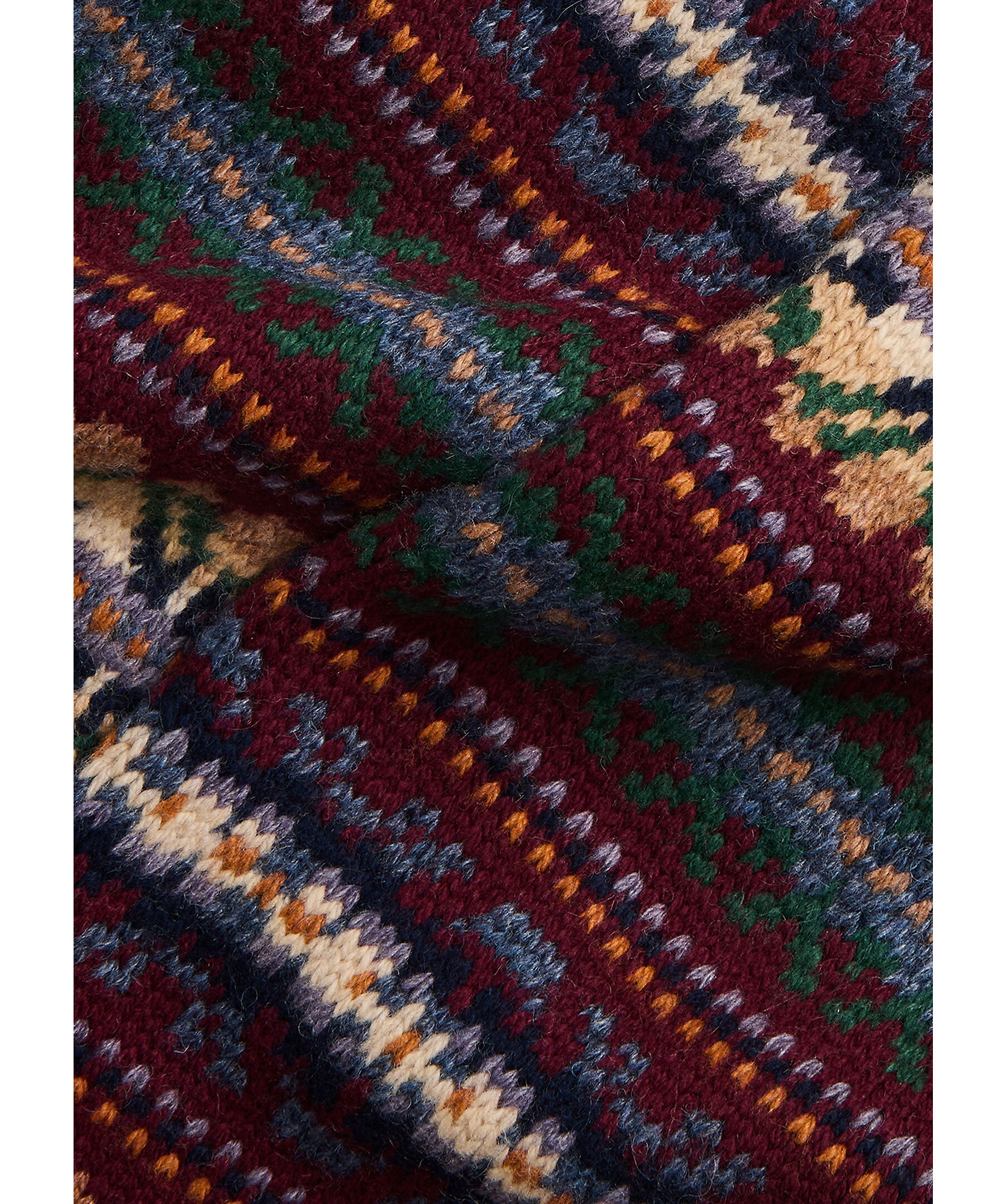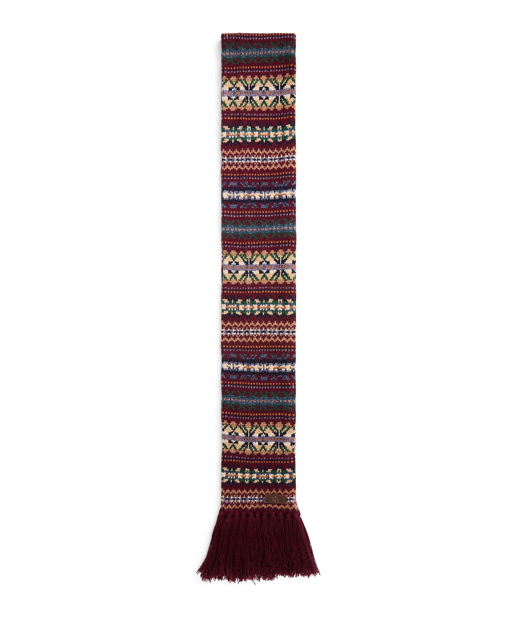 Vinröd, mönstrad halsduk från Lauren Ralph Lauren med fransar i kanterna samt liten logotyp i nederkant. Tillverkad i en ullblandning.