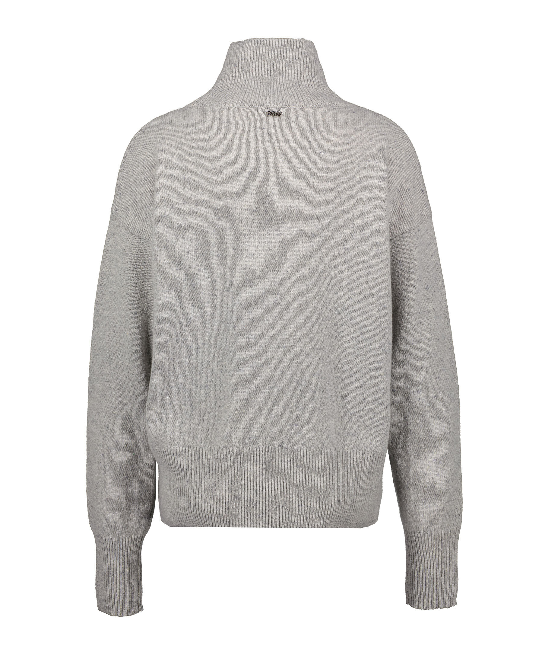 Grå polotröja från Boss Black. Tröjan har ribbstickad krage, ärm- och tröjslut. Liten metallogotyp bak i nacken. Tillverkad av en ullblandning.