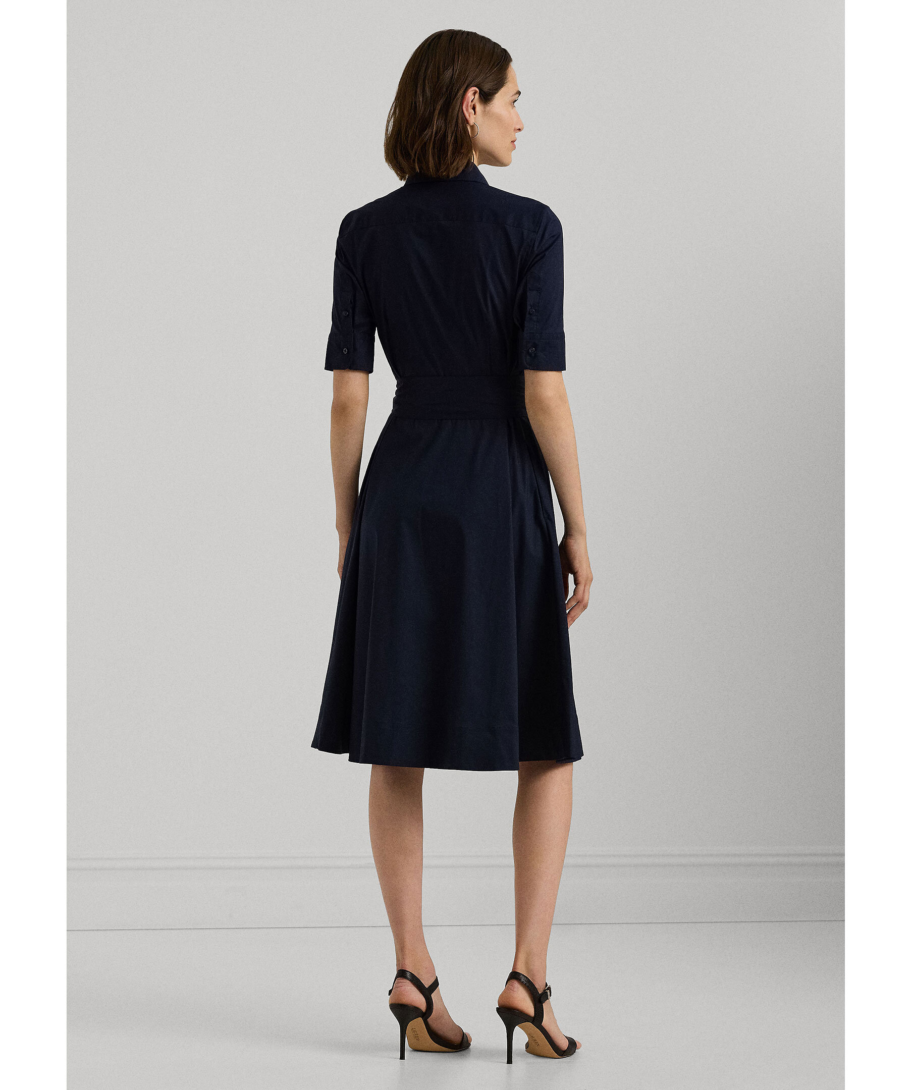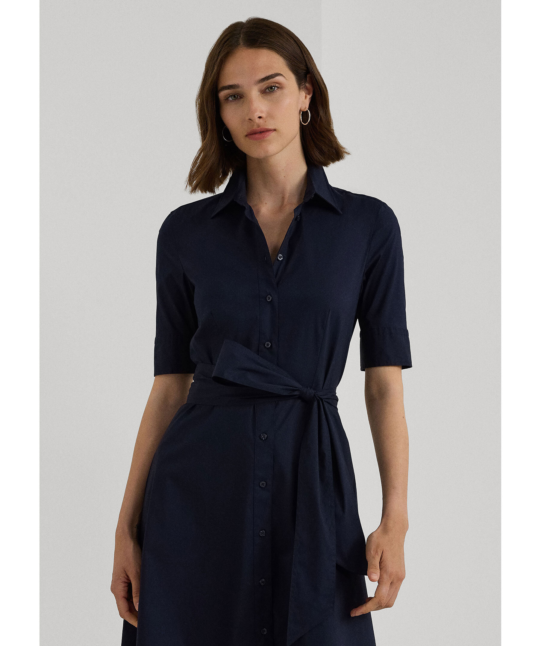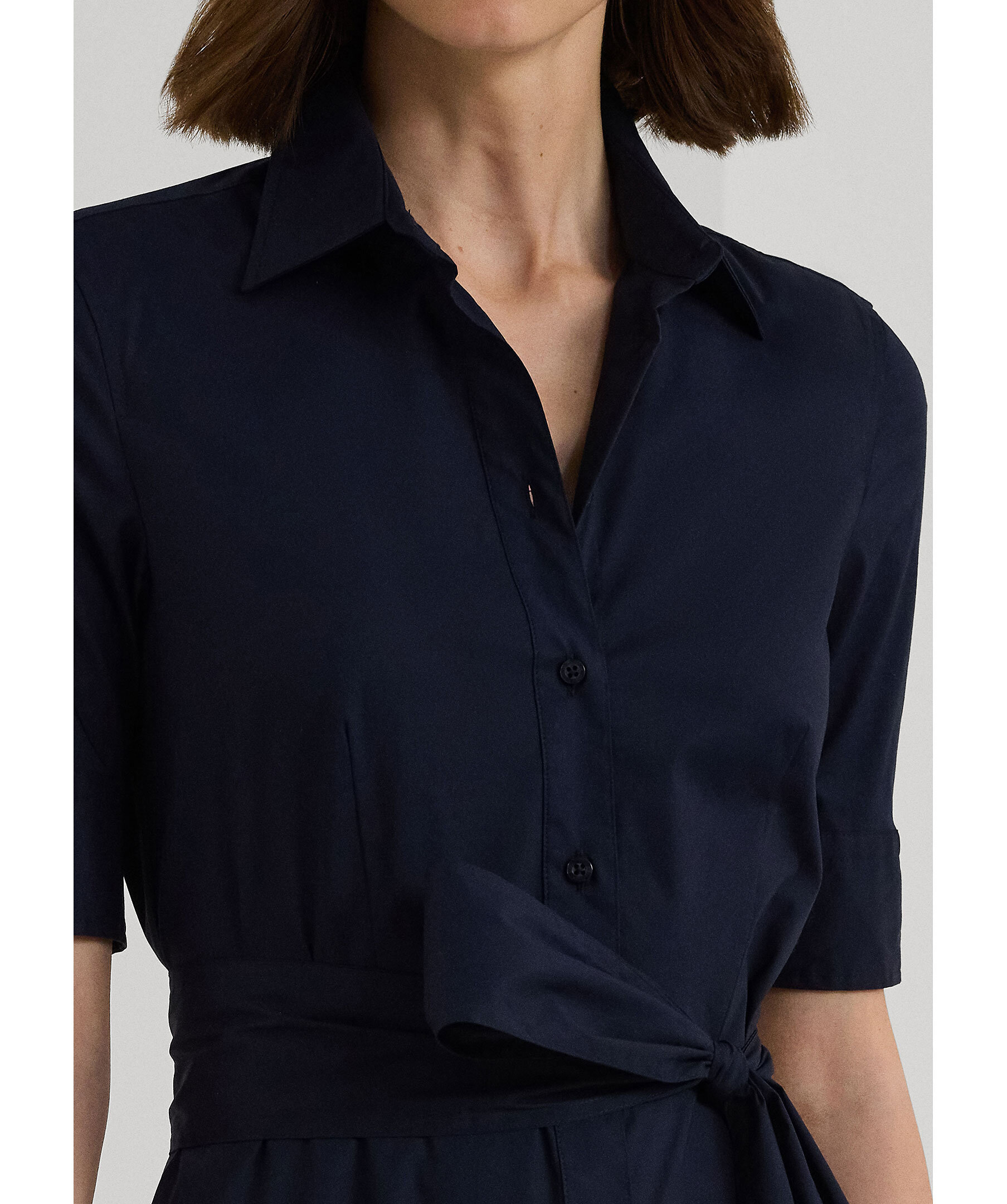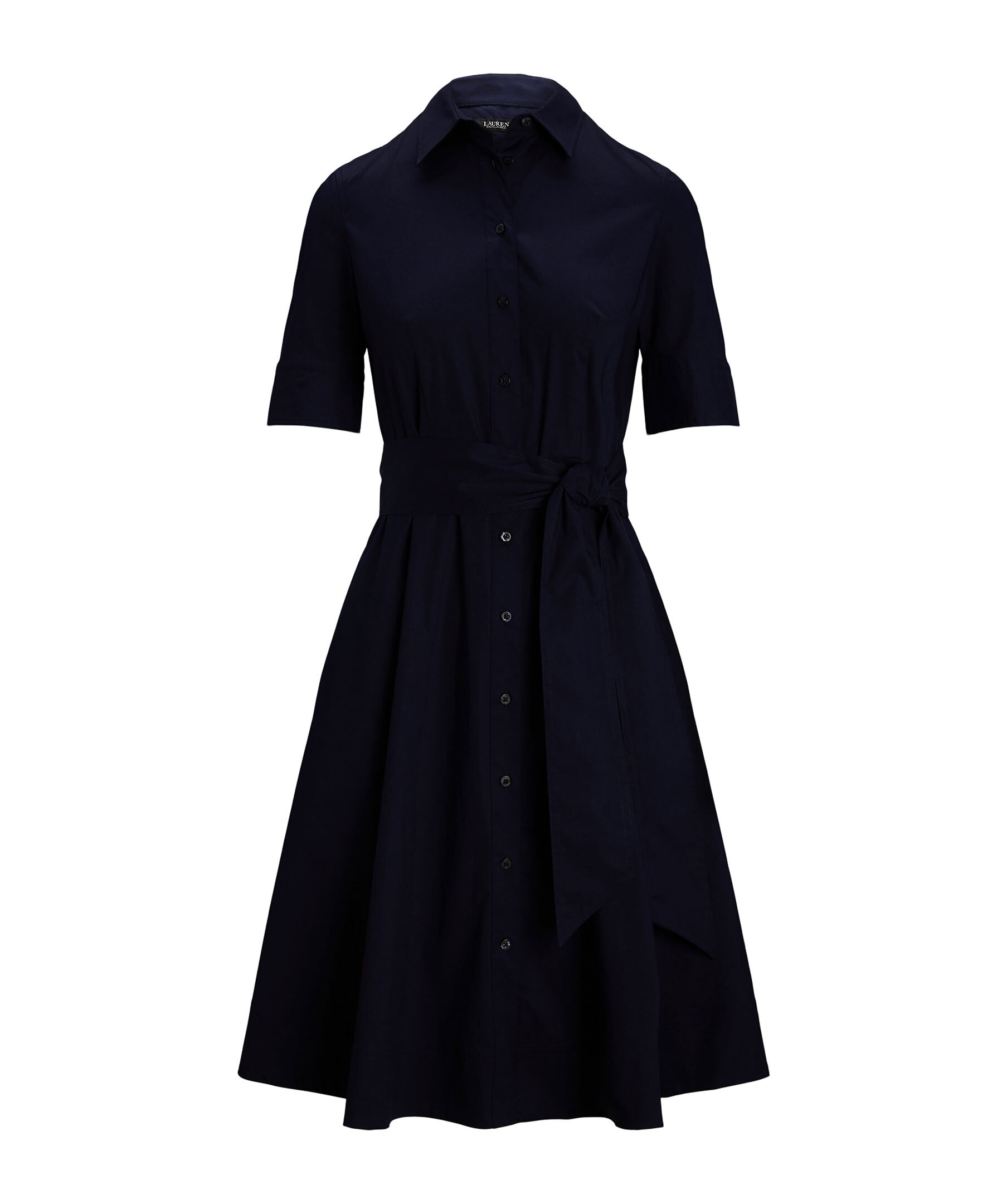 Marinblå, skjortklänning från Lauren Ralph Lauren. Knäppning hela vägen fram, snörning i midjan och har långa t-shirt ärmar. Klänningen är a-linjeformad nertill, har öppna fickor i sidorna och en spetsig krage fram. Tillverkad i en stretchig bomullsblandning.