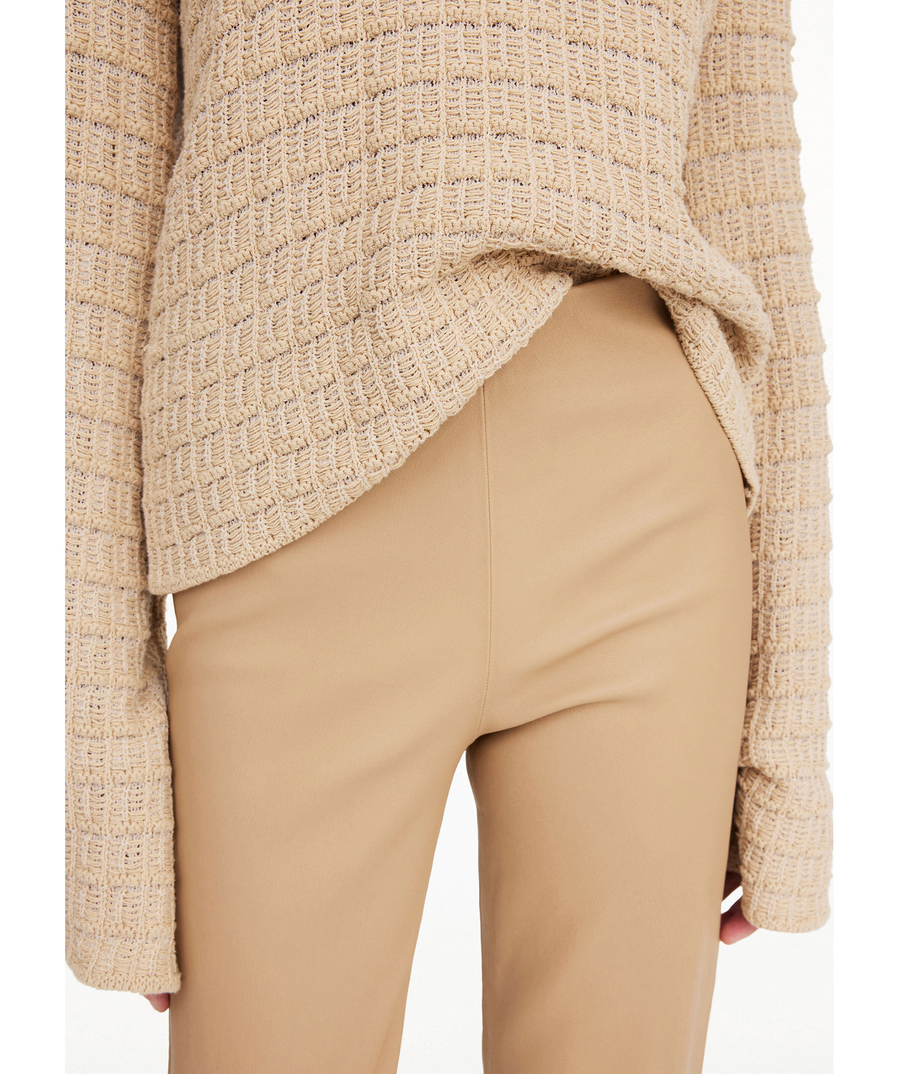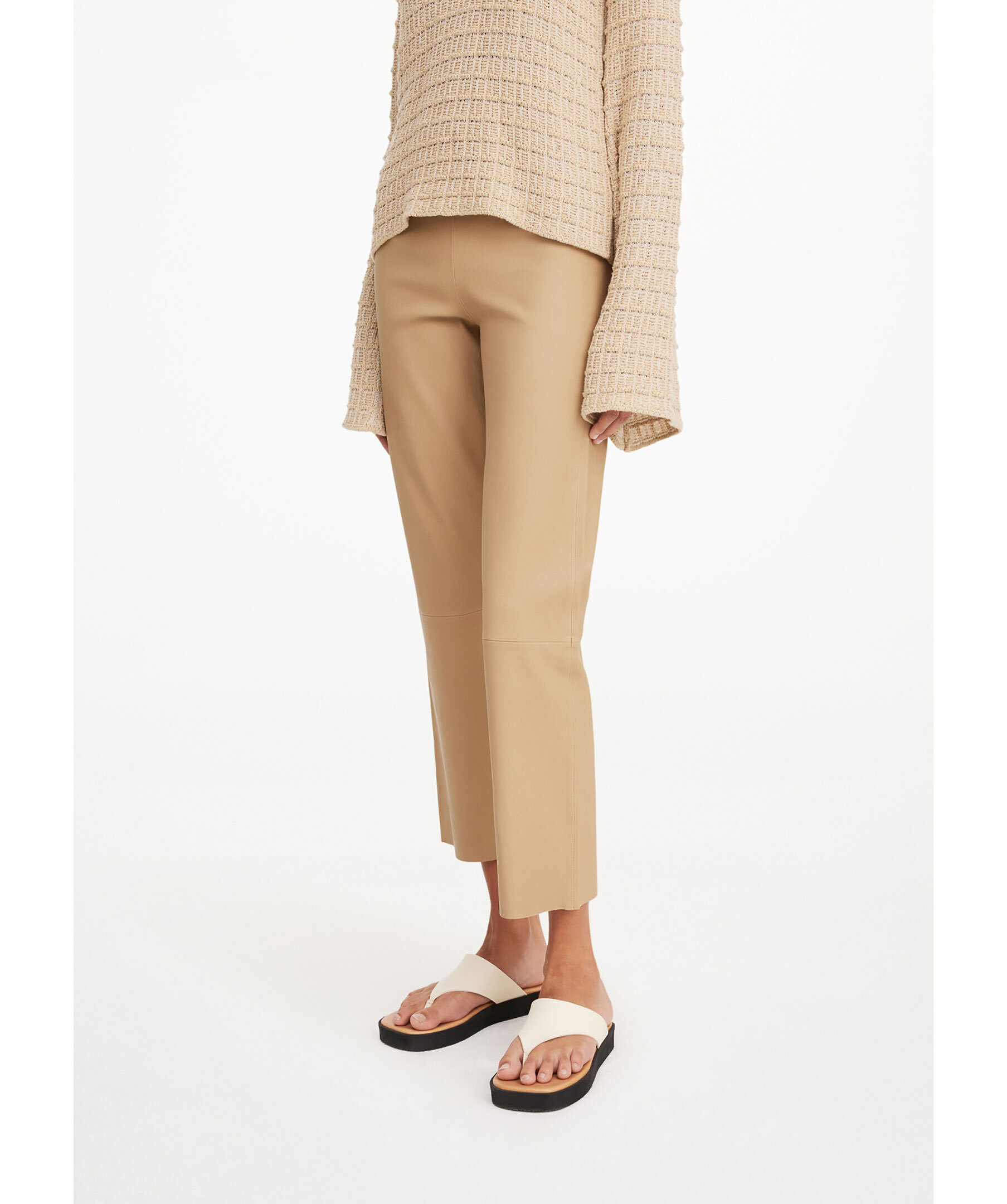 Läderbyxor i en beige färg från By Malene Birger. Dessa ankellånga läderbyxor har en flexibel, elastisk midja och raka ben. De har pressade sömmar framtill och sitter i midjehöjd. Byxorna har en smal passform, obehandlade fållar och är ofodrade, vilket gör dem perfekta att bära med allt från skjortor till stickade plagg.