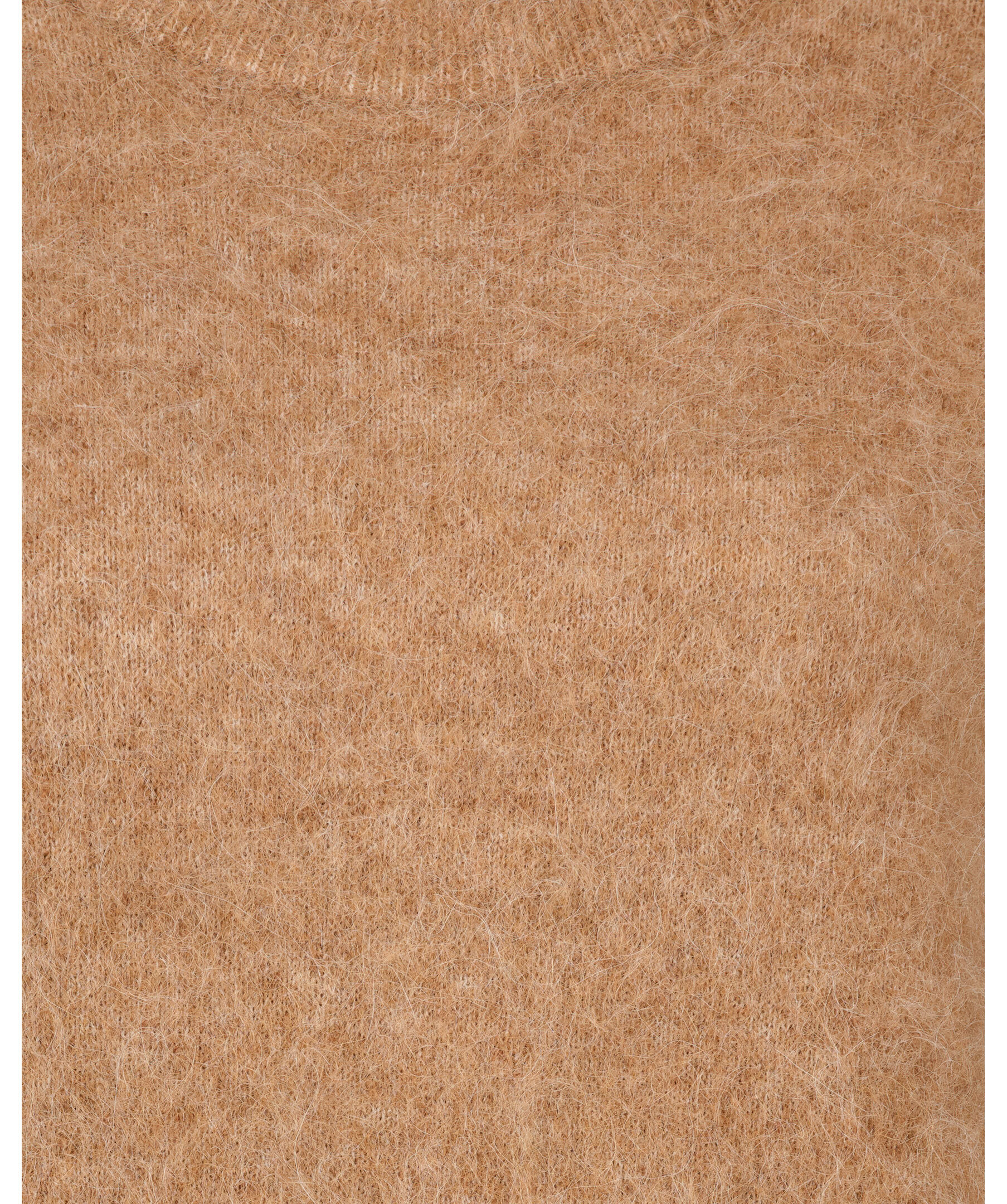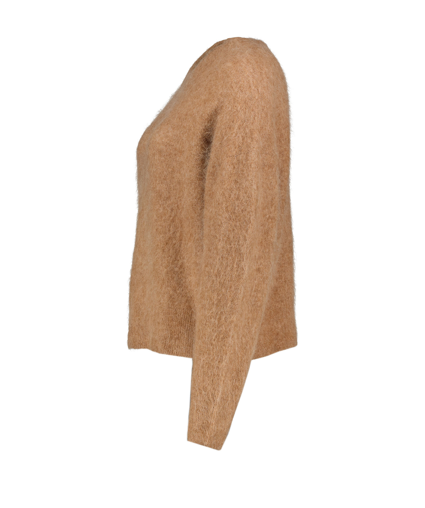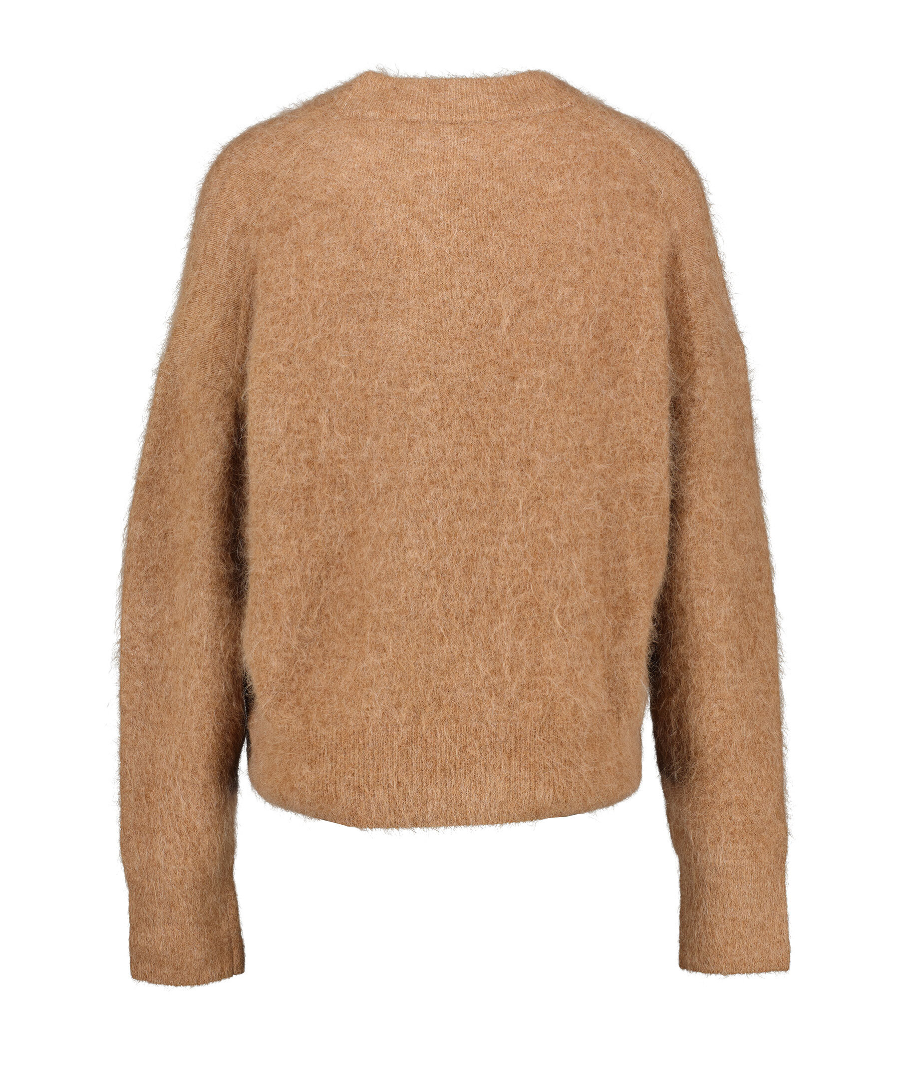 Kamelfärgad, fluffig pullover från Filippa K stickad av en mjuk tung alpackaullblandning. Tröjan har en ribbstickad halsringning samt ribbstickade muddar.