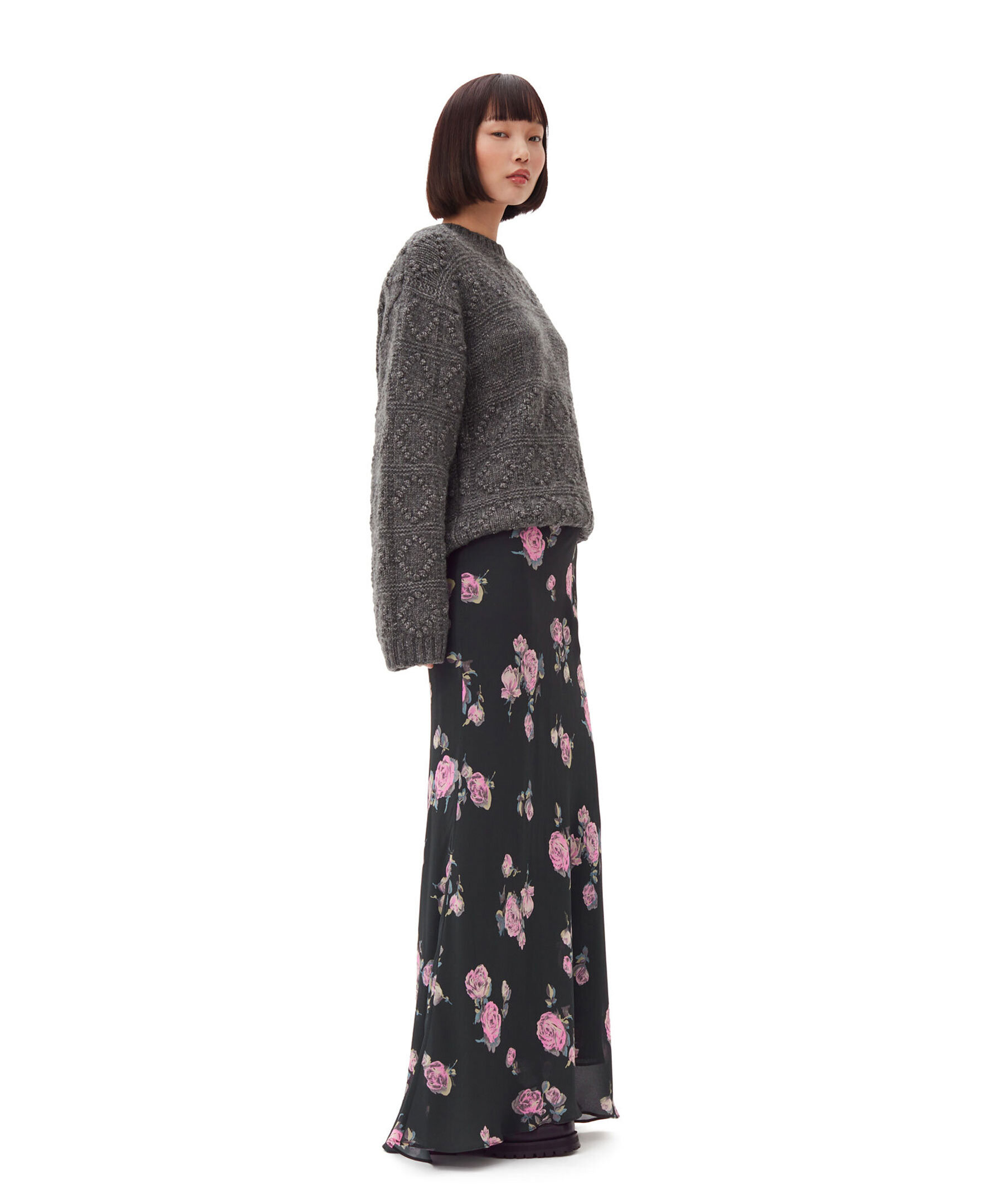 Denna Floral Printed Crepe Maxi kjol har en dragkedja i sidan och ett rosa blommigt tryck.