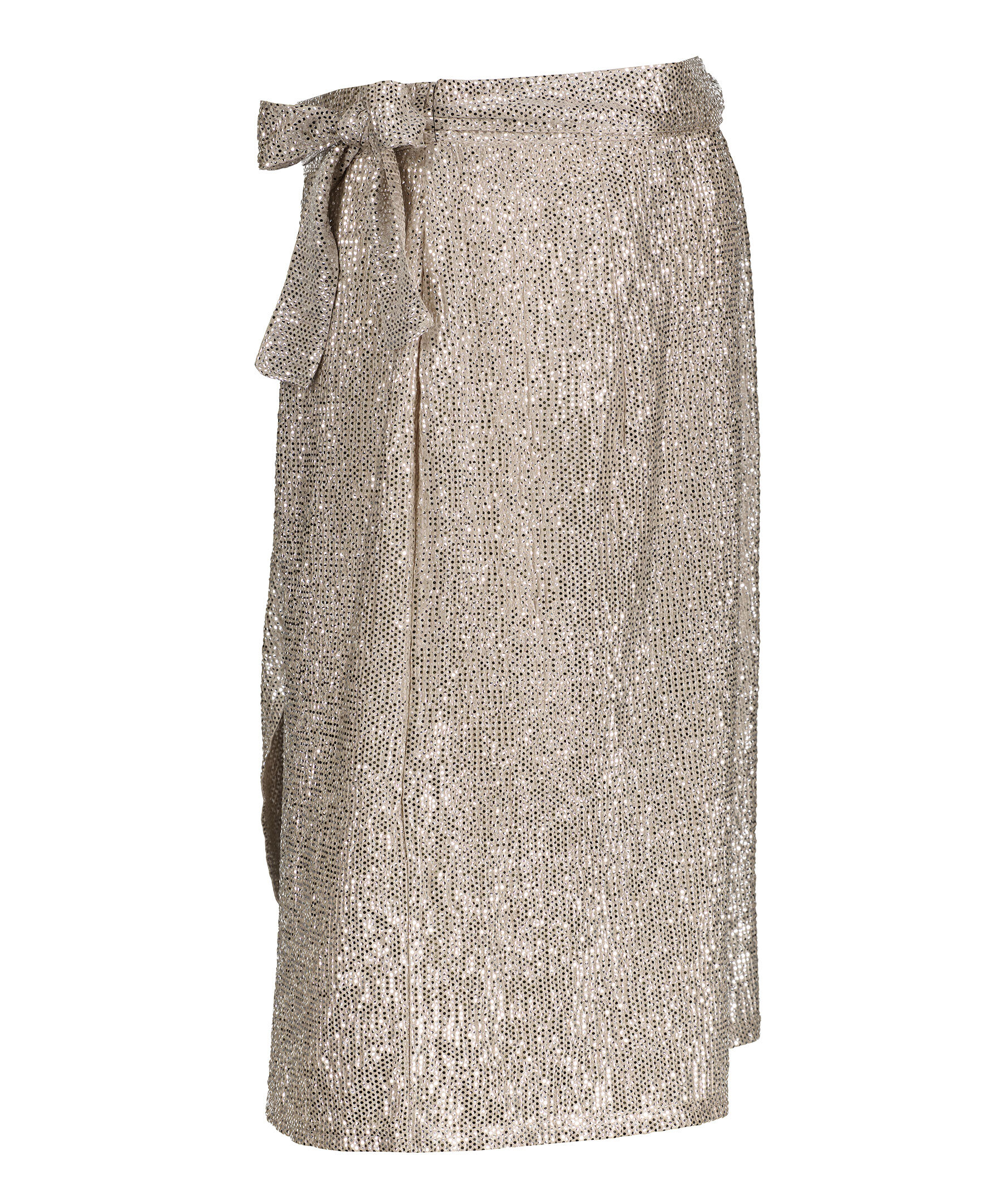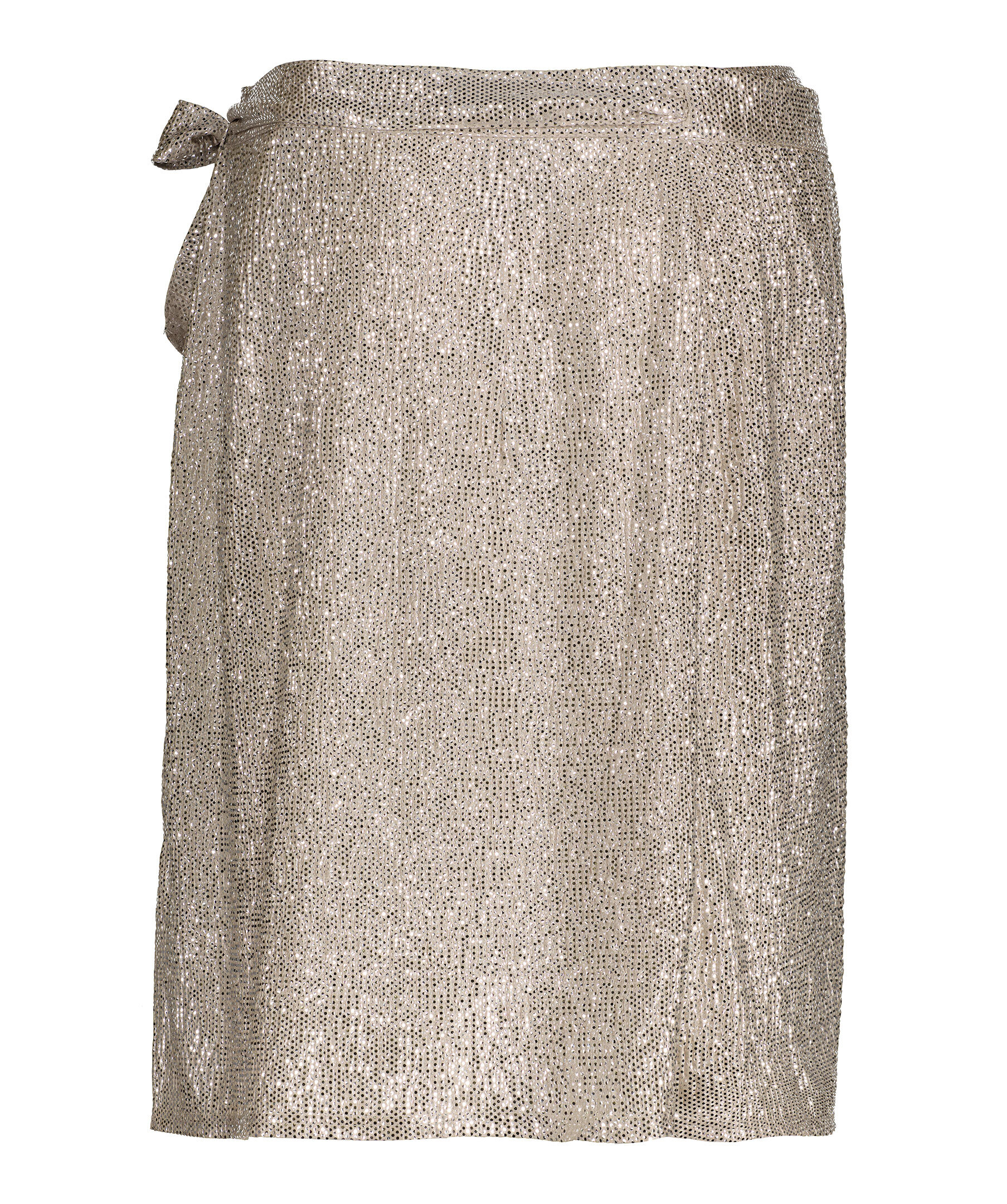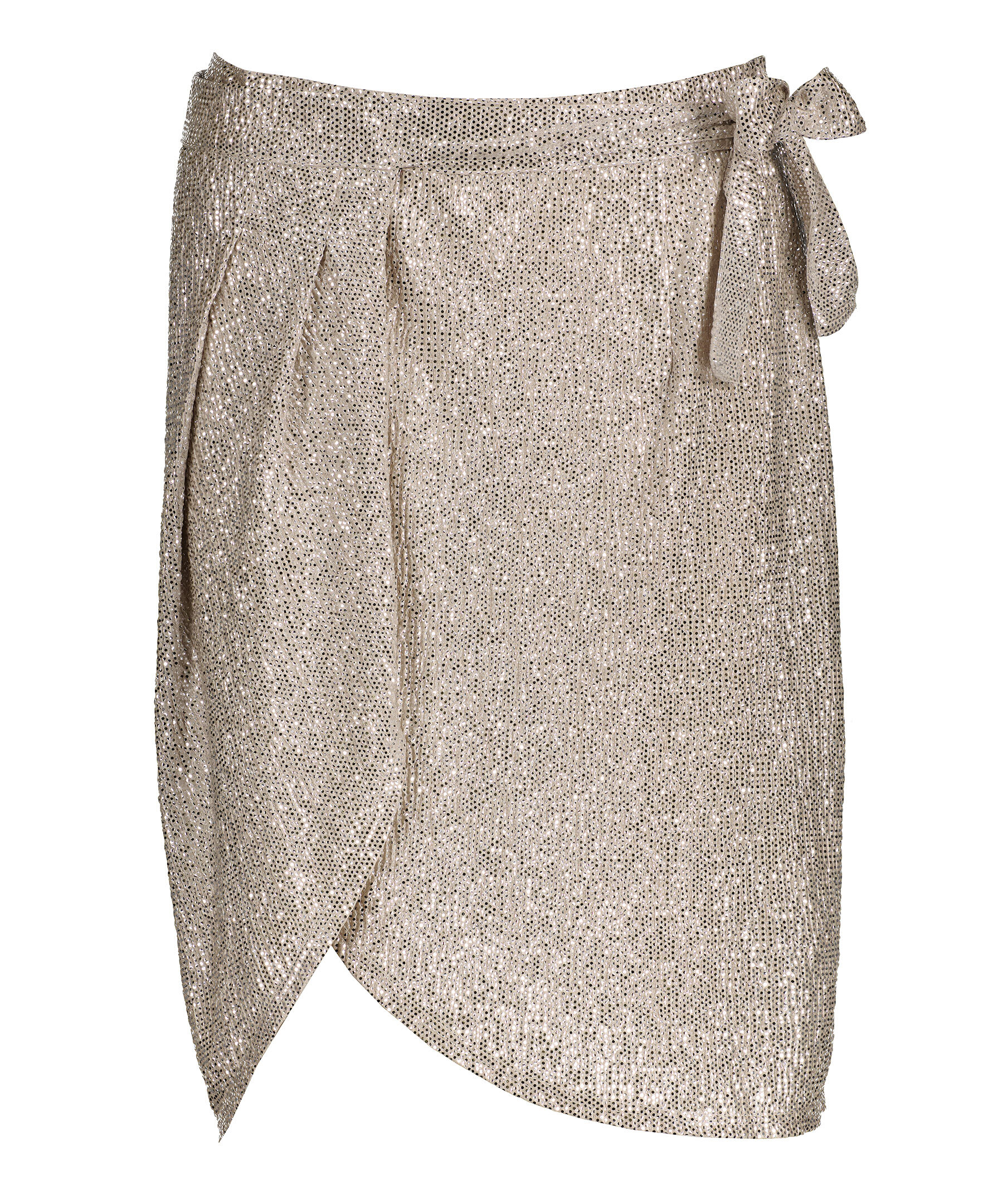 Silverfärgad, glittrig kjol från Ida Sjöstedt. Kjolen har ett justerbart omlottbälte i sidan. Tillverkad i polyester.