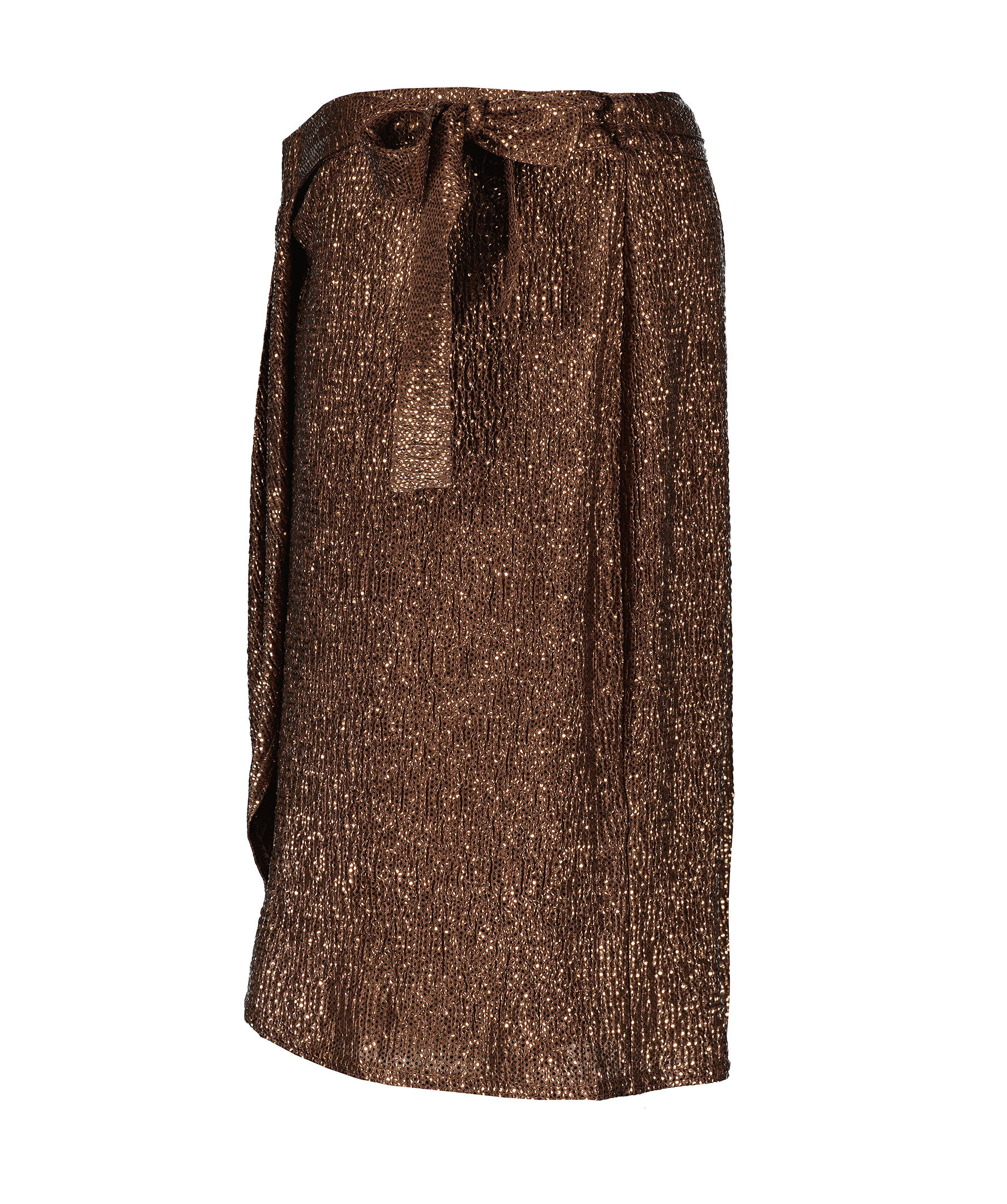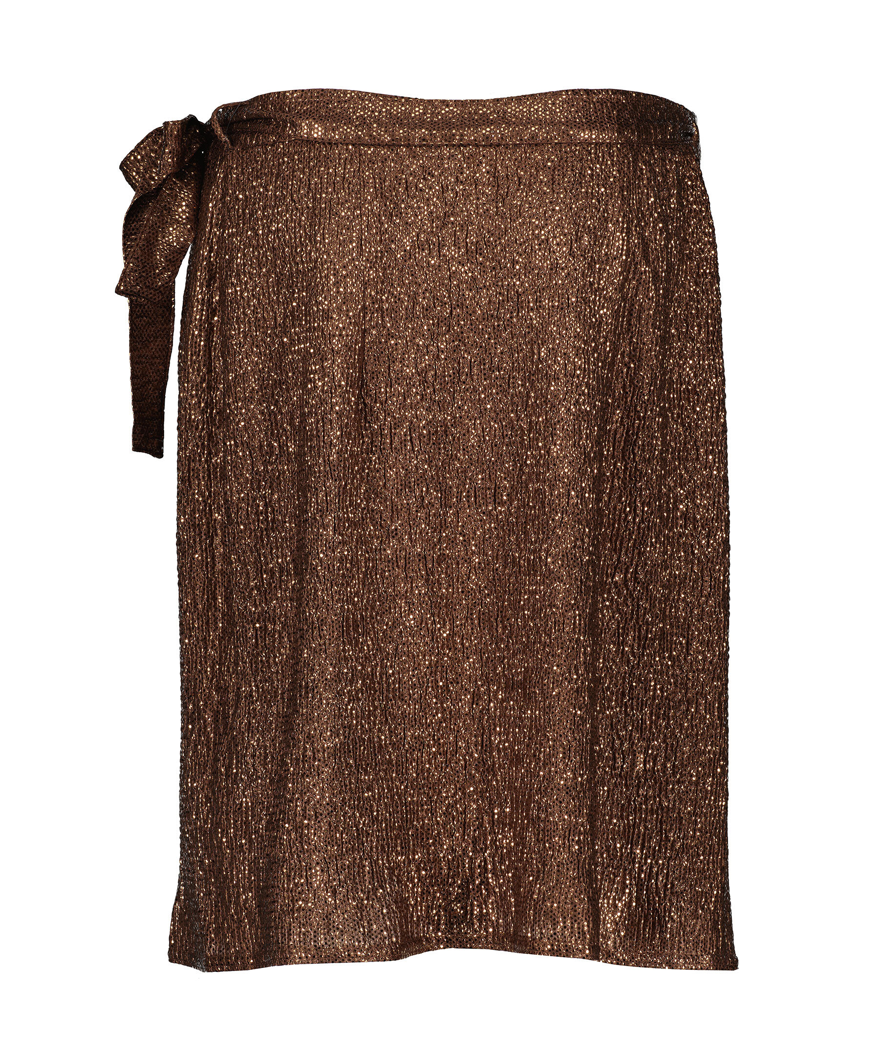 Brun, glittrig kjol från Ida Sjöstedt. Kjolen har ett justerbart omlottbälte i sidan. Tillverkad i polyester.