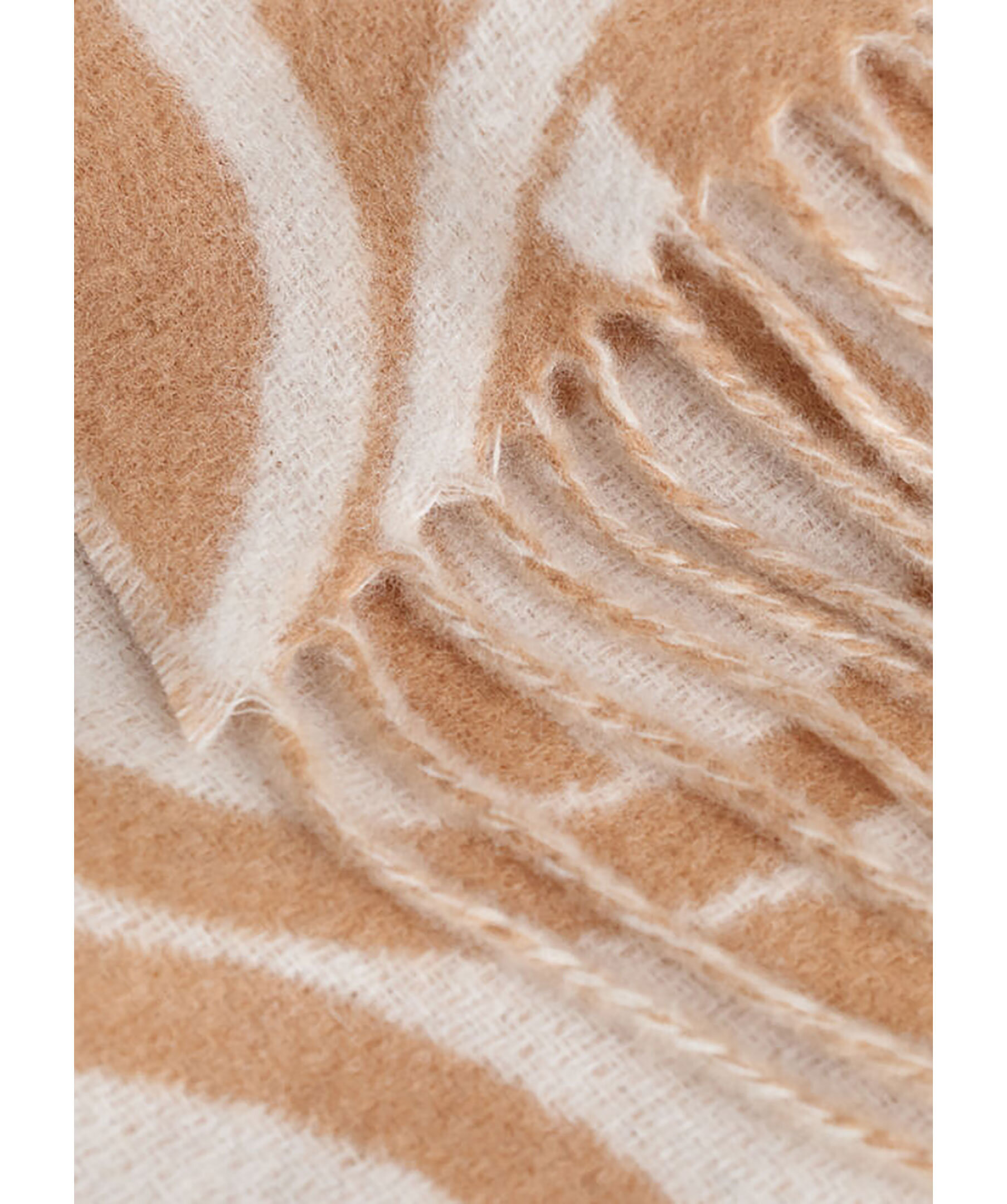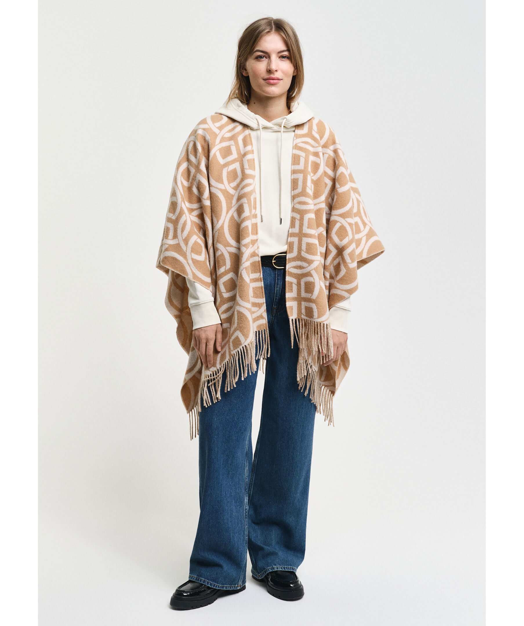 Beige poncho från Gant. Ponchon har fransar i kanterna, tvåfärgad G-mönstrad monogramdesign i jacquard samt broderad GANT-logotyp i vänster hörn. Tillverkad i merinoull. Mått: L 210 cm x B 125 cm