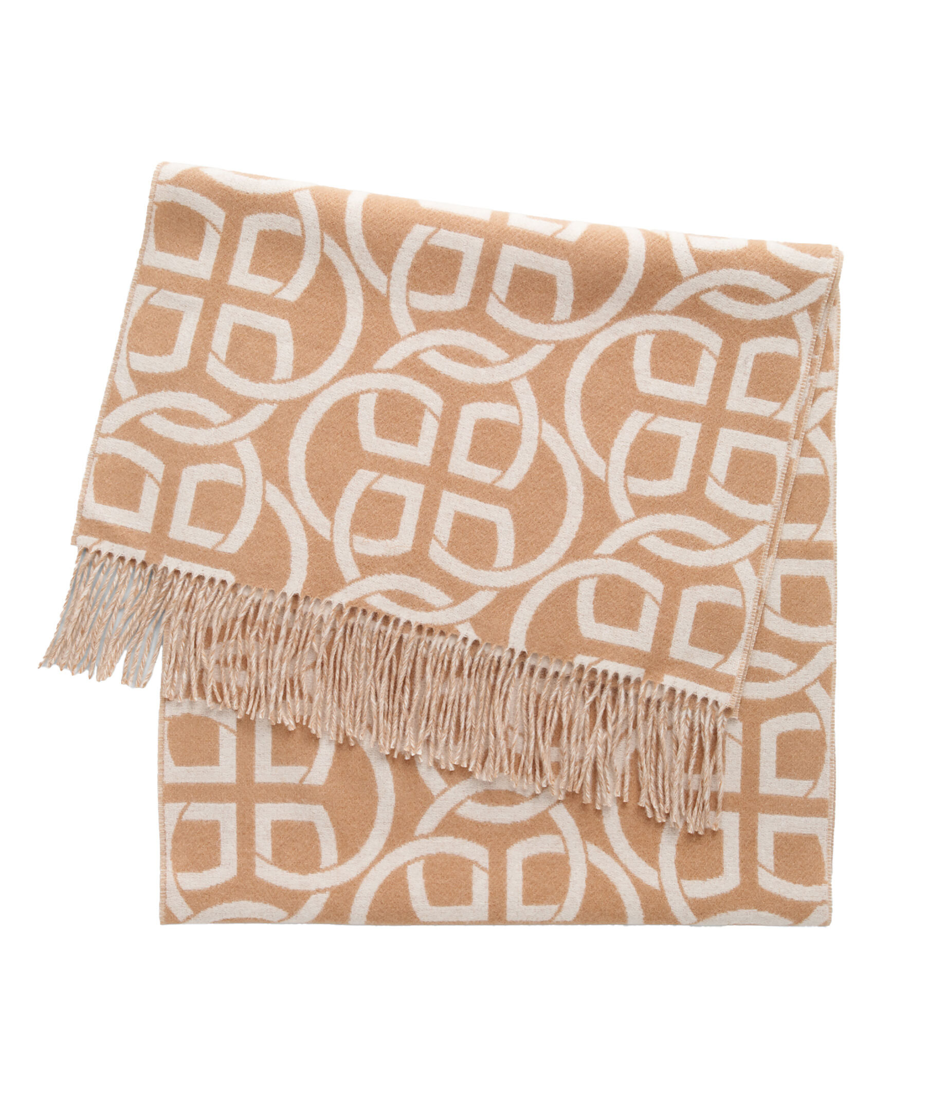 Beige halsduk från Gant. Halsduken har fransar i kanterna, broderad GANT-logotyp längst ner och ett heltäckande G-mönster i jacquard. Halsduken är vändbar och tillverkad i 100% merinoull. Mått: 180 x 50cm.