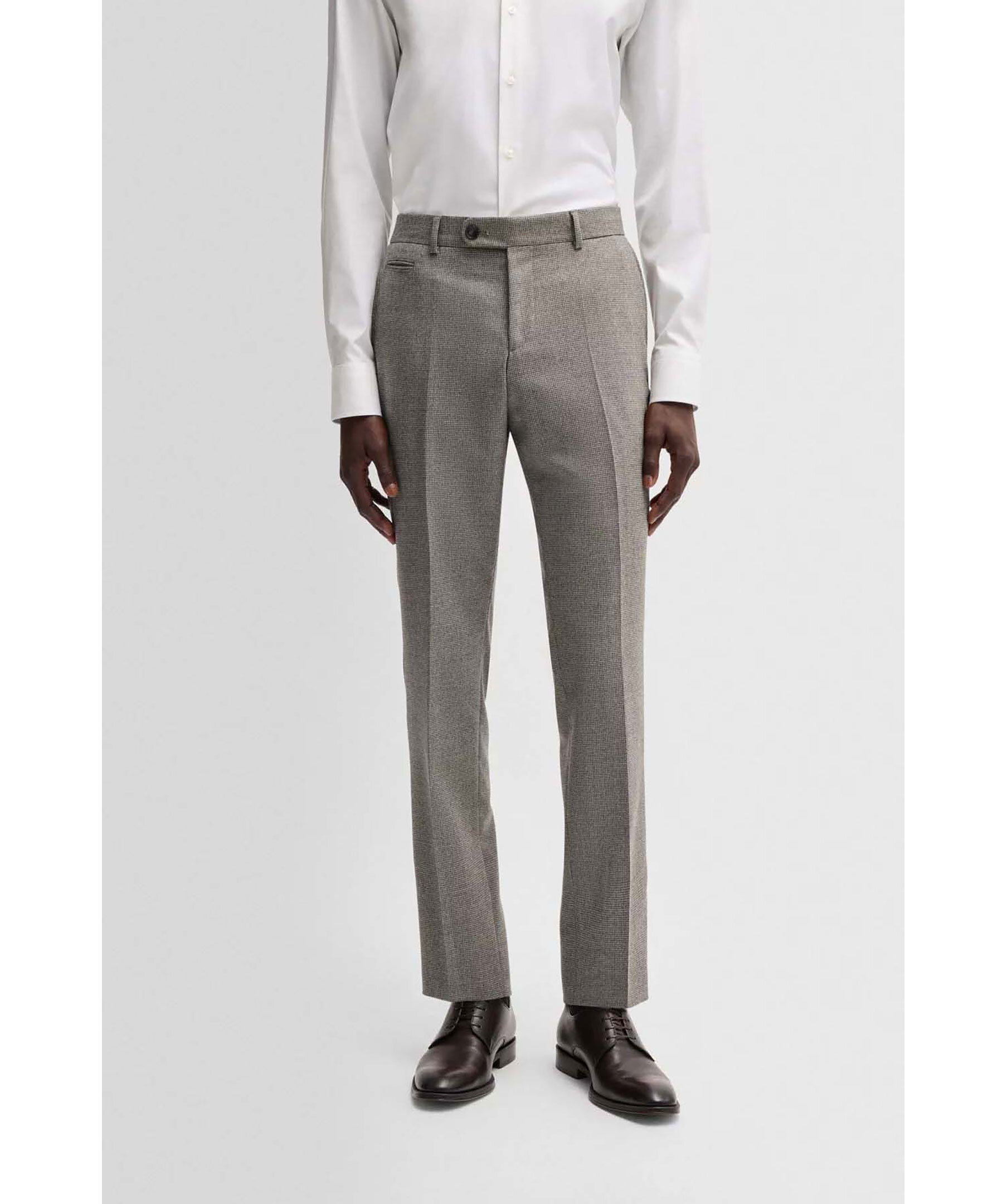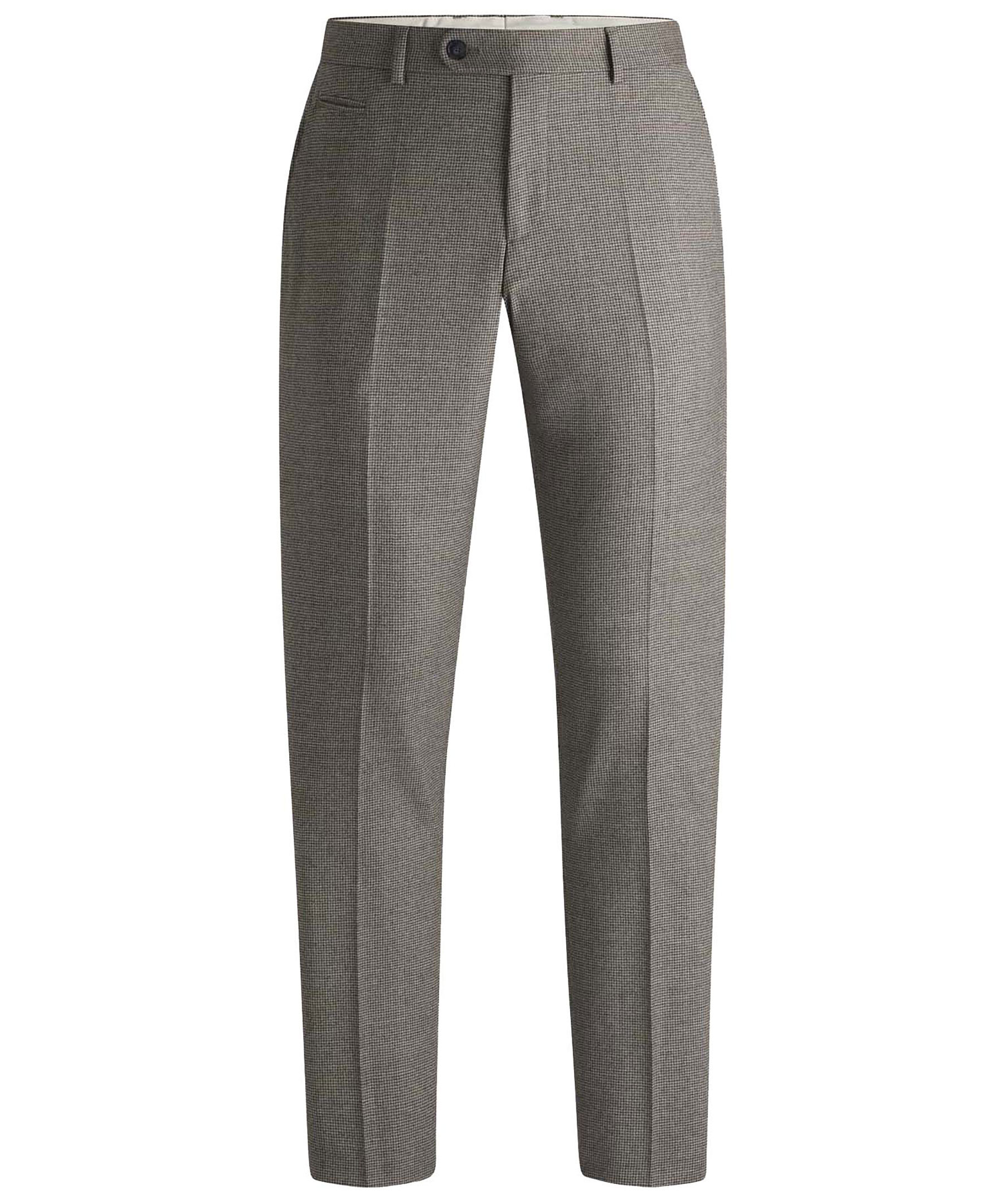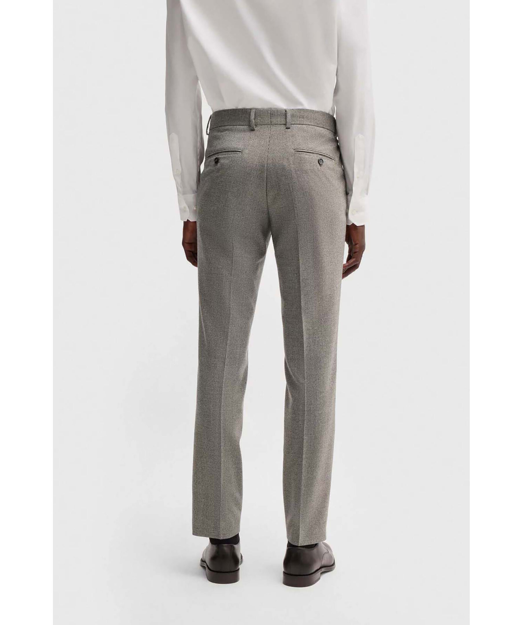 Gråa byxor från Boss Black. Byxorna har micromönster och har en definierad passform. Öppna sidofickor, passpoalfickor bak med knapp samt passpoalficka fram och bälteshällor. Tillverkade av en ullblandning.