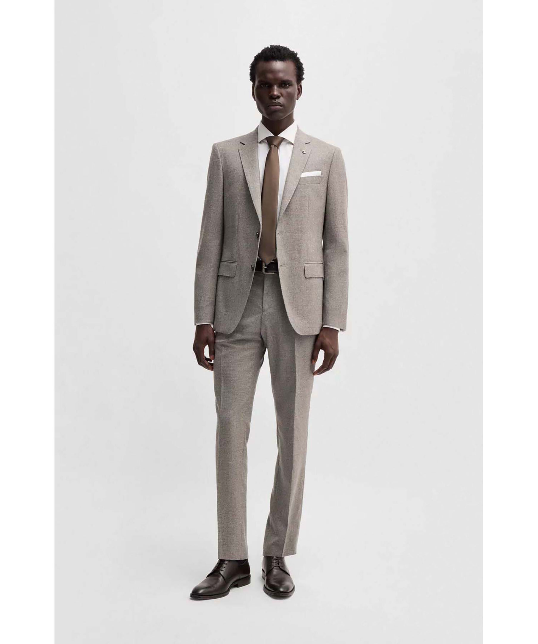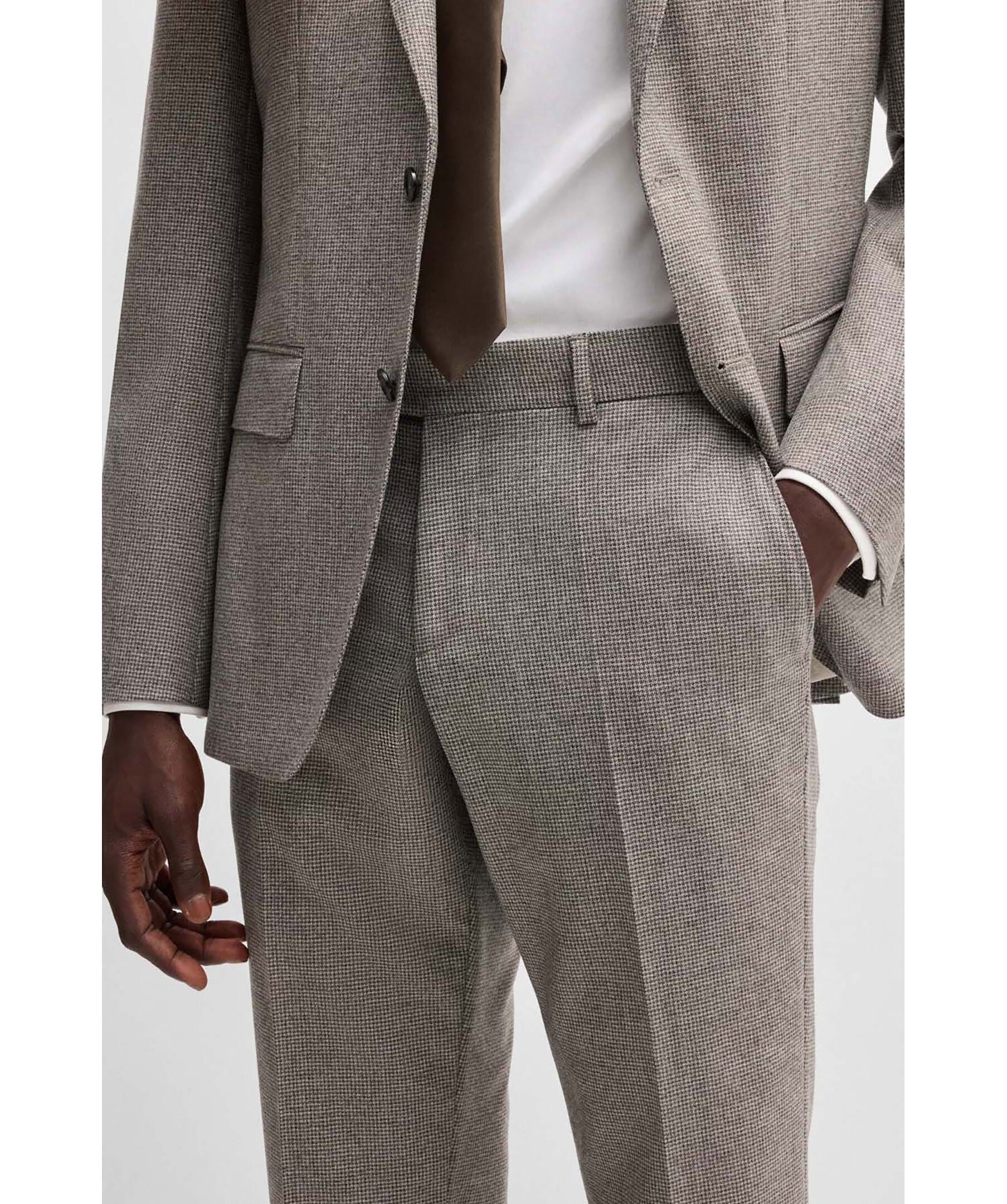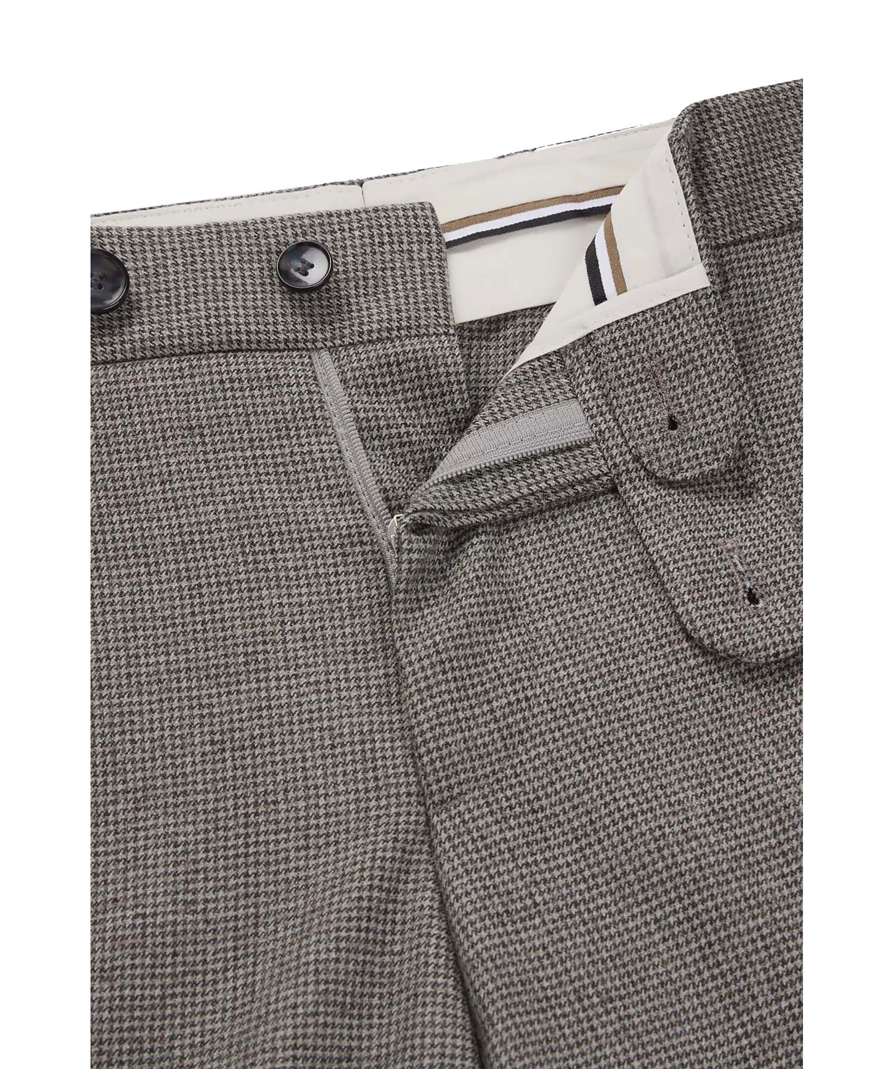 Gråa byxor från Boss Black. Byxorna har micromönster och har en definierad passform. Öppna sidofickor, passpoalfickor bak med knapp samt passpoalficka fram och bälteshällor. Tillverkade av en ullblandning.