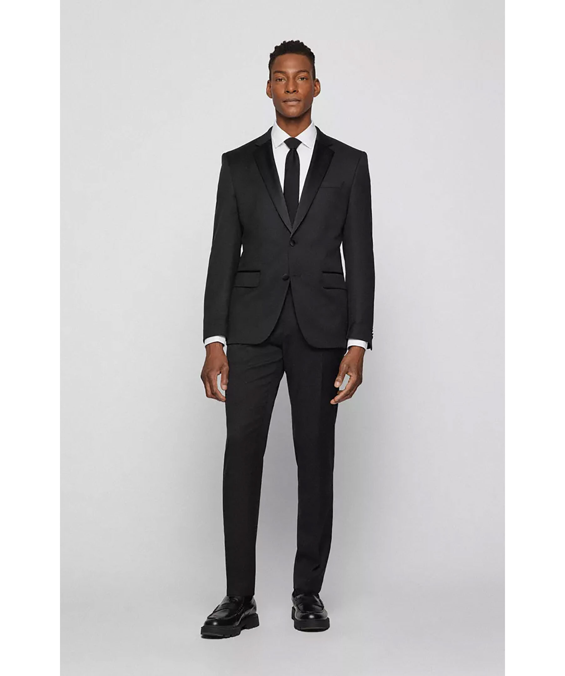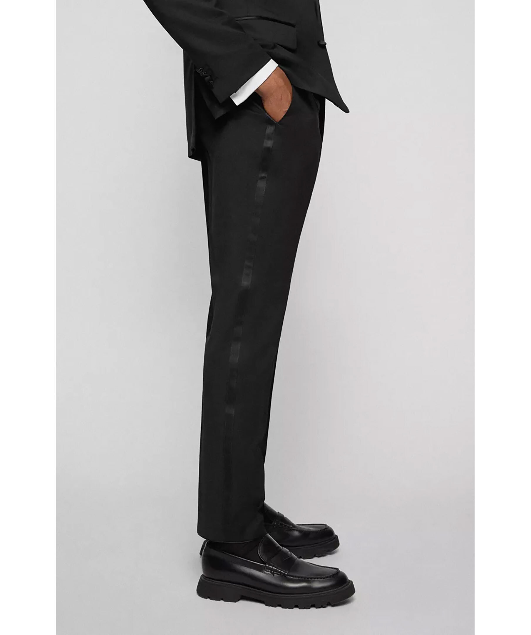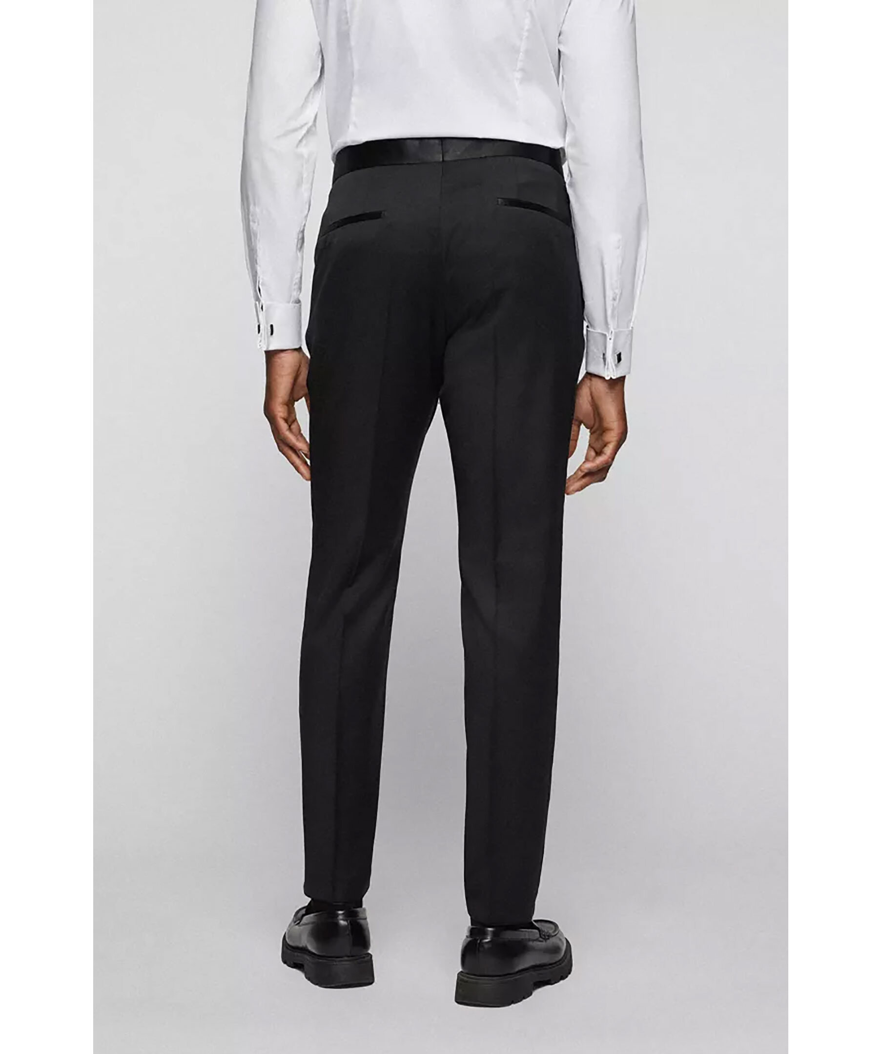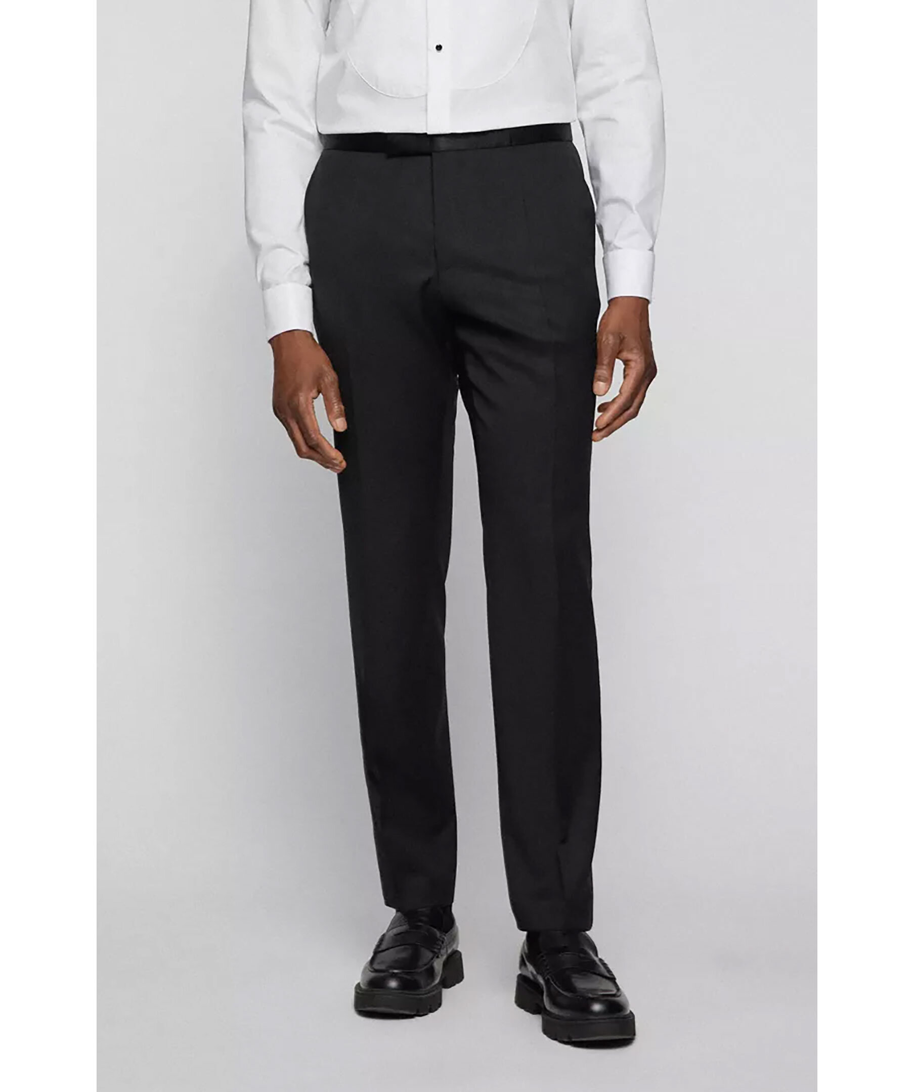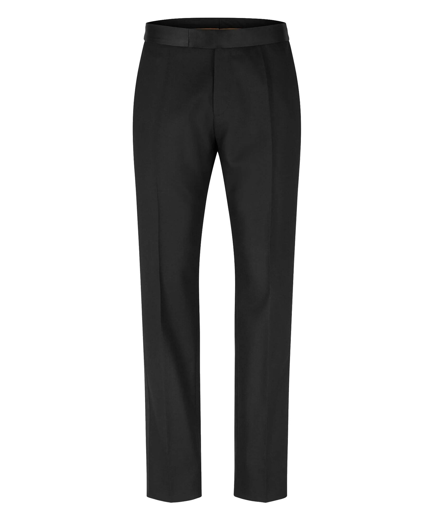 Svarta smoking kostymbyxor i ull från BOSS BLACK i slim fit modell. Accenter i en sidenblandning för formell styling. Stängs med hake och dragkedja. Pressveck. Två framfickor och två bakfickor. Byxorna har även spännen i metall på vardera sida om midjan (syns ej på bild) för att kunna justera passformen bättre.
