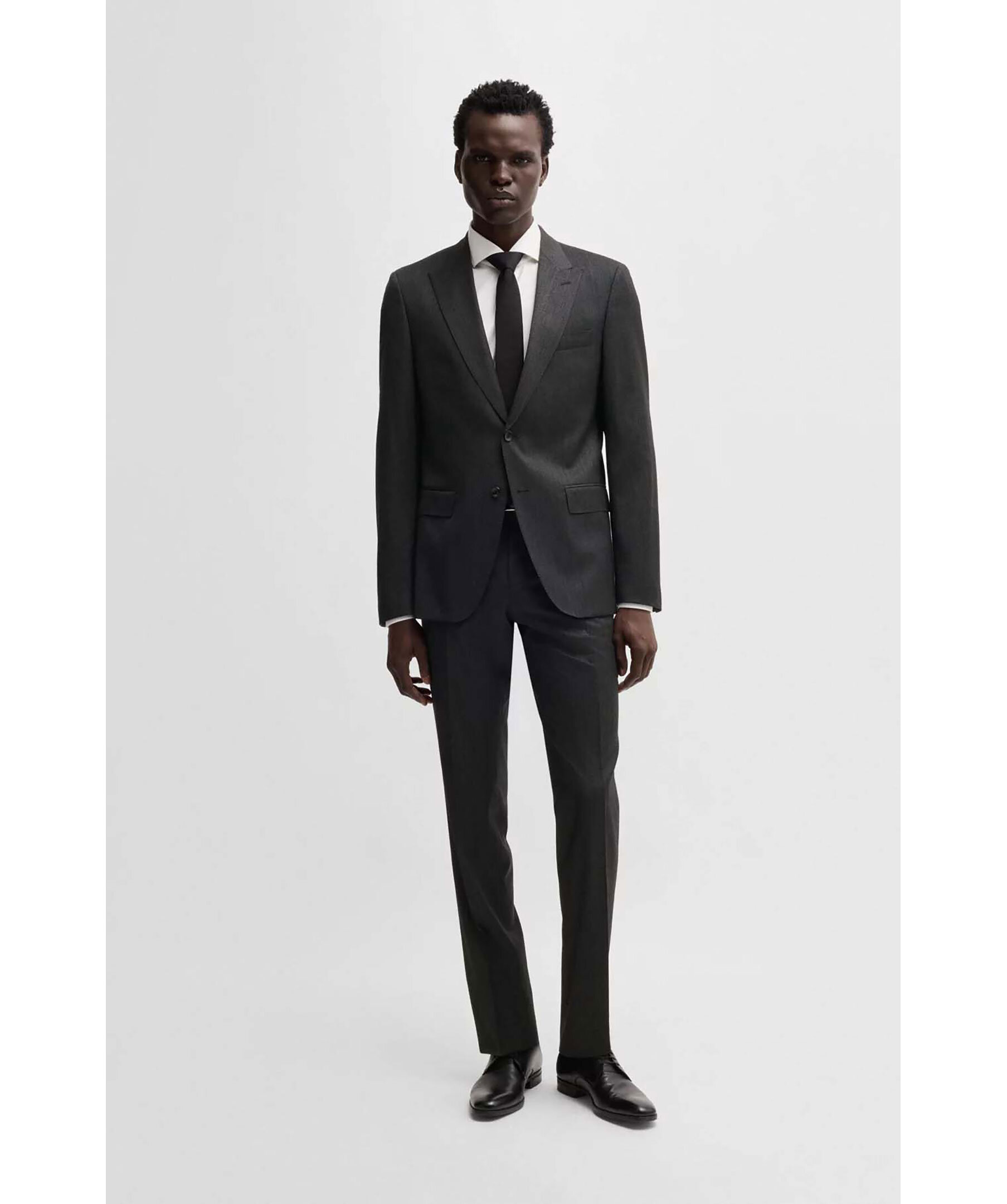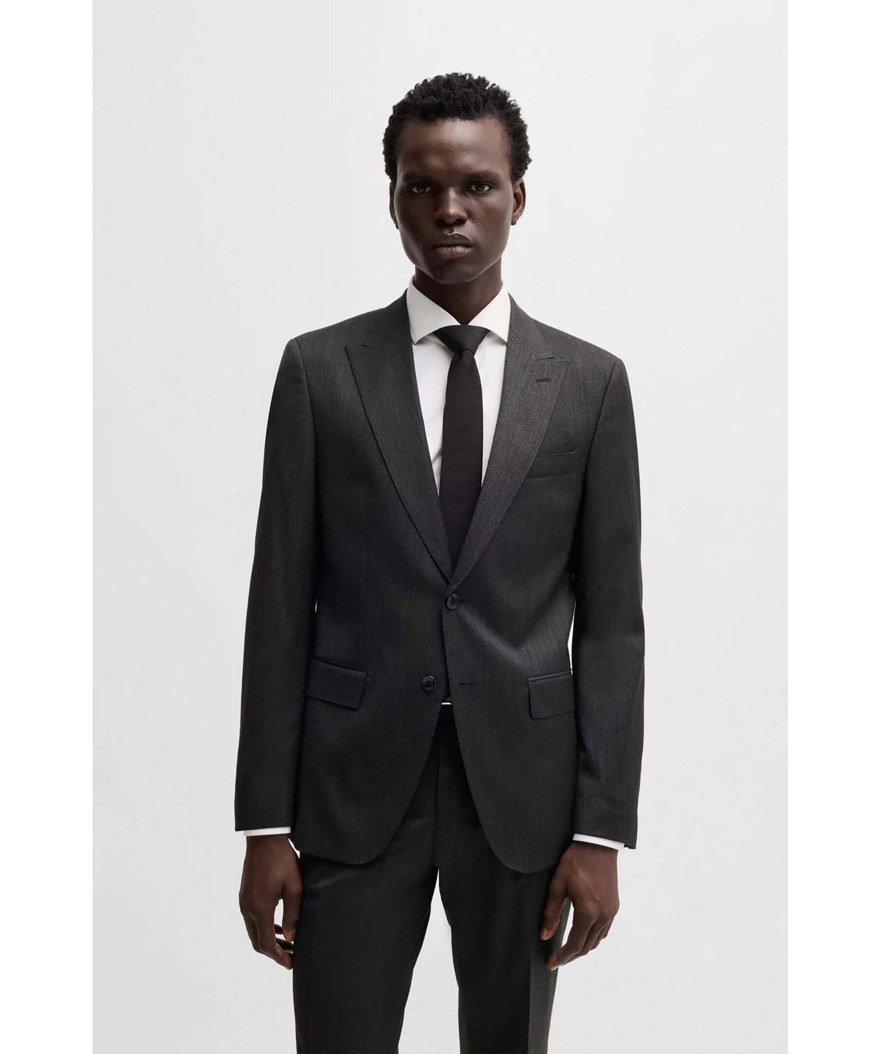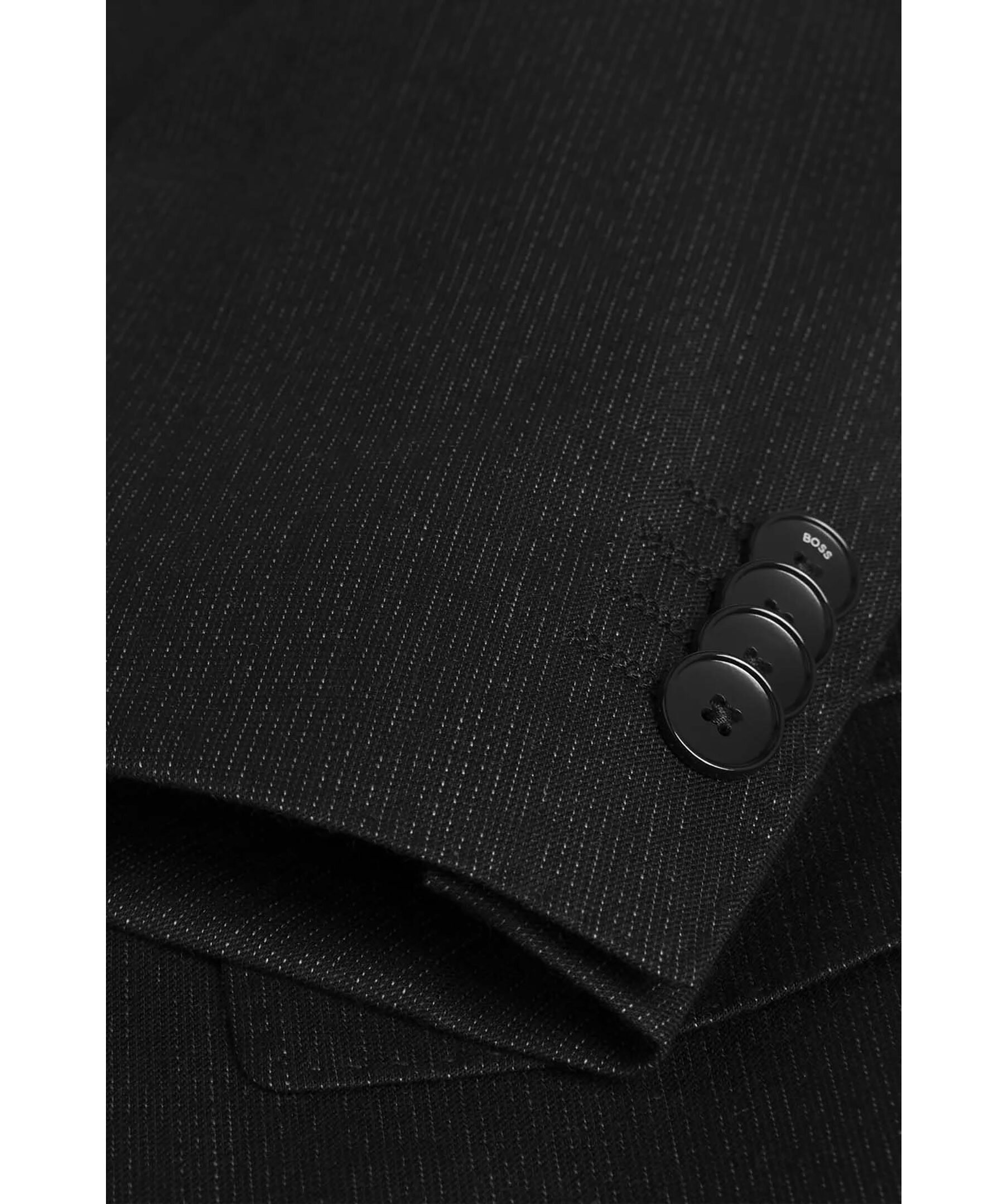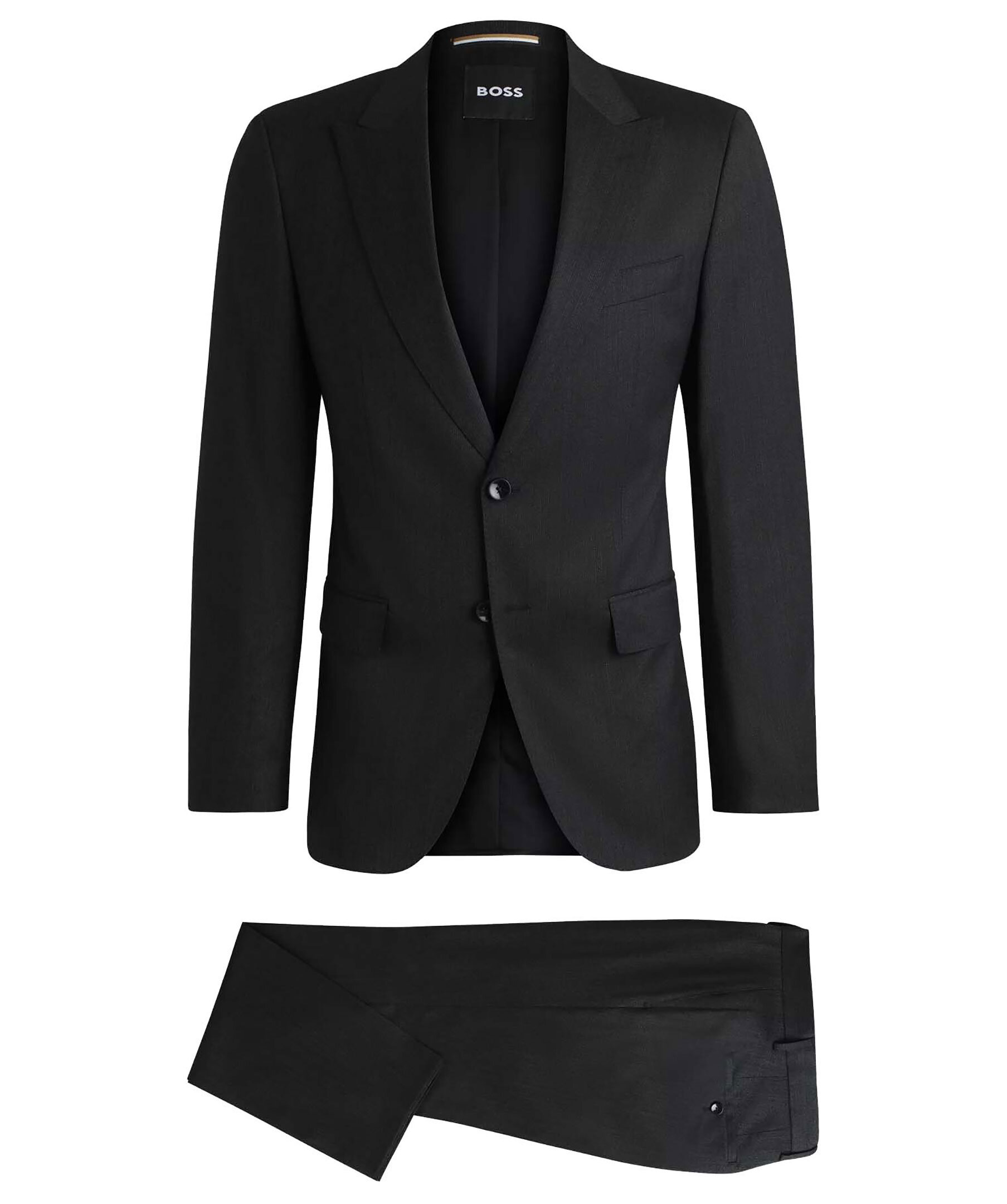 Svart kostymset från Boss Black. Kostymen är vävd med ett micromönster i stretch. Kavajen stängs med knappar, har två fickor och en bröstficka. Byxorna har bälteshällor i midjan, två sidfickor samt två passpoalfickor med knapp. Tillverkad i en ullblandning.