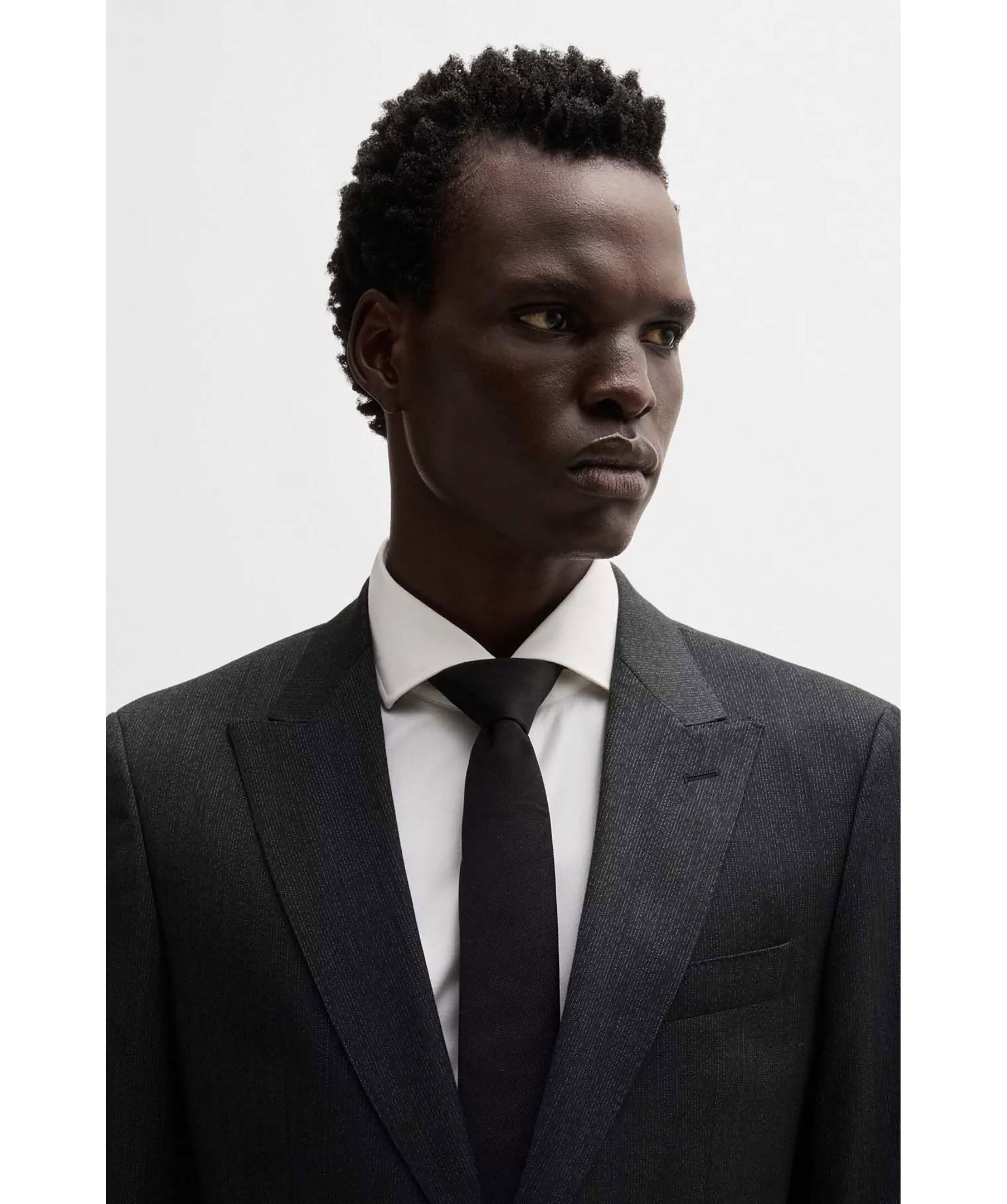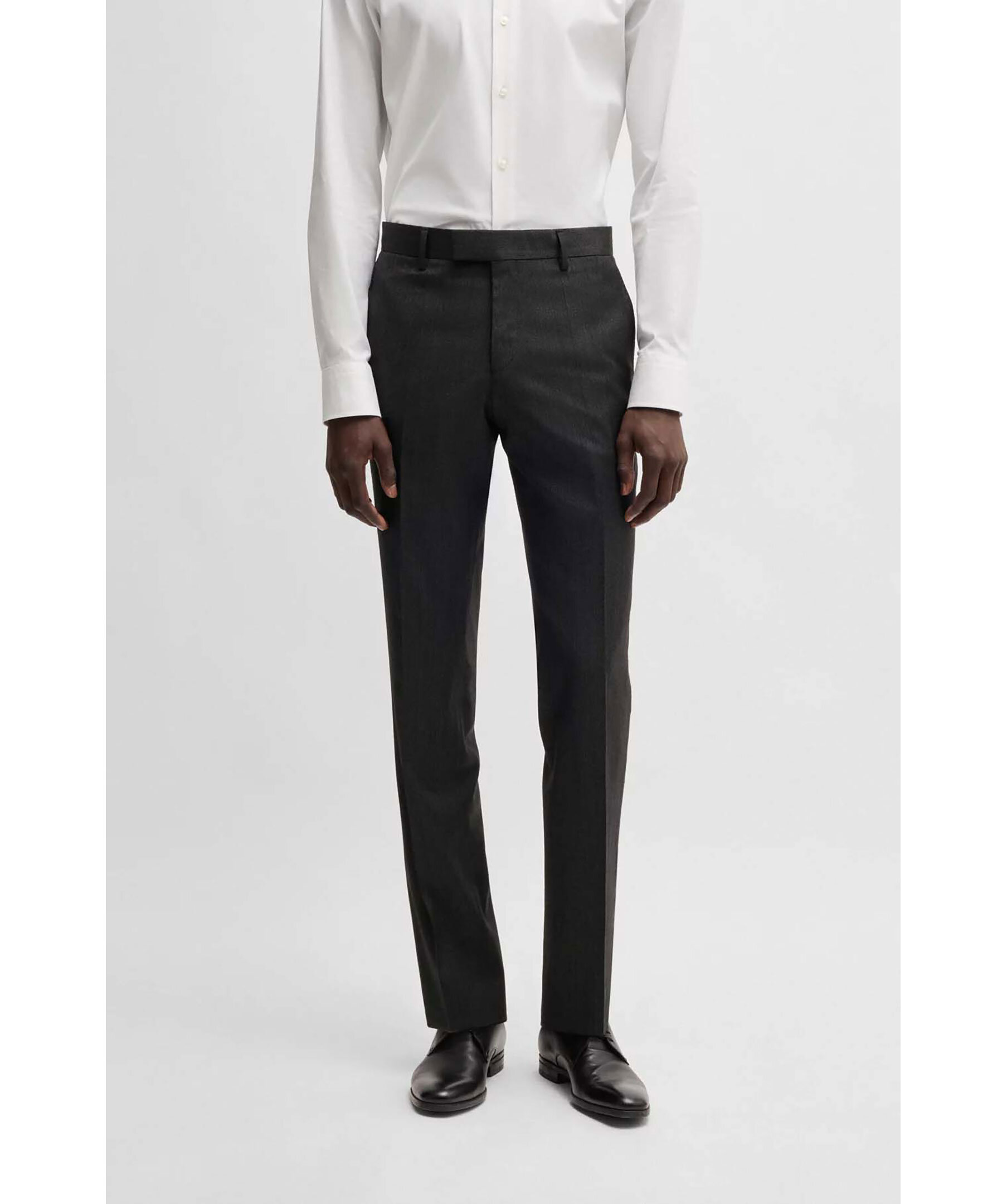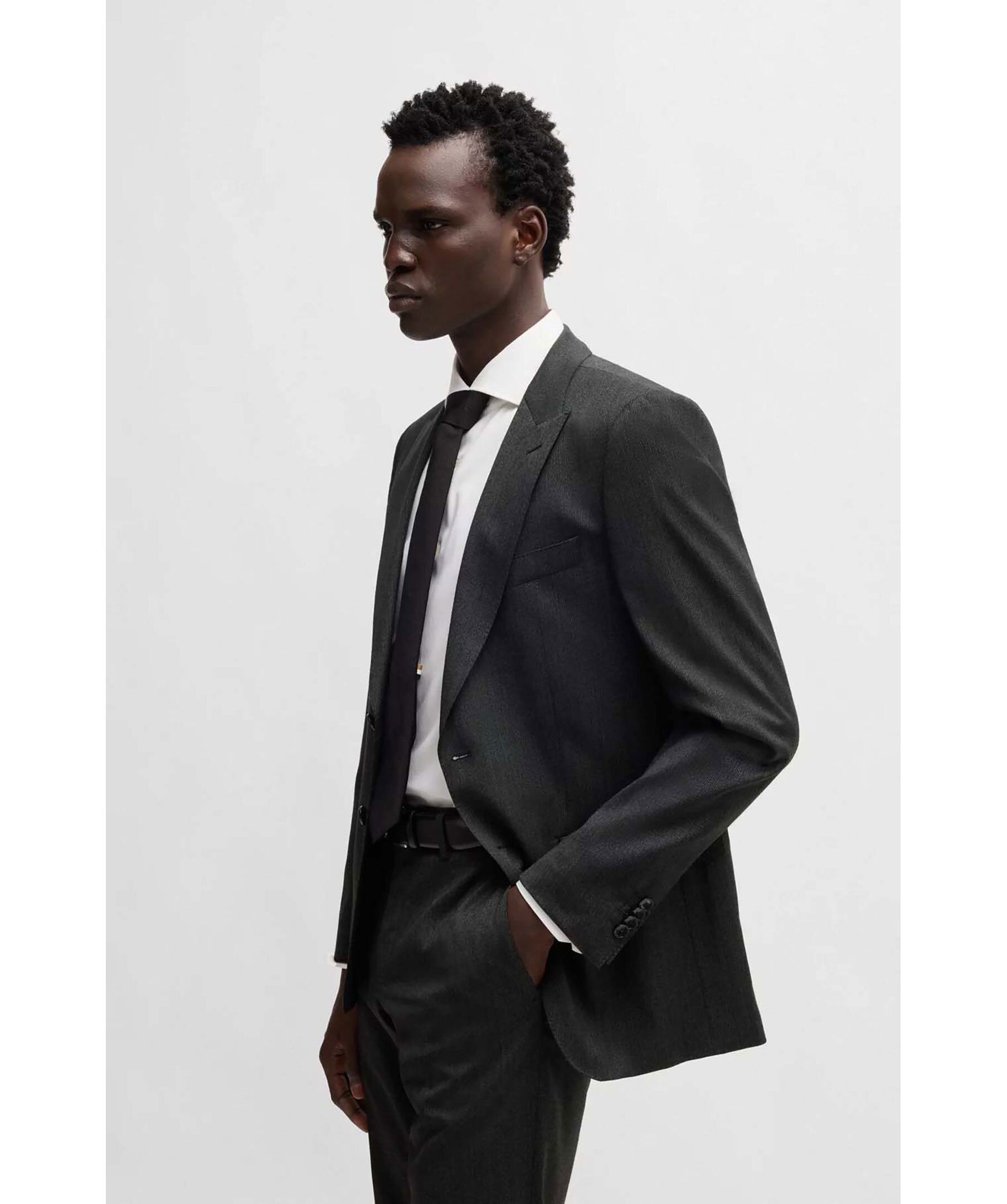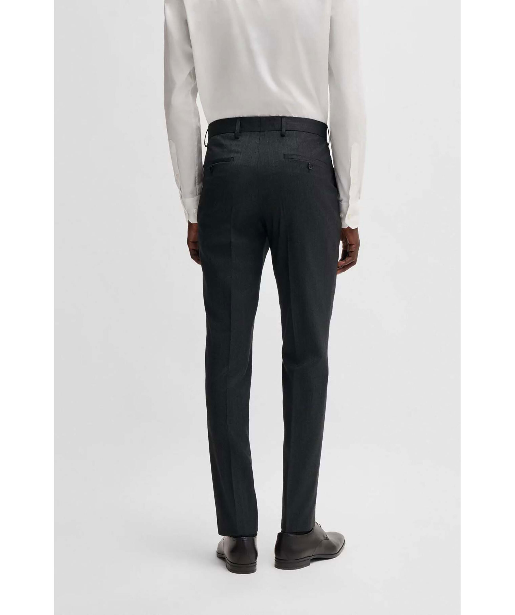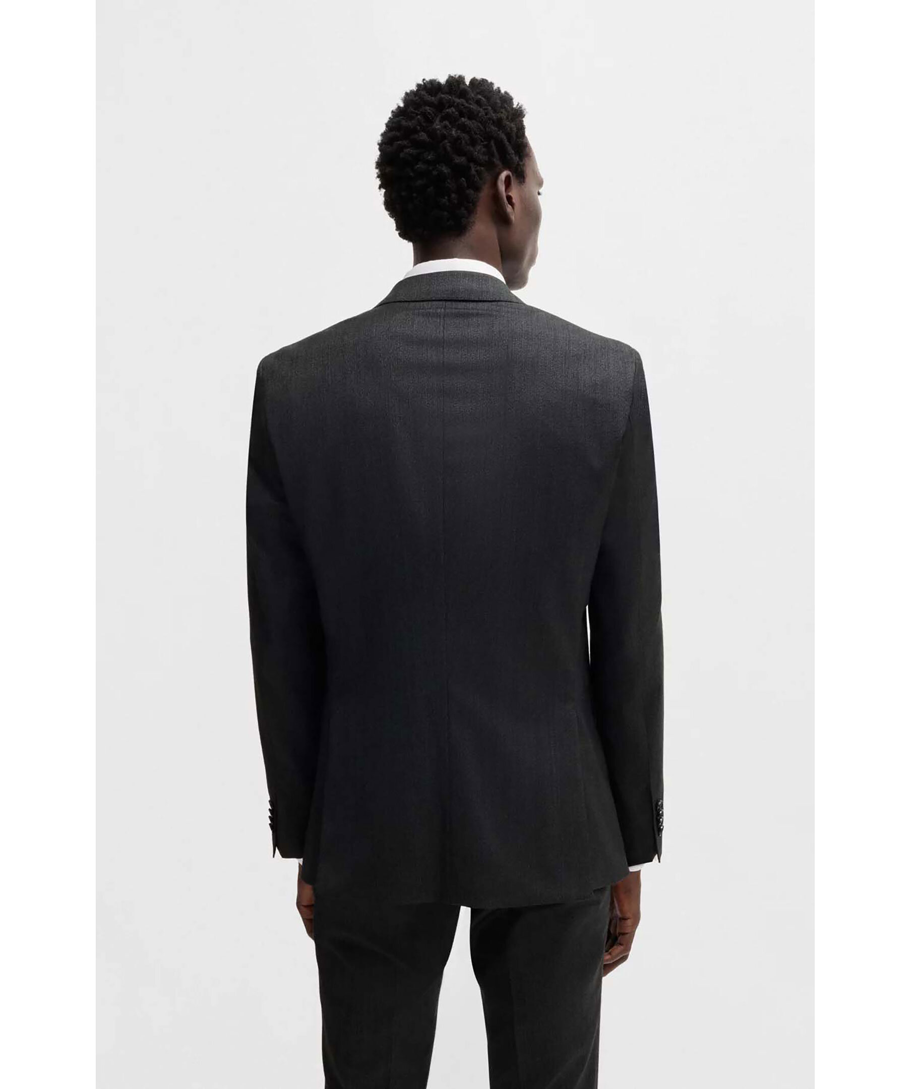 Svart kostymset från Boss Black. Kostymen är vävd med ett micromönster i stretch. Kavajen stängs med knappar, har två fickor och en bröstficka. Byxorna har bälteshällor i midjan, två sidfickor samt två passpoalfickor med knapp. Tillverkad i en ullblandning.