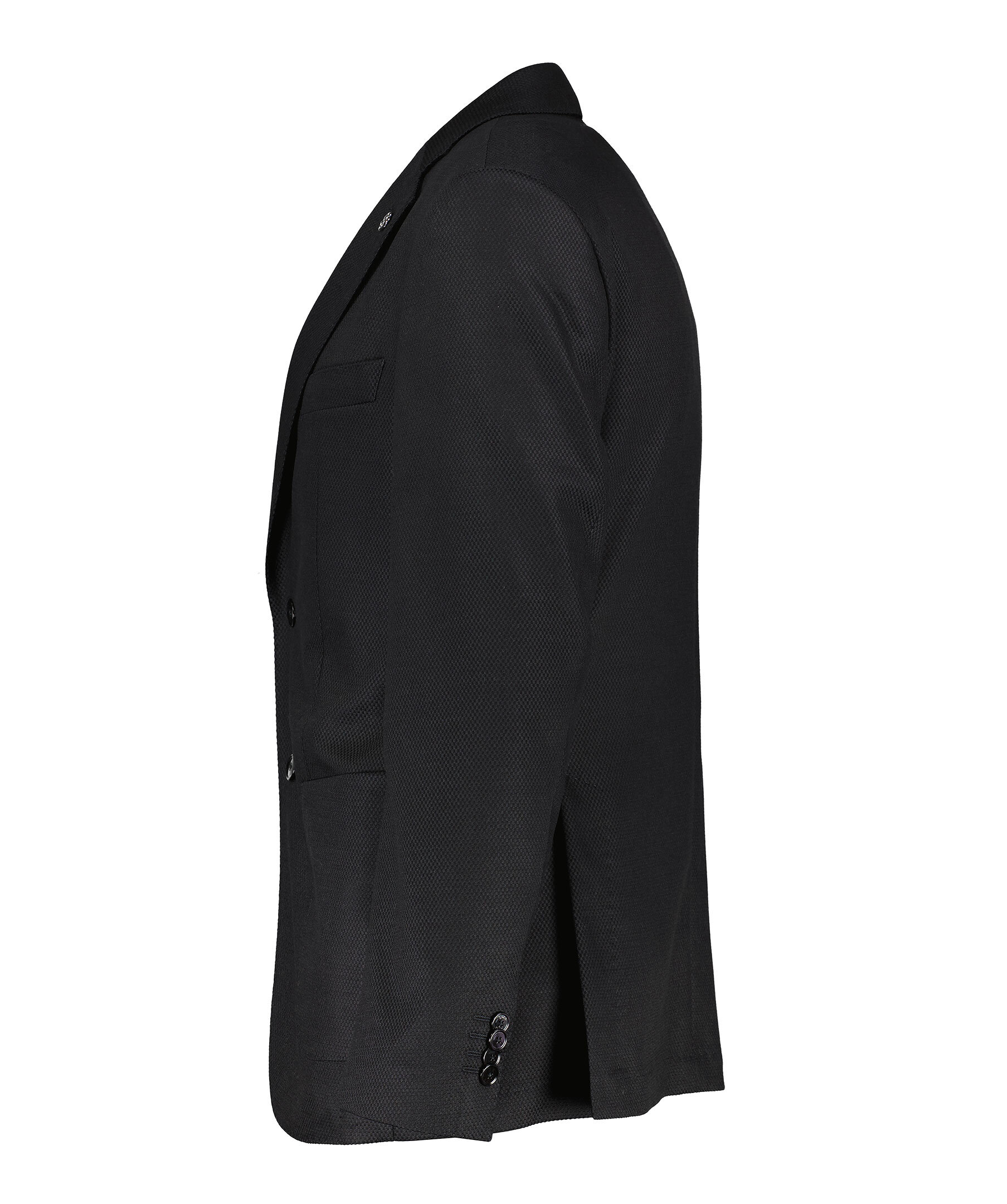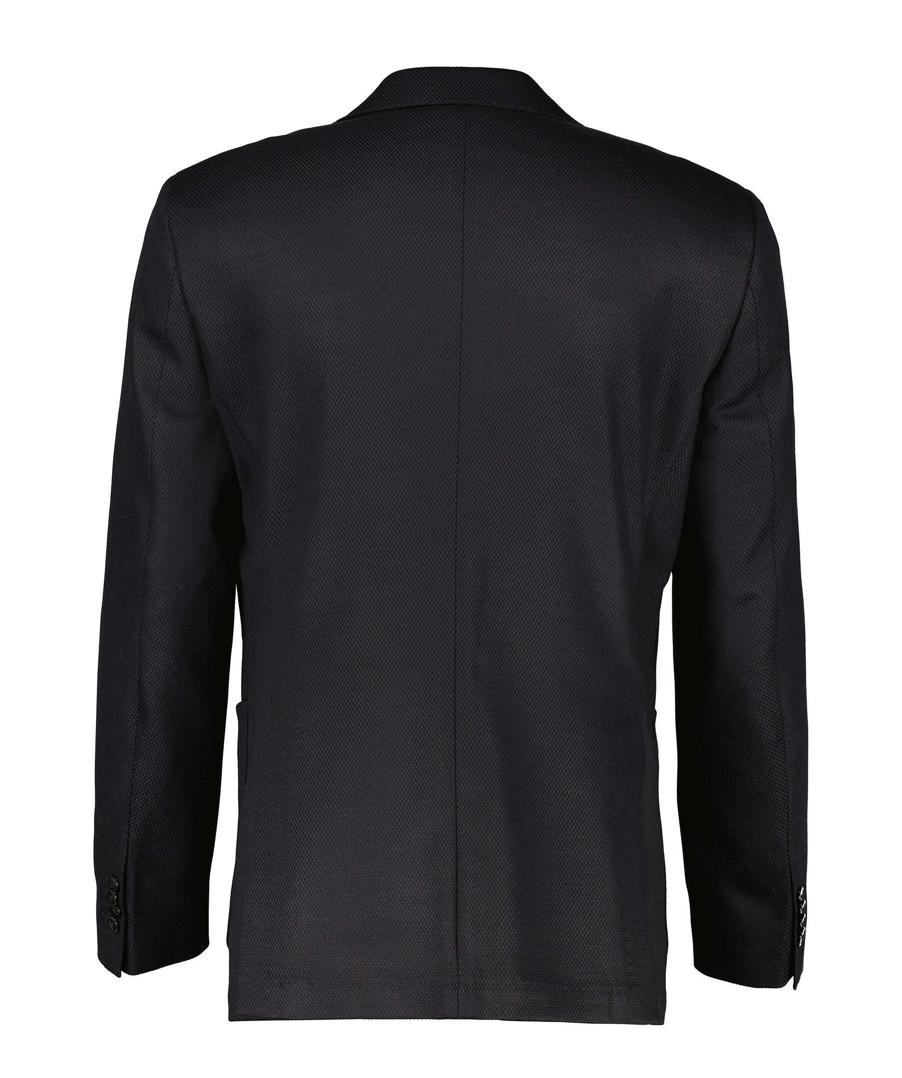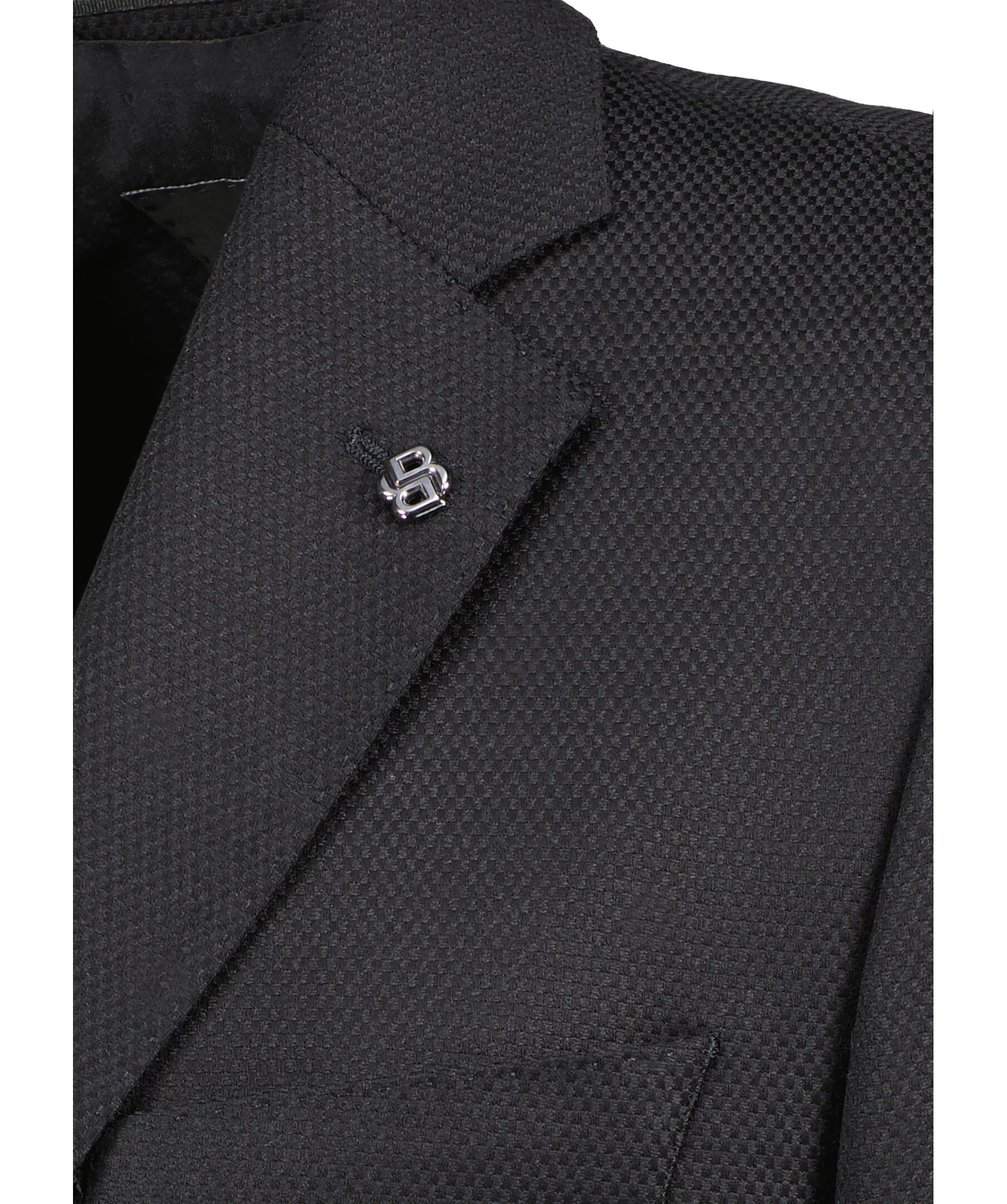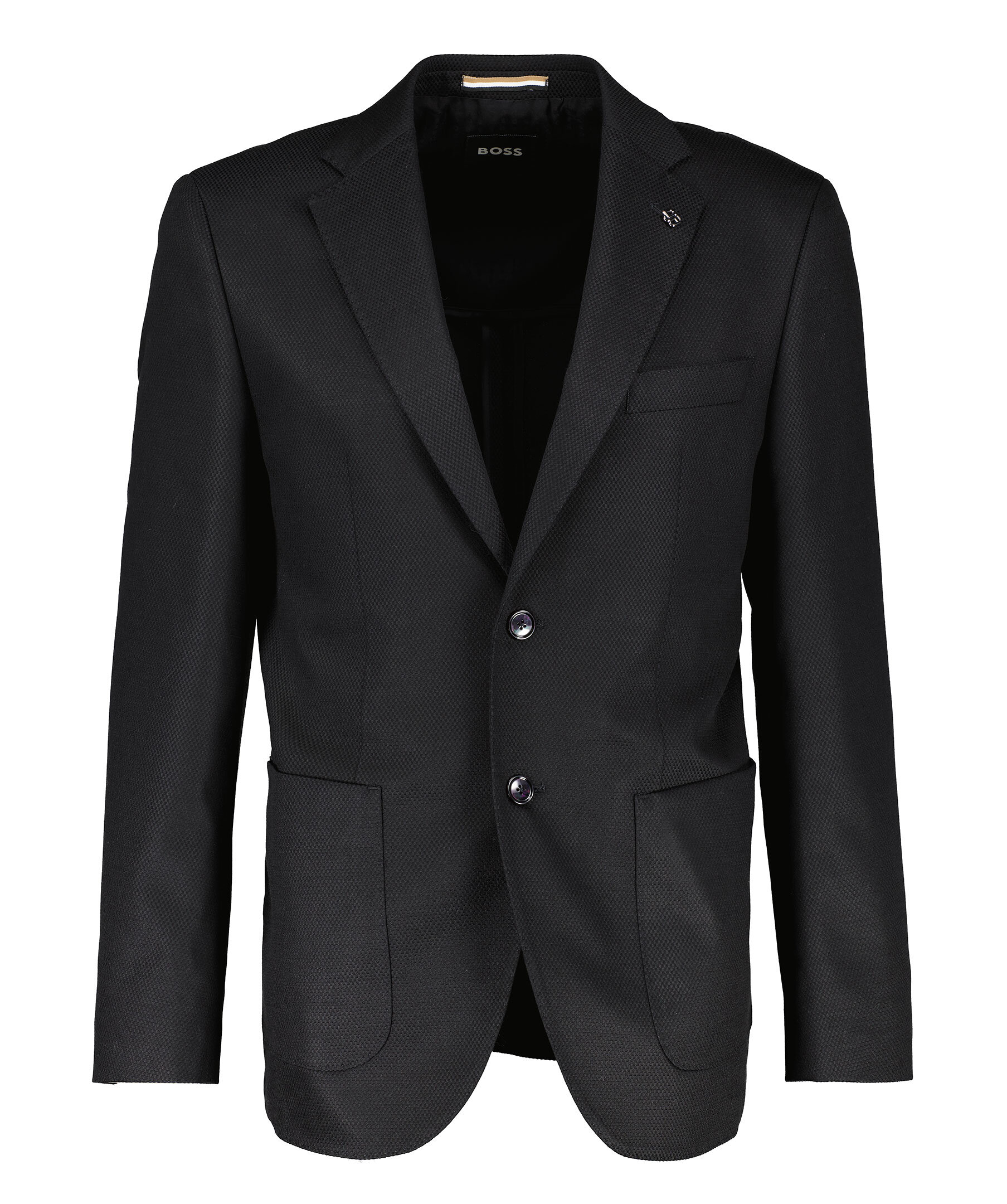 Svart kavaj från BOSS Black. Kavajen har ett subtilt mönster och är enkelknäppt, samt har två påsydda fickor och en bröstficka. Liten metall-logotyp. Tillverkad i en ullblandning.