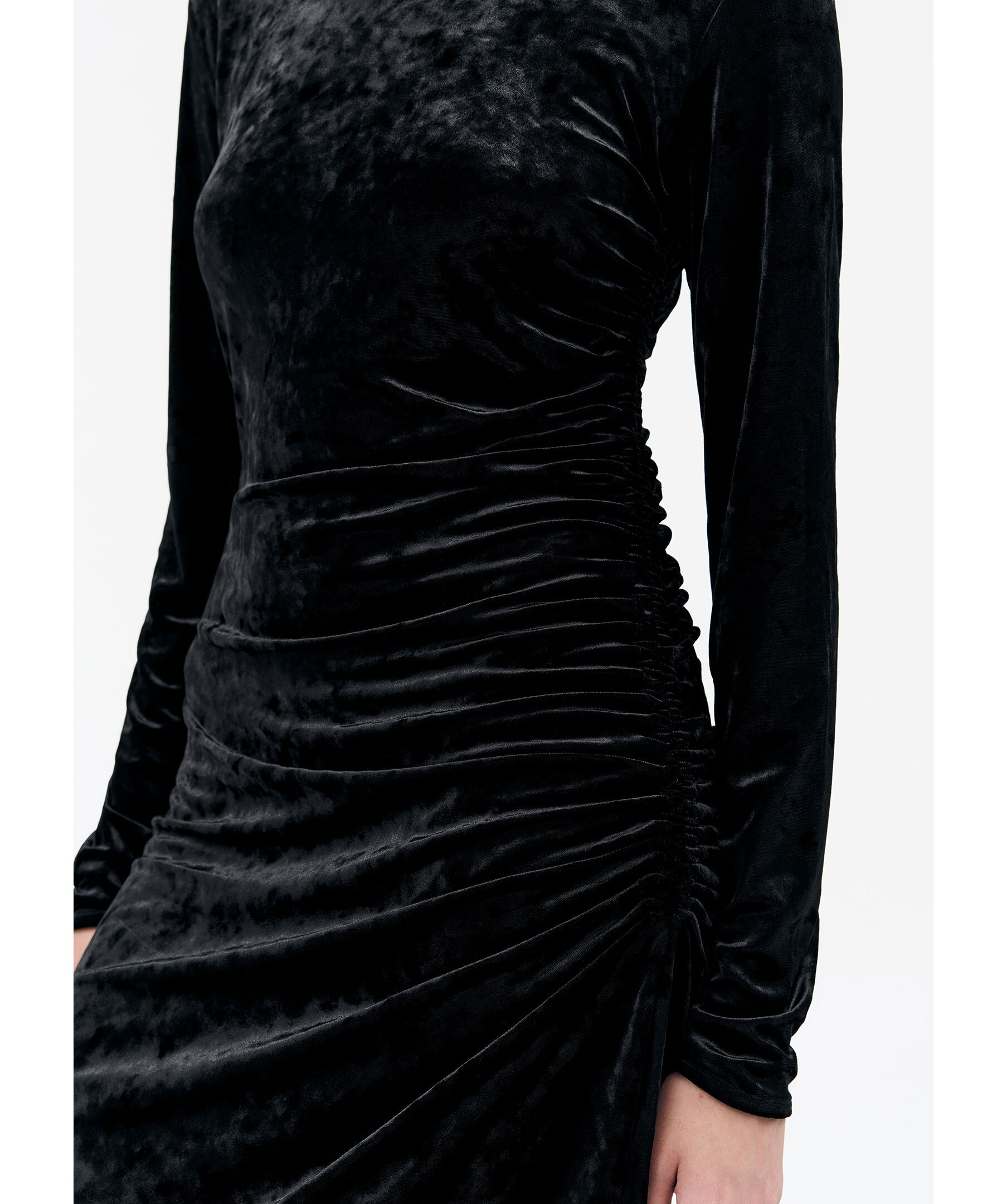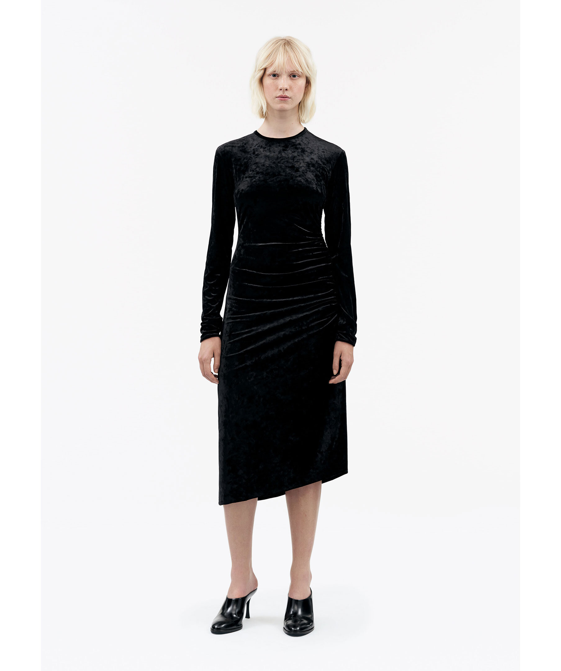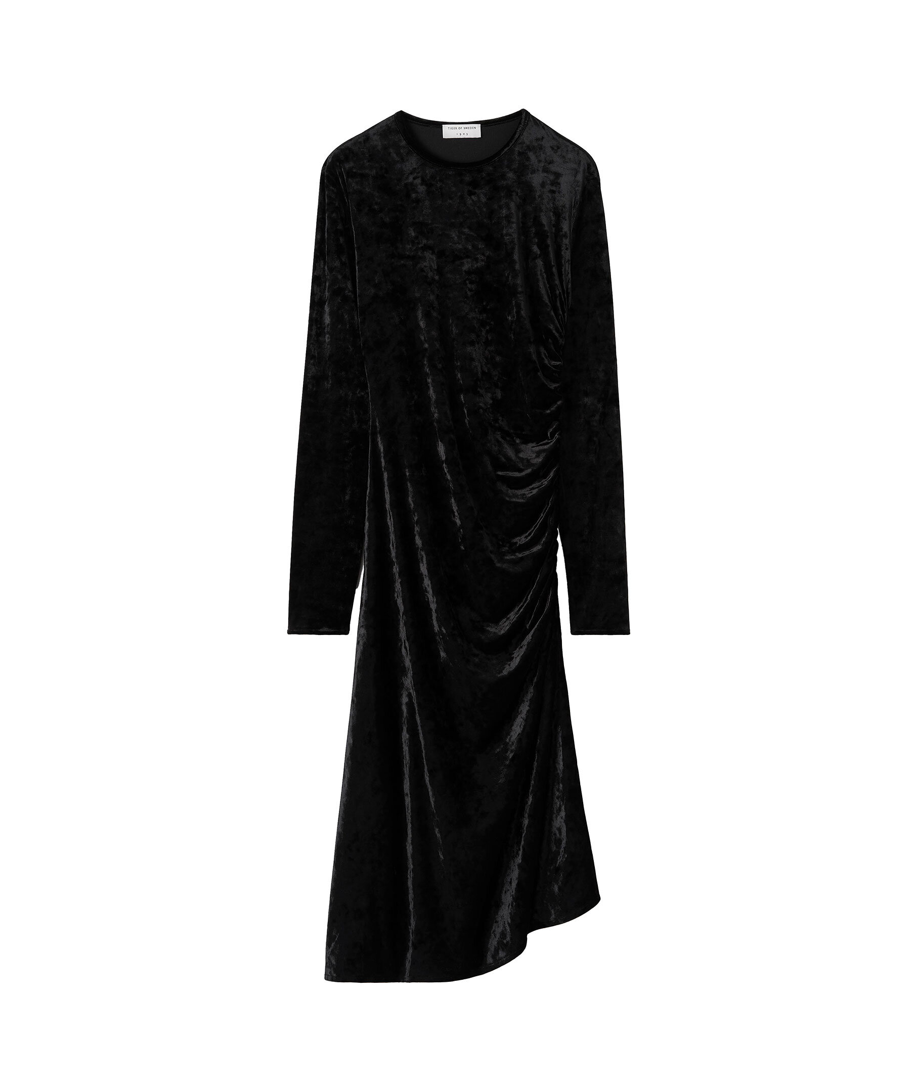 Svart slim Fit klänning i draperad sammet från Tiger of Sweden. Smal passform, längd till mitten av vaden och rund halsringning. Rynkad sidsöm som skapar en draperad effekt framtill.